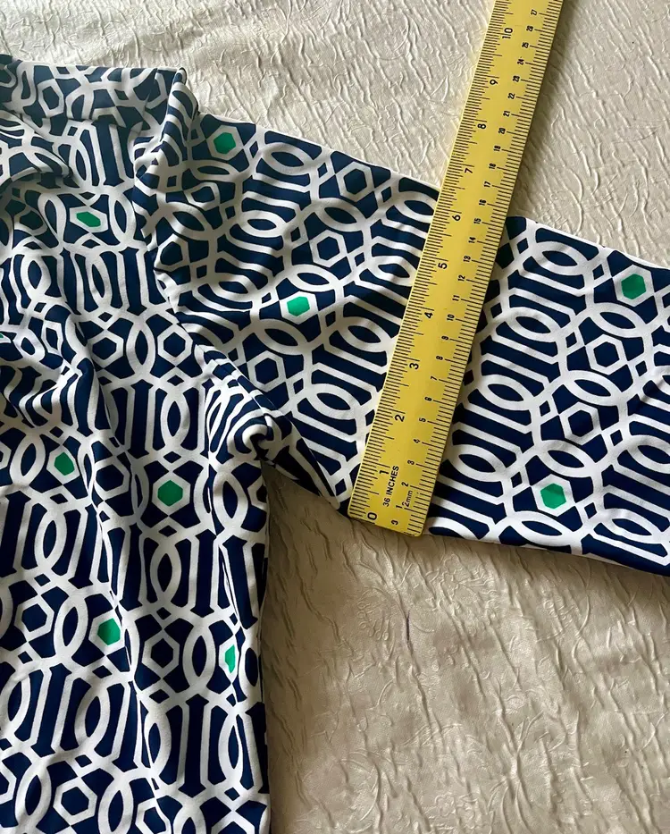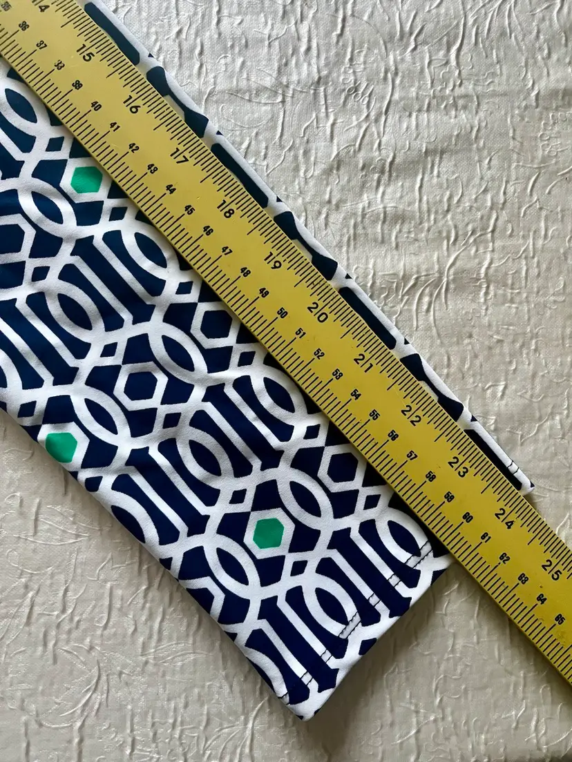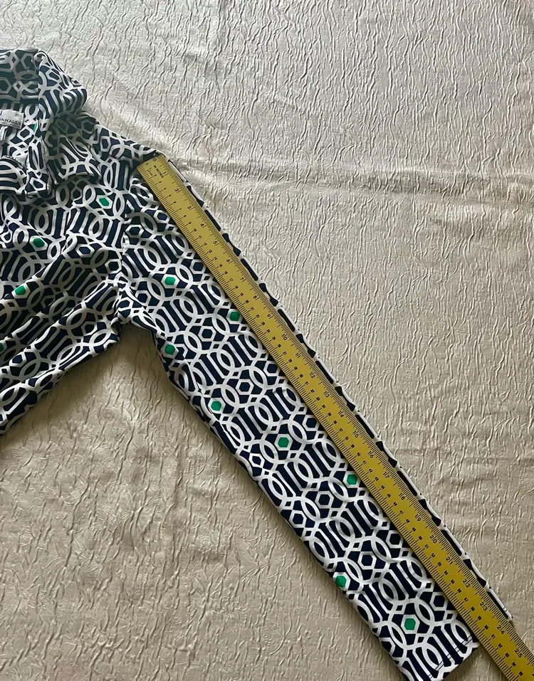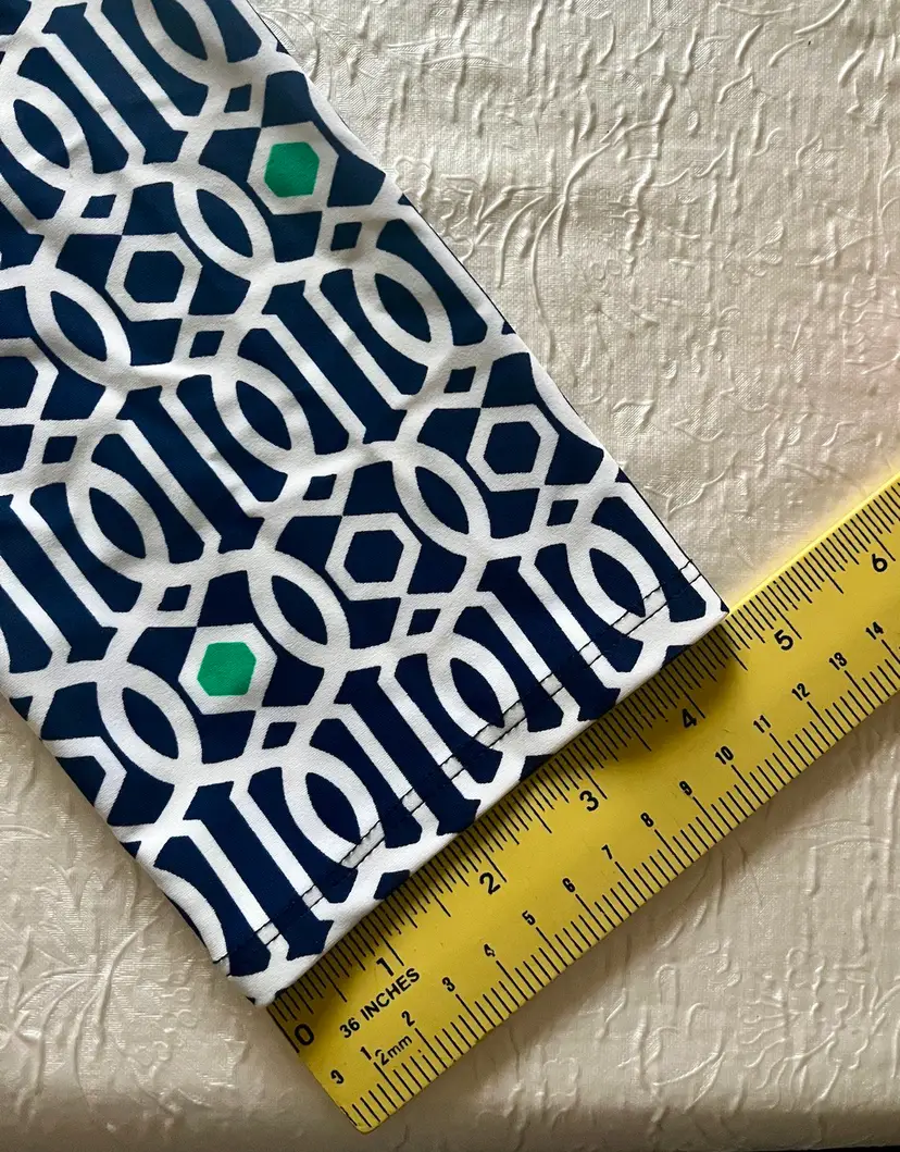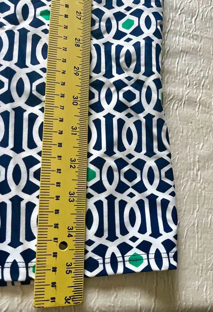 This Jude Connally shift dress is perfect for any occasion, whether you're traveling, in business mode, or out for a casual day. The dress features a beautiful geometric chain pattern in dark blue and white with accents of green and a comfortable covered buttoned front moving into a V-neckline and long sleeves. The dress is made of a combination of nylon and spandex, making it so incredibly soft, stretchy, packable, and non-wrinkle.