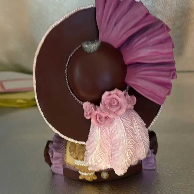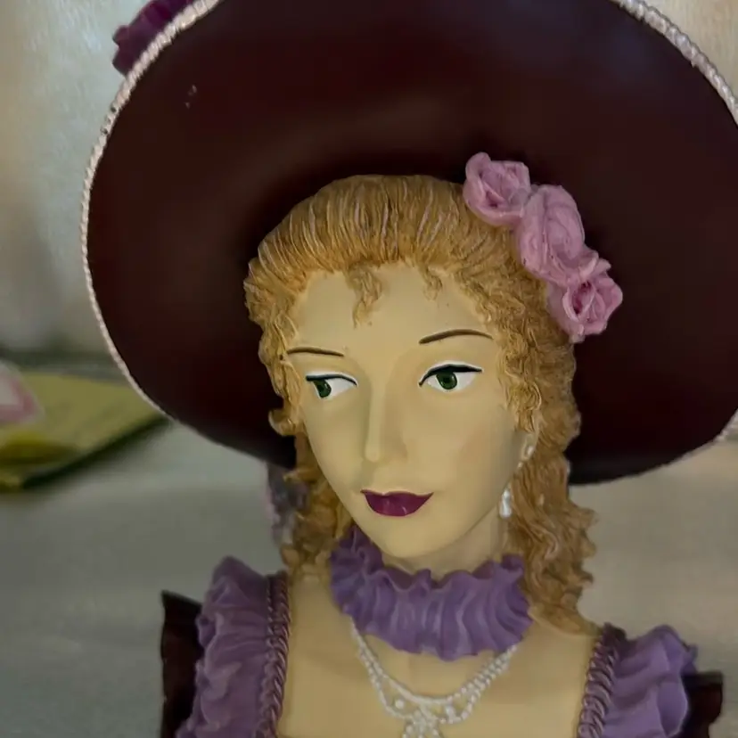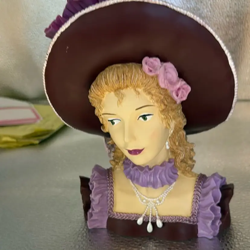 Judith is hard to find research on. She’s gorgeous she is a head bust. She is absolutely gorgeous and would display a rose or other flower in the back. She has no imperfections!! She’s beautiful with all her purple accents. She has pearls hanging down. She had purple flowers in her hair. She is amazing!