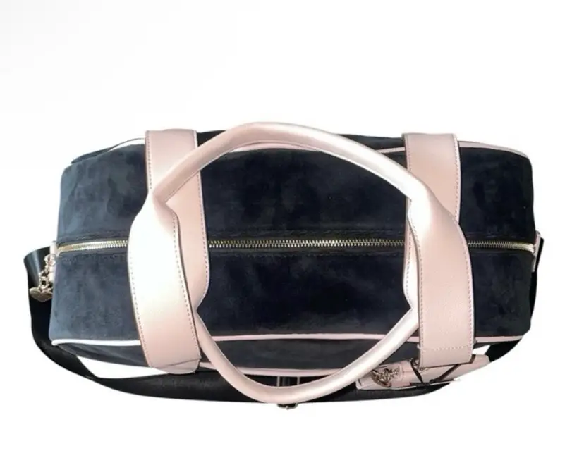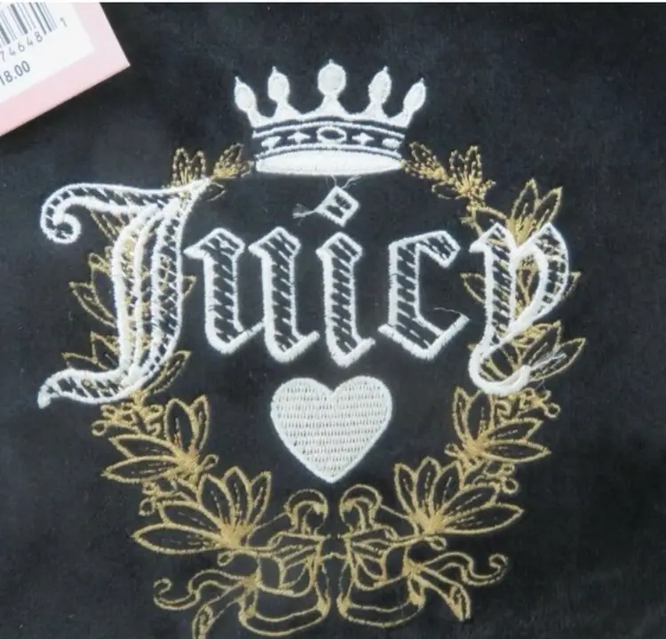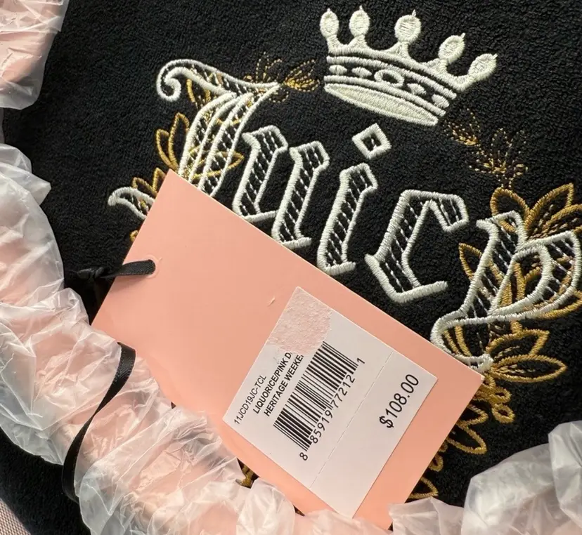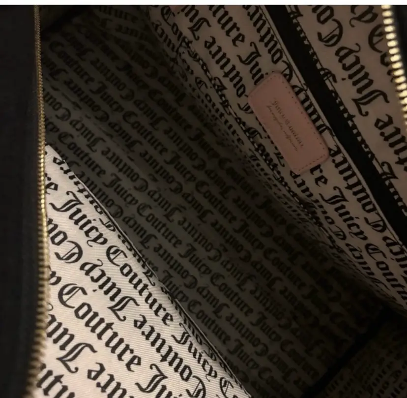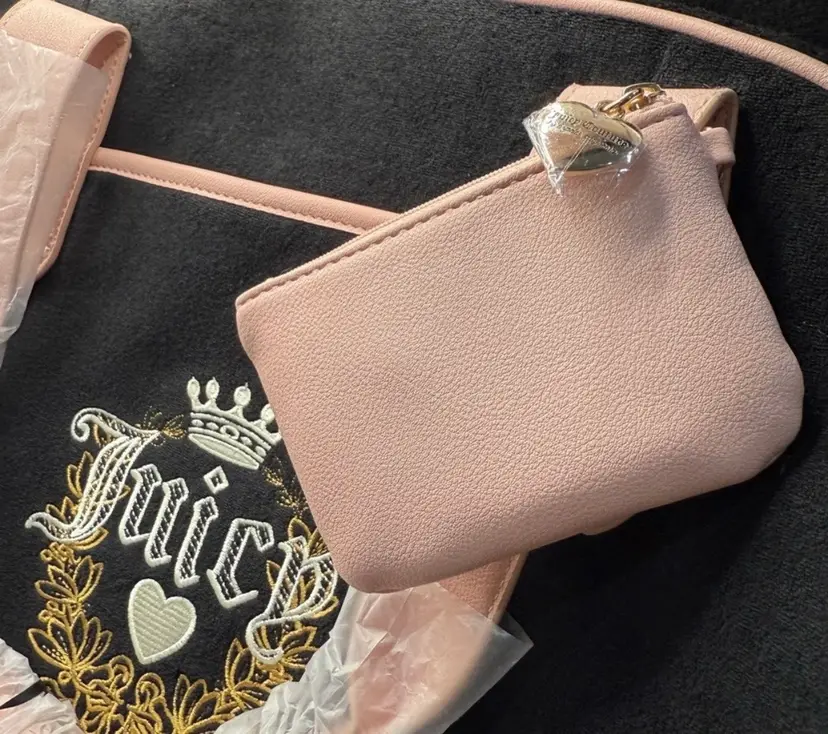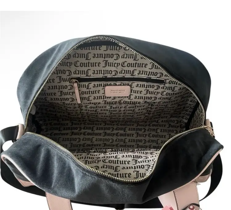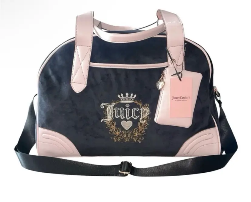 Elegant travel bag with Juicy Couture logo. Features black body with light pink accents. Ideal for stylish journeys. 18x13x6 approximately. Adjustable long shoulder strap and also top handle. Included small pink coin card pouch.
