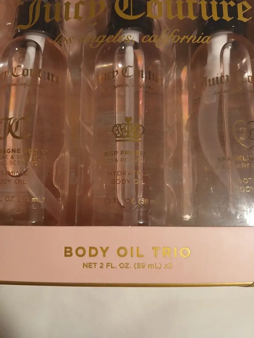 Juicy Couture Body Oil Trio – Los Angeles, California Collection. Includes three 2 fl. oz (59ml) body oils in luxurious scents: Champagne Coast (Vitamin E Body Oil), Crisp Prosecco (Hydrating Body Oil), and Sparkling Rosé (Smoothing Body Oil). Perfect for daily hydration with a touch of glow. Brand new, sealed in box, gift-ready with Juicy Couture ribbon. A great addition to your body care routine or an ideal gift set for any Juicy Couture fan.