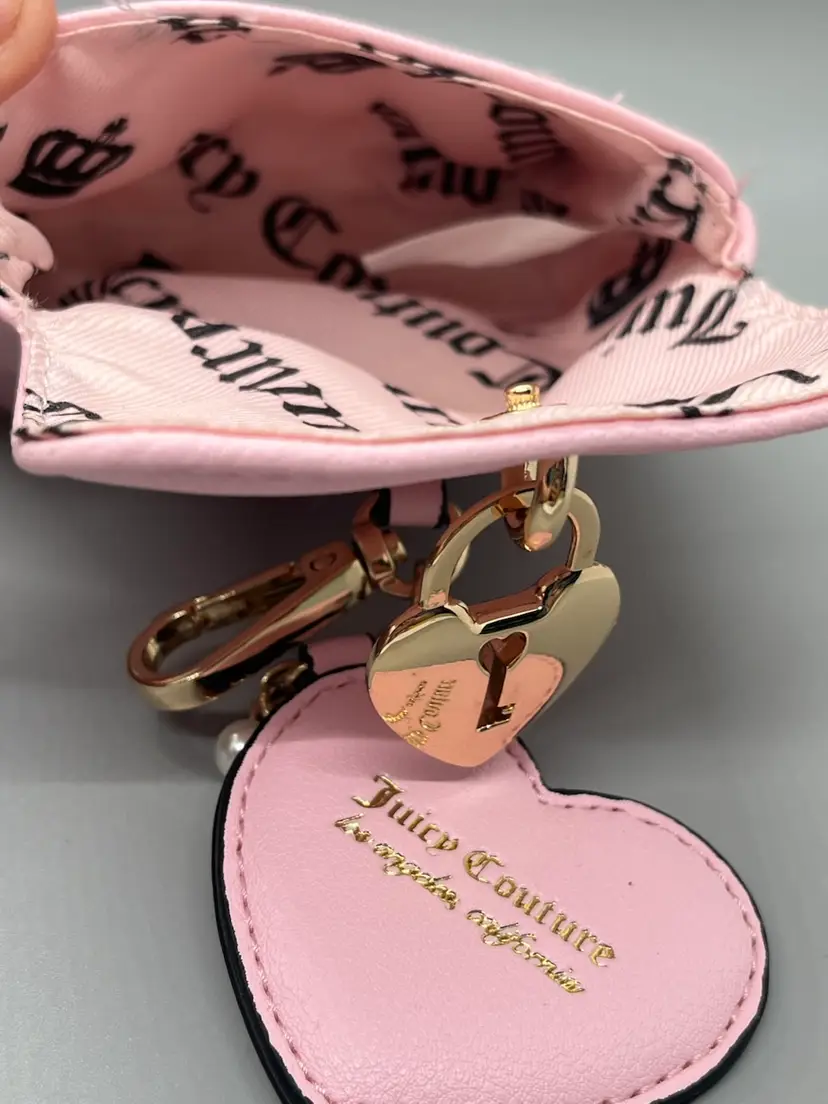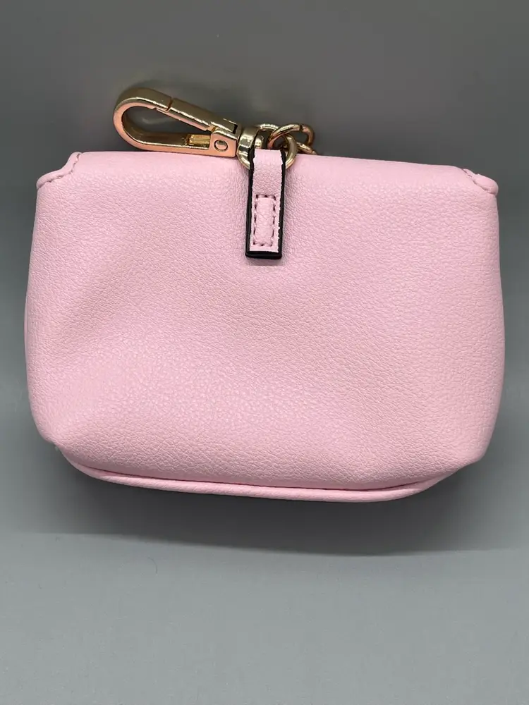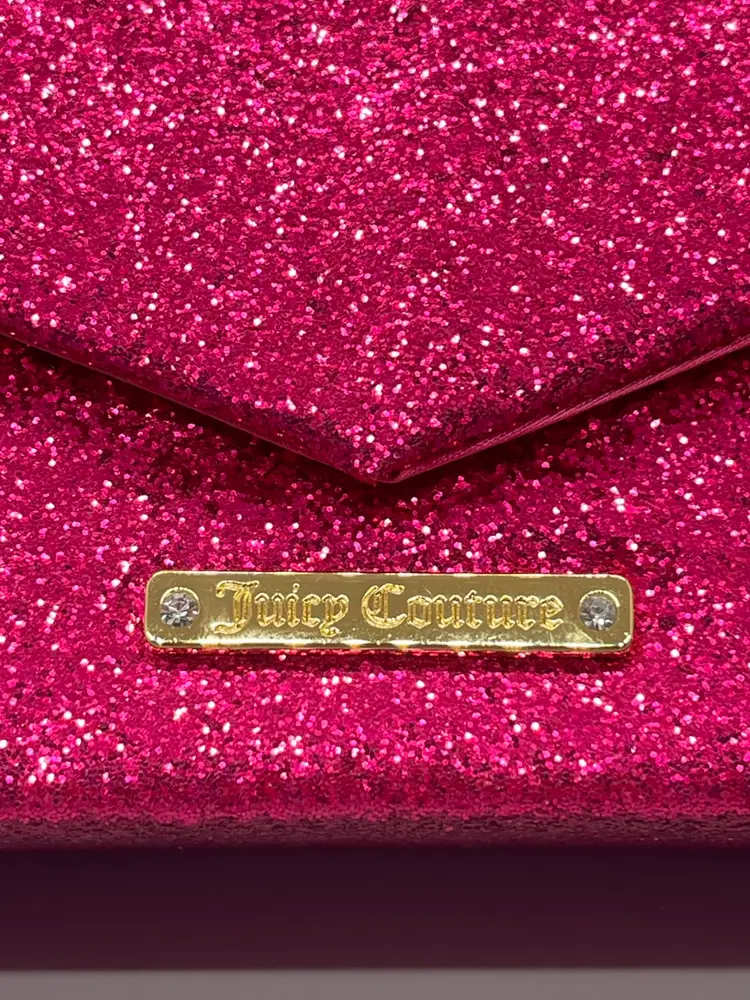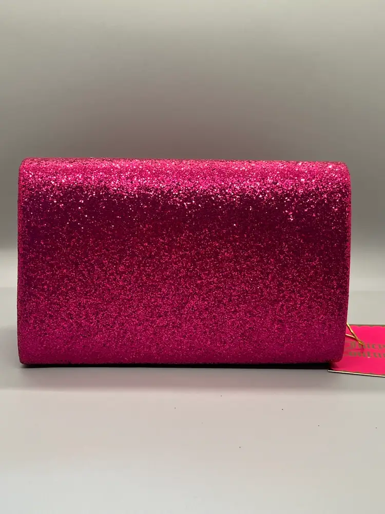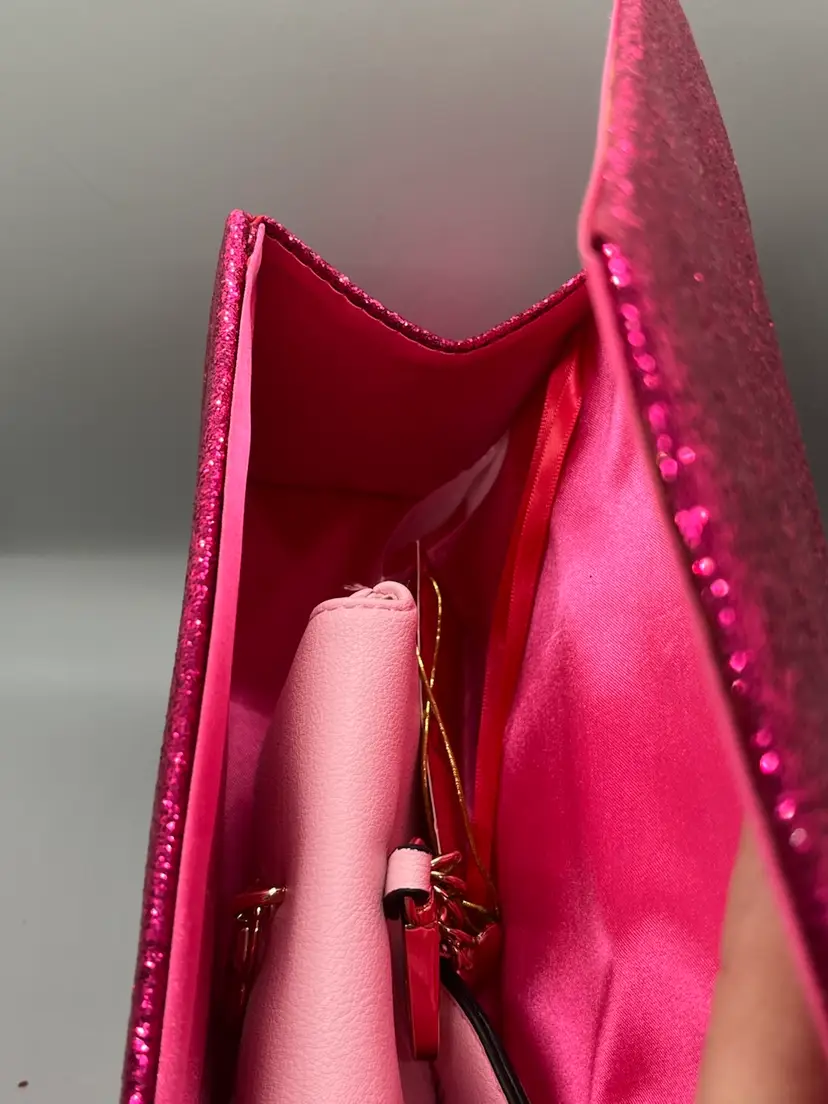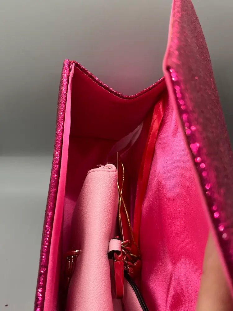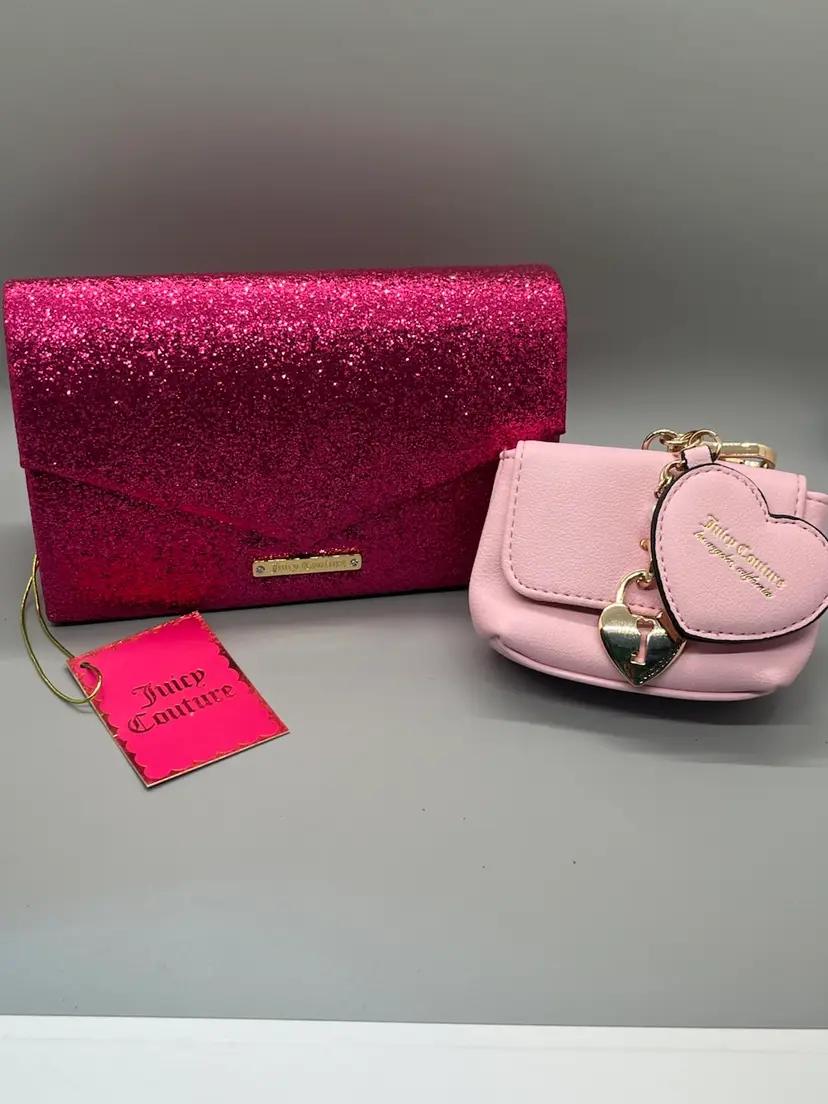 Hot pink glitter clutch and soft pink leather wallet with charm. Perfect for Valentines Day.