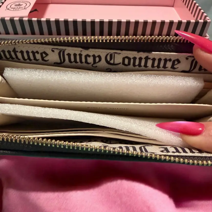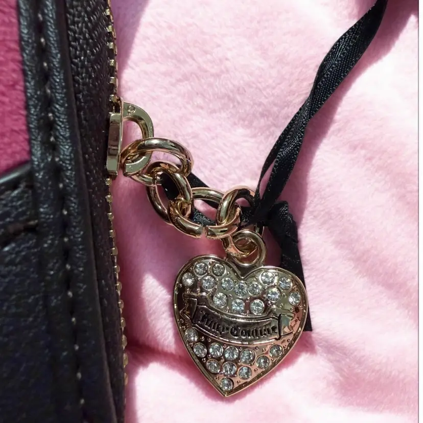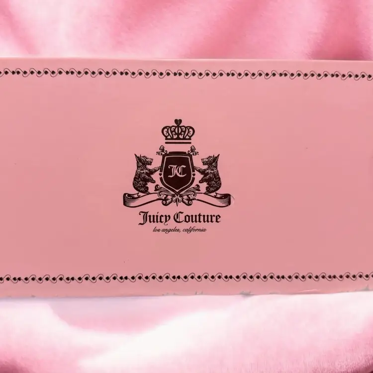 Juicy Couture Heritage Raspberry Tart Large Zip Around Wallet, It features a vibrant raspberry pink velour front detailed with a crown and crest embroidery, accented by subtle rhinestones. The base and corners are made from dark brown faux leather.