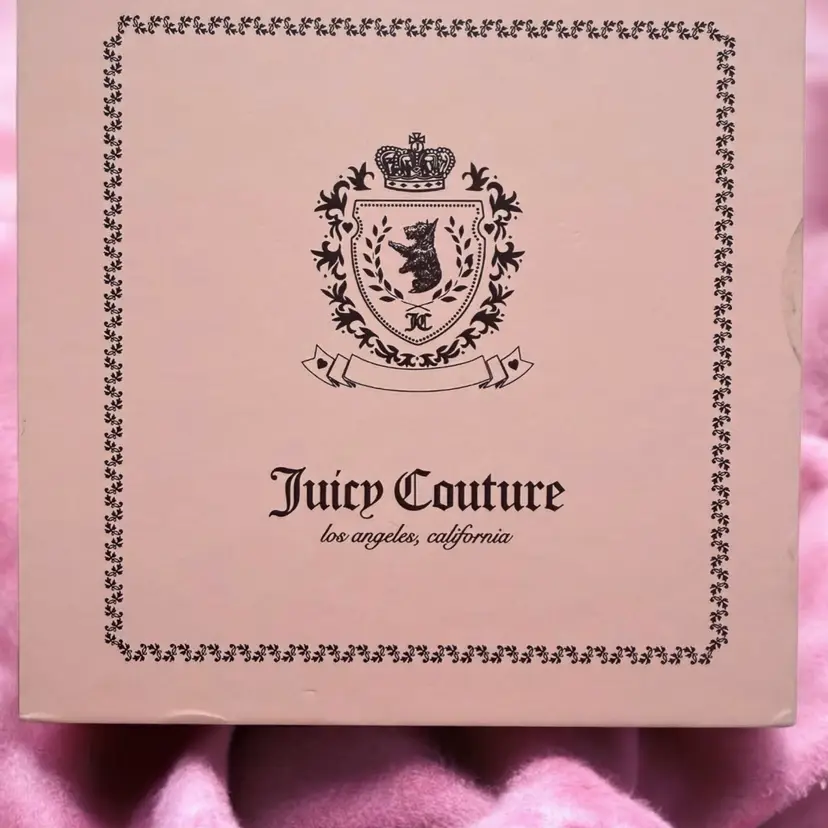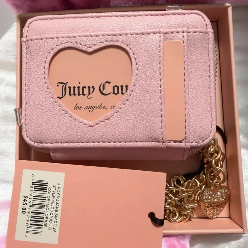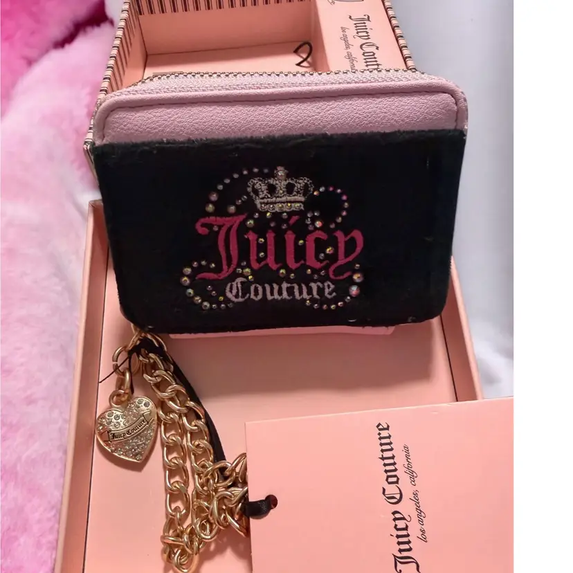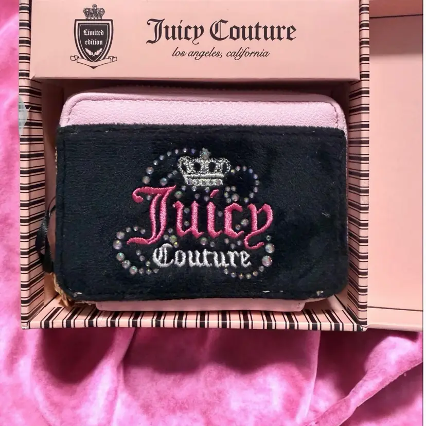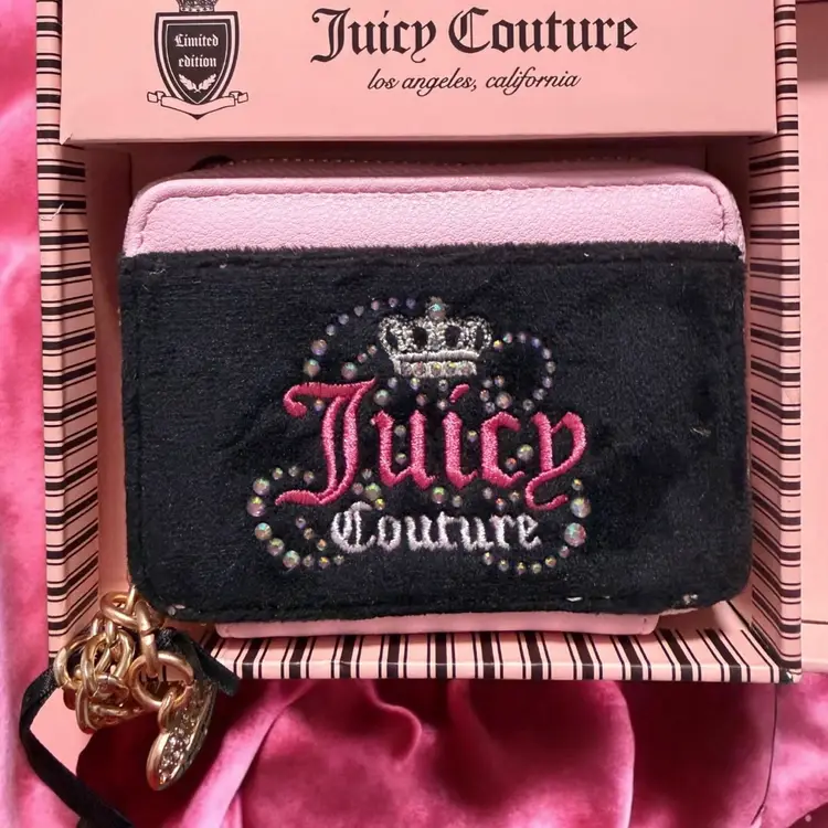Juicy Couture Velour Zip-Around Card Case in black and pink. This limited-edition accessory features a signature black velour front panel with an embroidered "Juicy Couture" logo and a sparkling rhinestone-embellished crown. Product Features