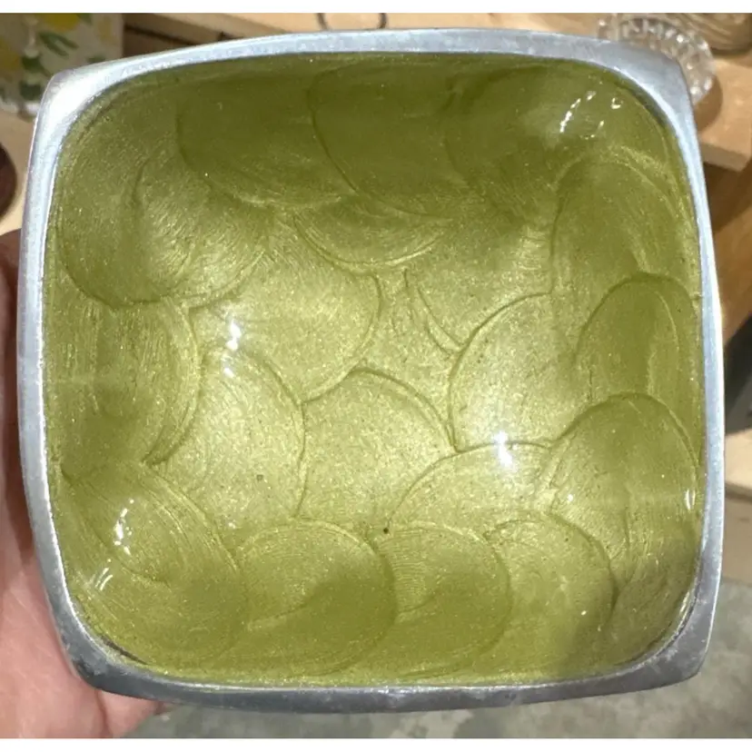 The Julia Knight Polished Aluminum Hand Painted Green Dipping Bowl is a beautifully crafted piece of metalware. Made from high-quality aluminum, this bowl features intricate hand-painted details in a vibrant green color. With dimensions of 3 5/8" x 3 7/8", this dipping bowl is perfect for serving snacks or desserts at any gathering or event. Its elegant design and unique craftsmanship make it a desirable collectible for those who appreciate fine aluminum pieces.