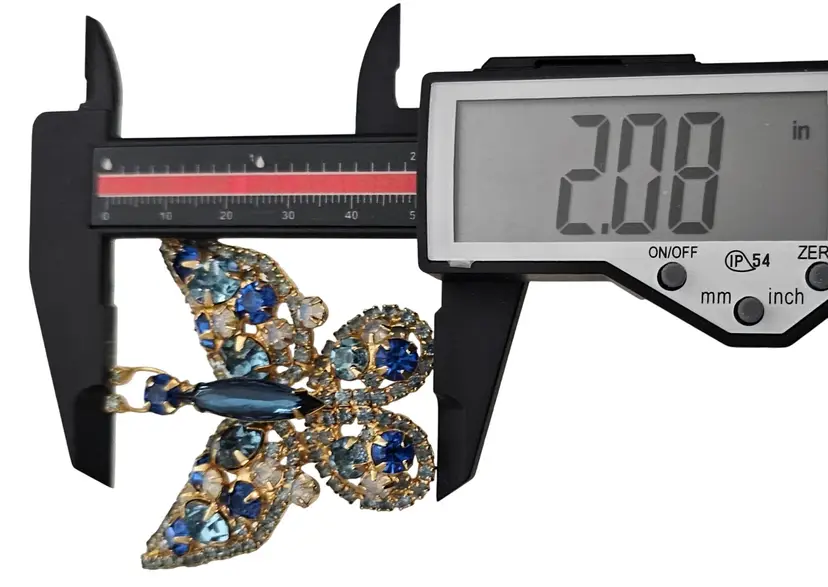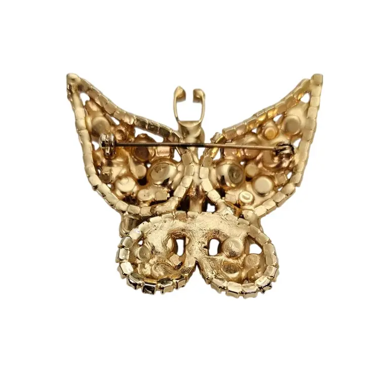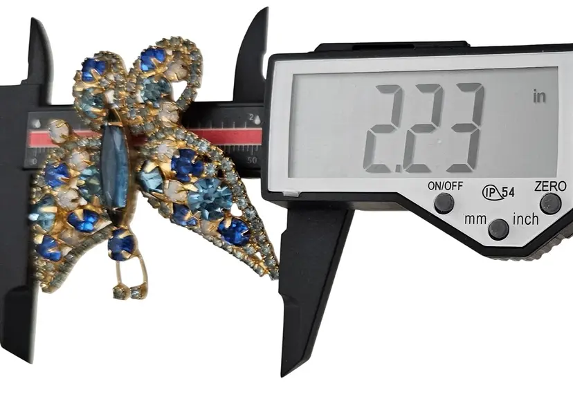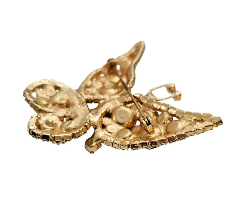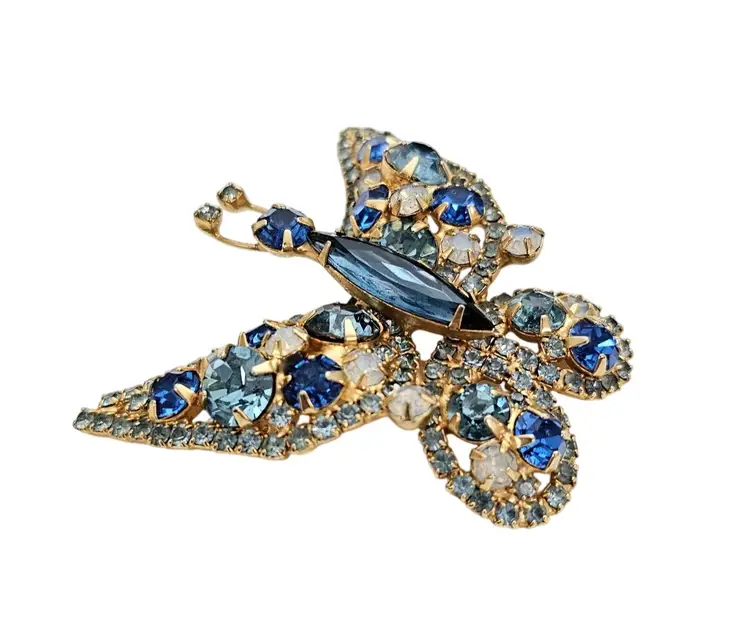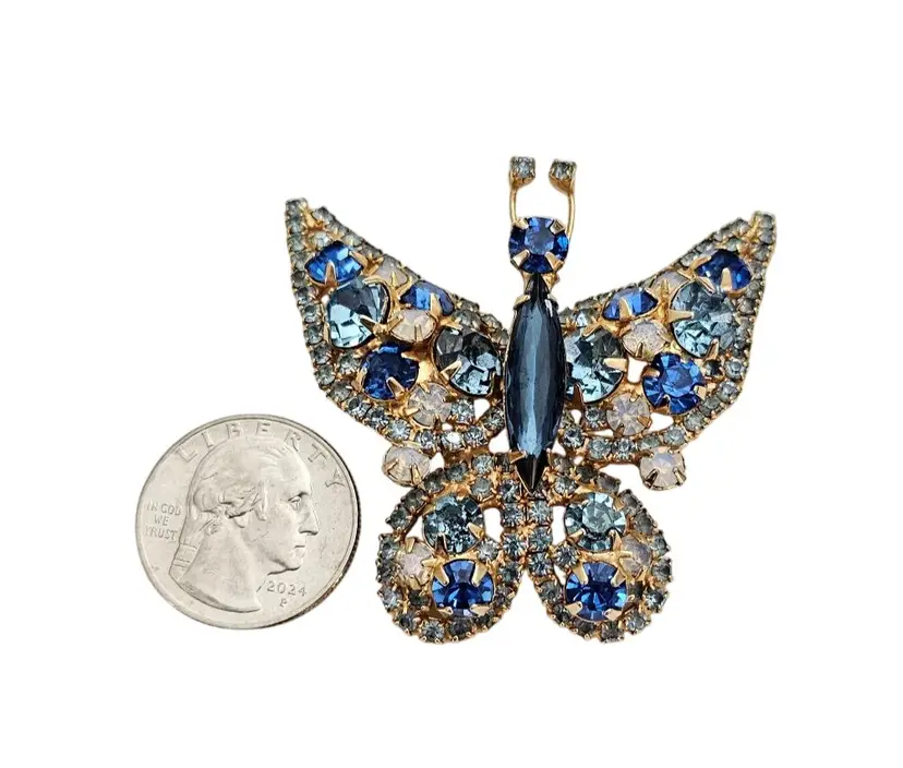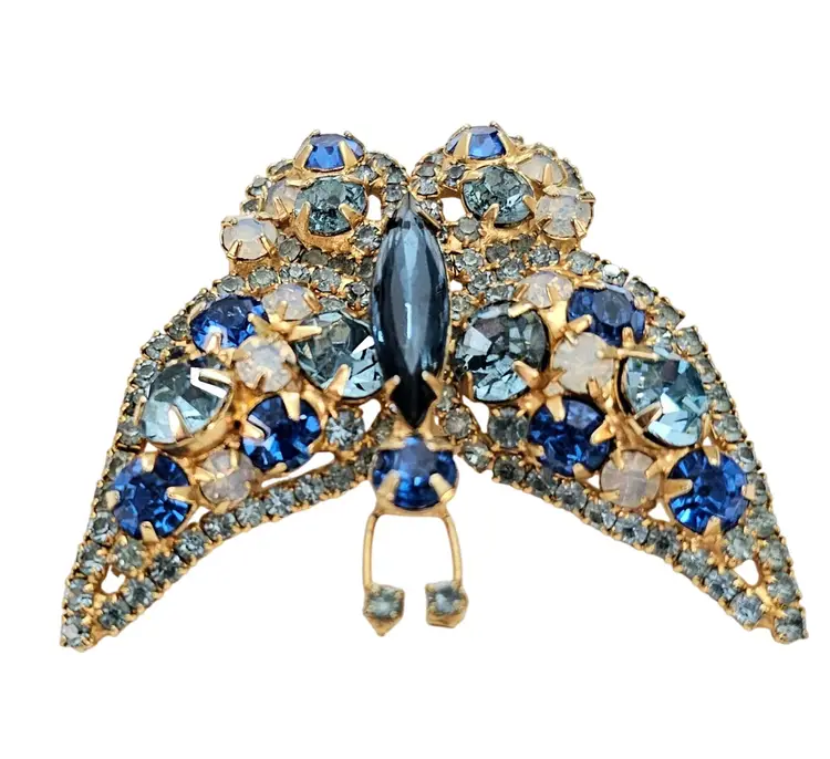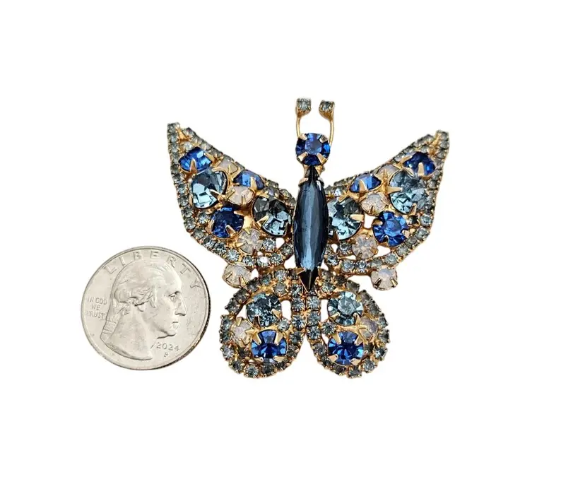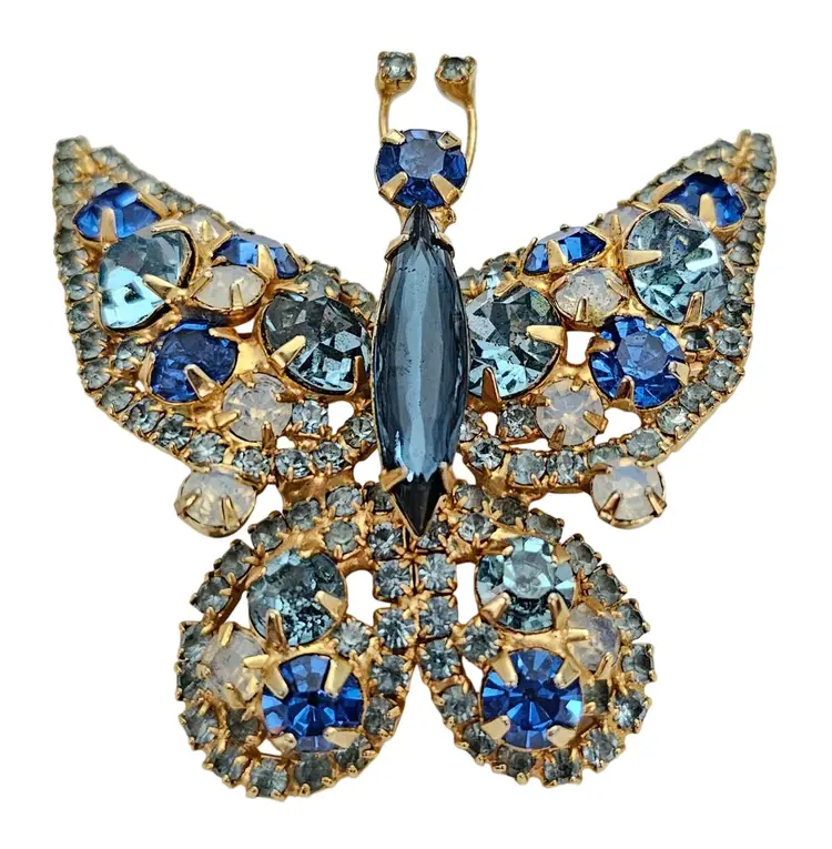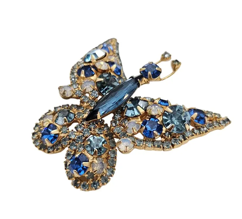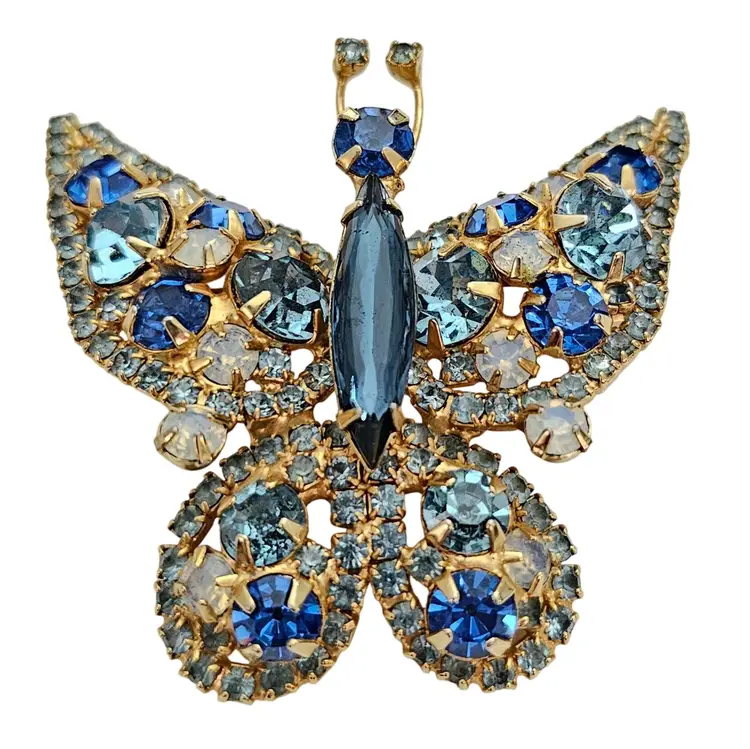 • Juliana Butterfly Brooch • Stunningly detailed butterfly figural • Radiant gold-tone base metal • Polished finish • Embellished with two-toned blue rhinestones • Accented with white rhinestones for a contrasting effect • Each rhinestone is meticulously prong-set into the base metal setting • It measures approximately 2.2 inches at its widest and 2.1 inches in length • This impressive Juliana piece is unsigned but displays attributes of Juliana's costume jewelry • The back of this beauty has a locking pin that fastens securely to your clothes • Good condition • C240
