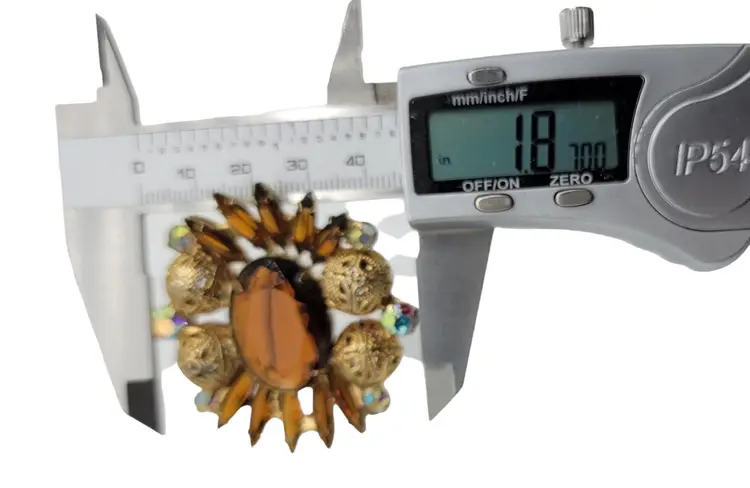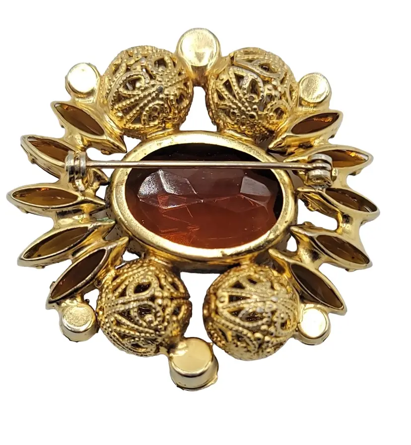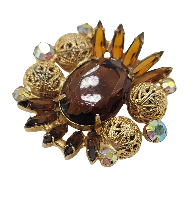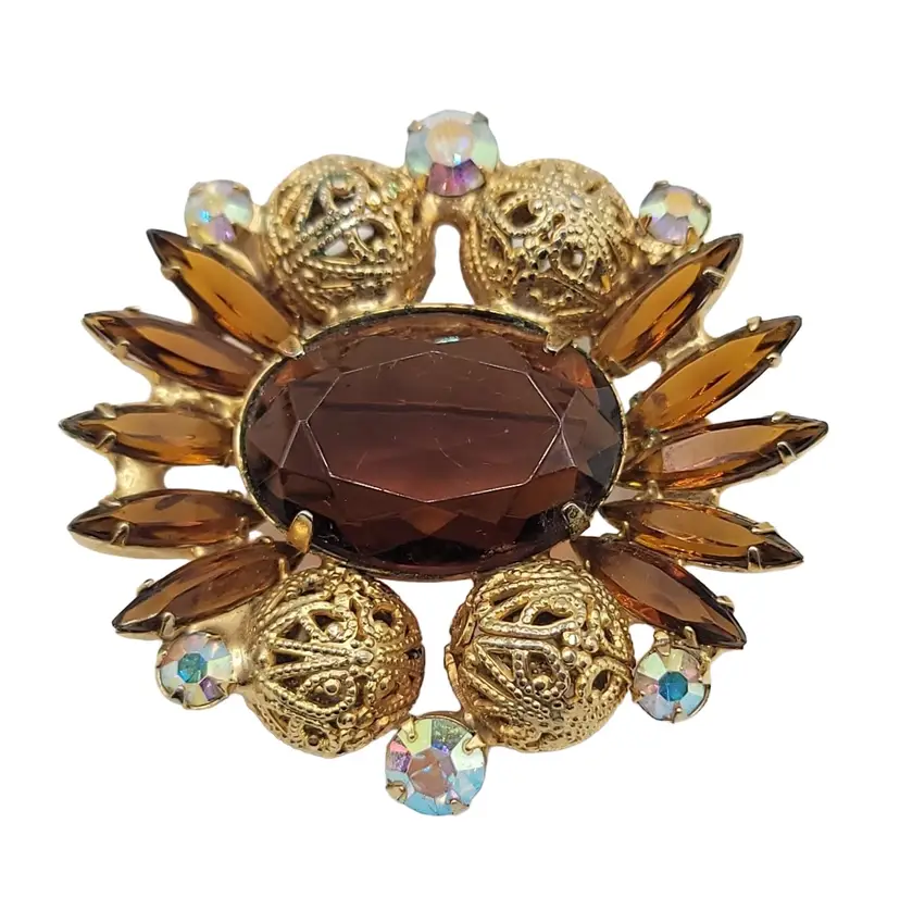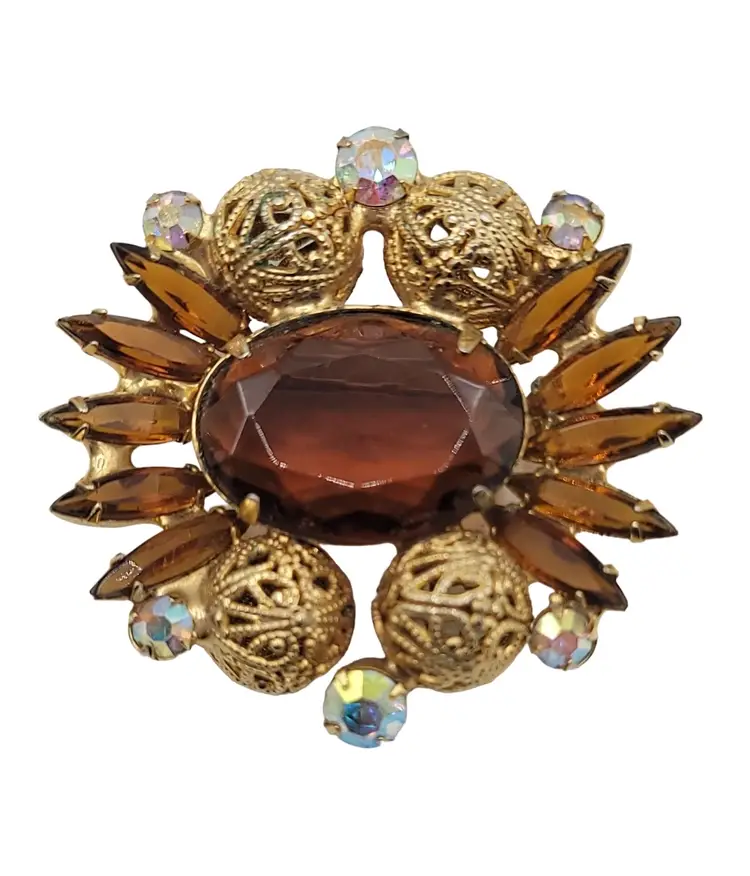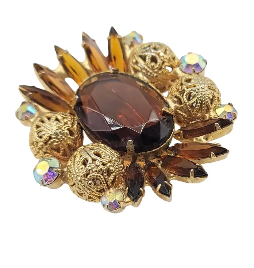 Luxurious, glittering, and flattering. This Gold-tone Topaz Brooch is the perfect accent jewelry piece. The unique design measures 1.8-inches in length. It has a large oval topaz cognac rhinestone in the center with five navettes on each side with Aurora Borealis alternately placed on each side of the filigree piece. This pin has a firm rollover clasp to the back. The brooch will definitely catch attention and shines brightly.