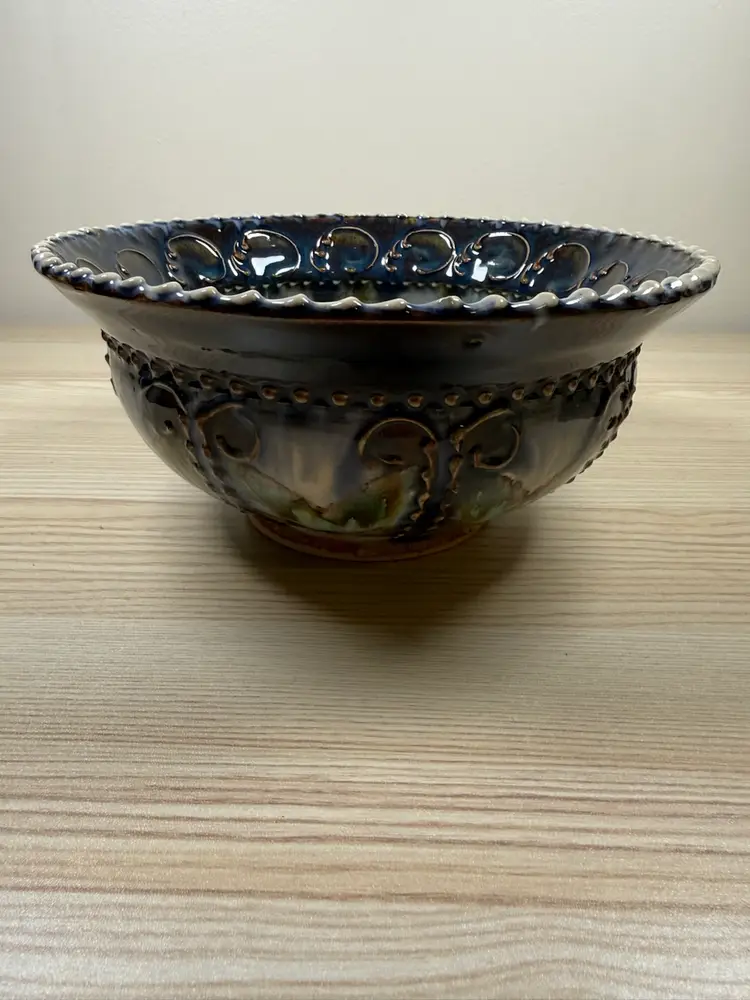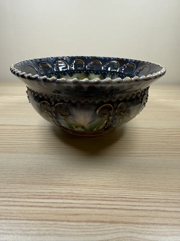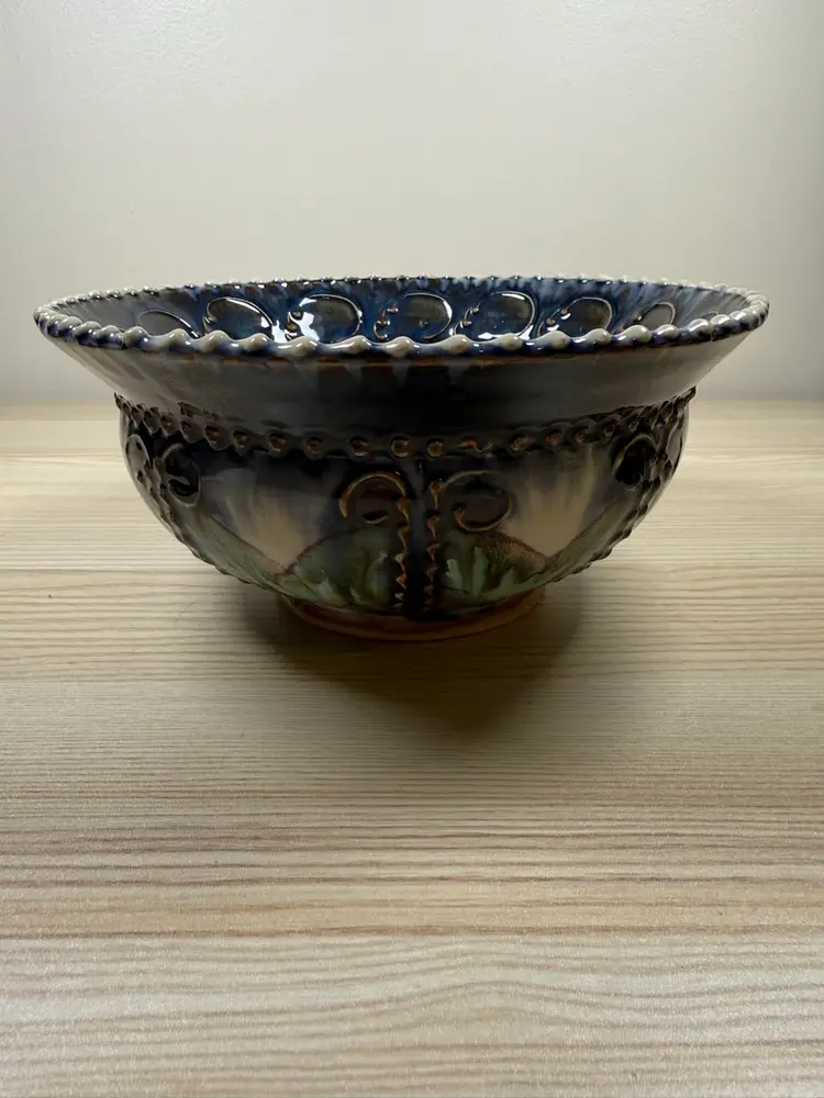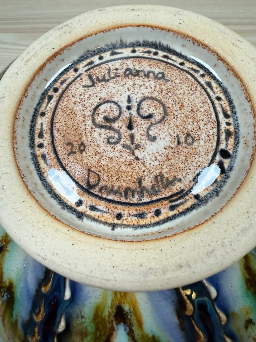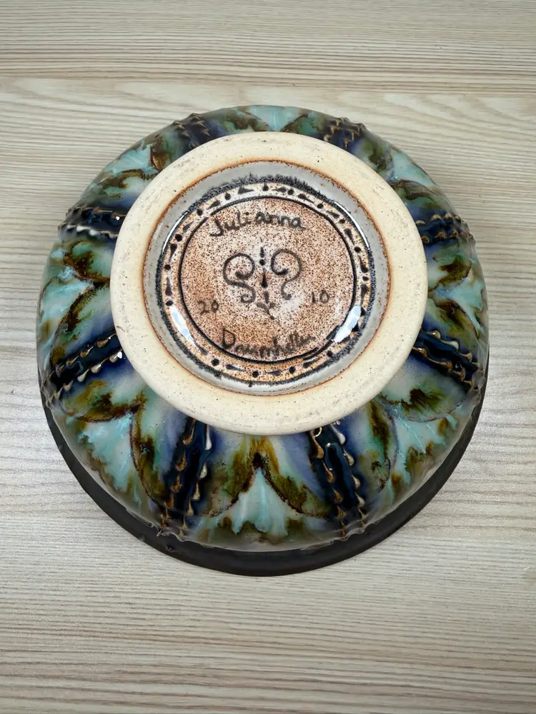 Measures 9” diameter, 4” tall No chips or cracks one small glaze skip noted in photos Signed Julianna Drumheller 2010