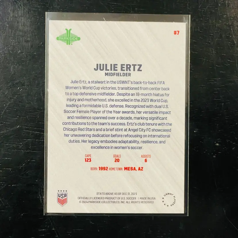 Card Size: Standard Set: 2023 Parkside USWNT Recap Year Manufactured: 2023 Player/Athlete: Julie Ertz Original/Licensed Reprint: Original Type: Sports Trading Card Sport: Soccer Language: English Manufacturer: Parkside Features: Base Set Team: United States Card Number: 7 Season: 2023