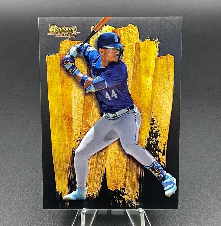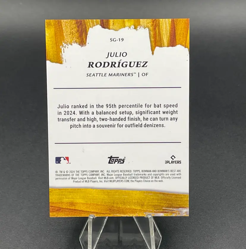 2024 Bowman's Best card featuring Julio Rodriguez of the Seattle Mariners. Stokes of Gold hit is 1:288 packs. Shipped BMWT.