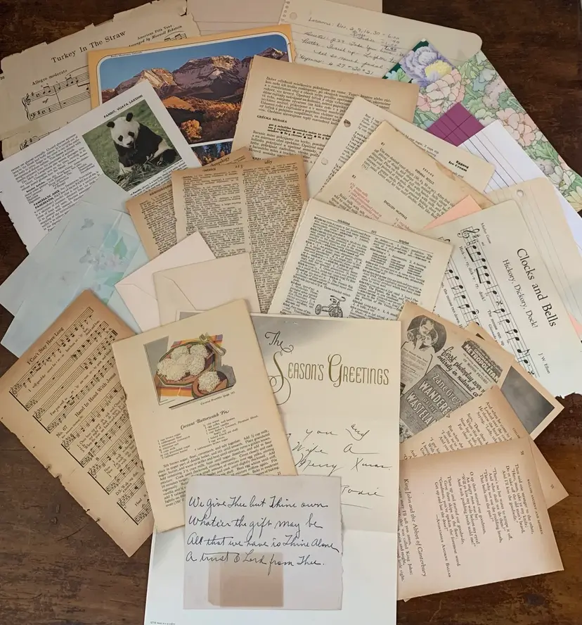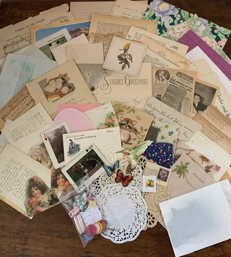 Junk journal ephemera packet vintage papers, sheet music, ribbon, buttons, stationary, wrapping paper and so much more!! Tons of vintage inspiration complied from my huge stash of vintage paper goodness!