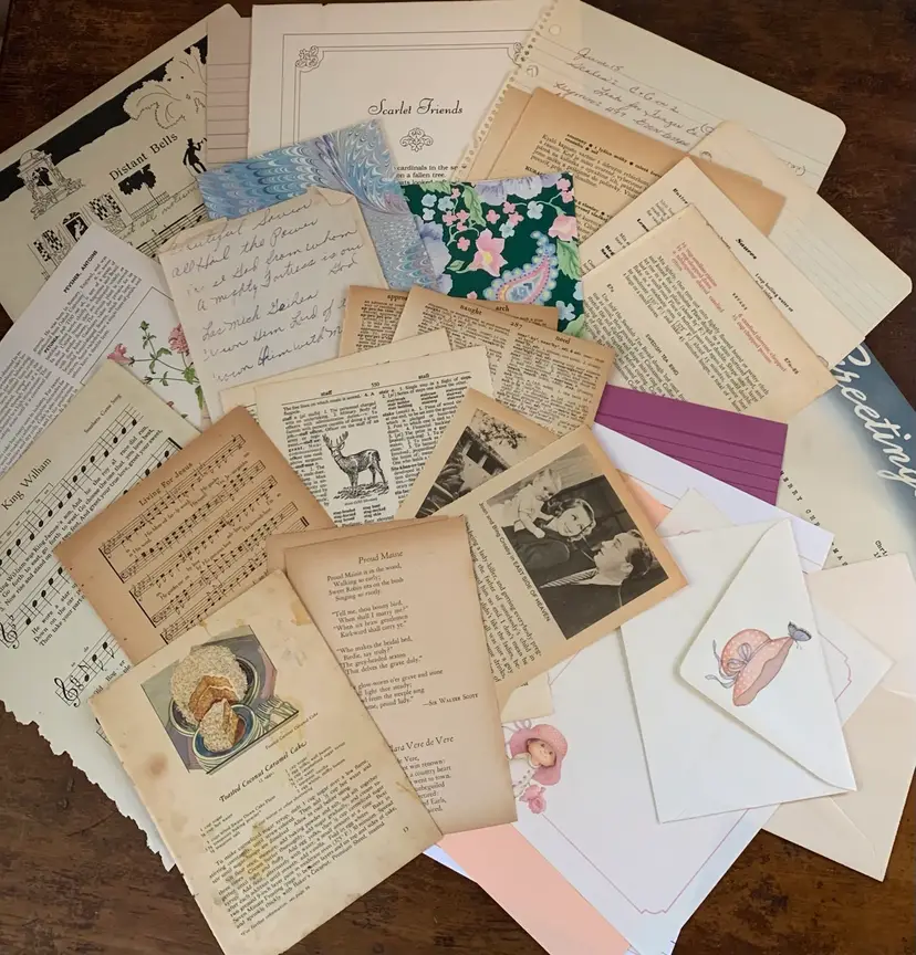 Junk journal paper packet loaded with vintage ephemera! Sheet music, stationary, tea stained doilies, ribbon, buttons and more! Full of amazing vintage inspiration from my personal stash of ephemera.