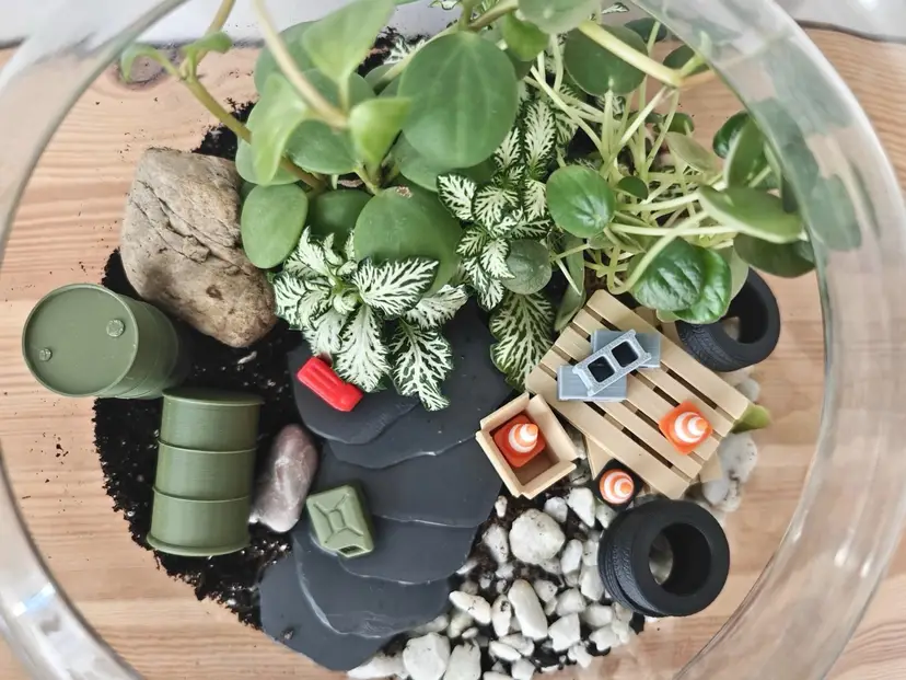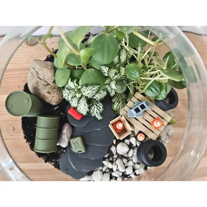 Transform your peaceful terrarium into a scene straight out of a miniature scrapyard! This 1:24 scale junkyard decor set includes 3D-printed barrels, crates, tires, cones, bricks, and even a jerry can - because nothing says plant paradise like a bit of post-apocalyptic flair.