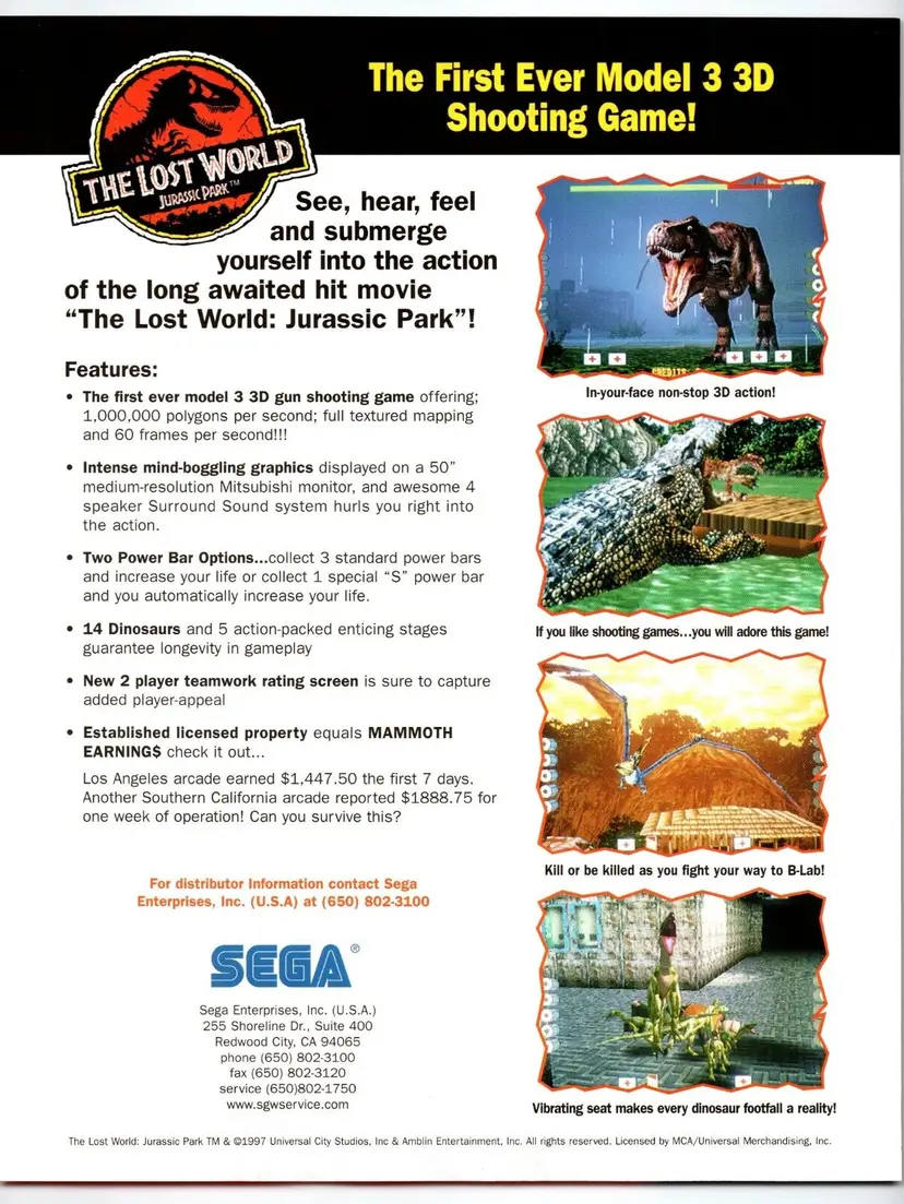 Brand: Sega Year: 1997 Game Title: Jurassic Park The Lost World Theme: Retro Original/Reproduction: Original Country/Region of Manufacture: United States Modified Item: No Arcade: Flyer