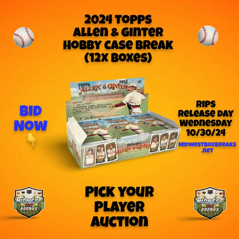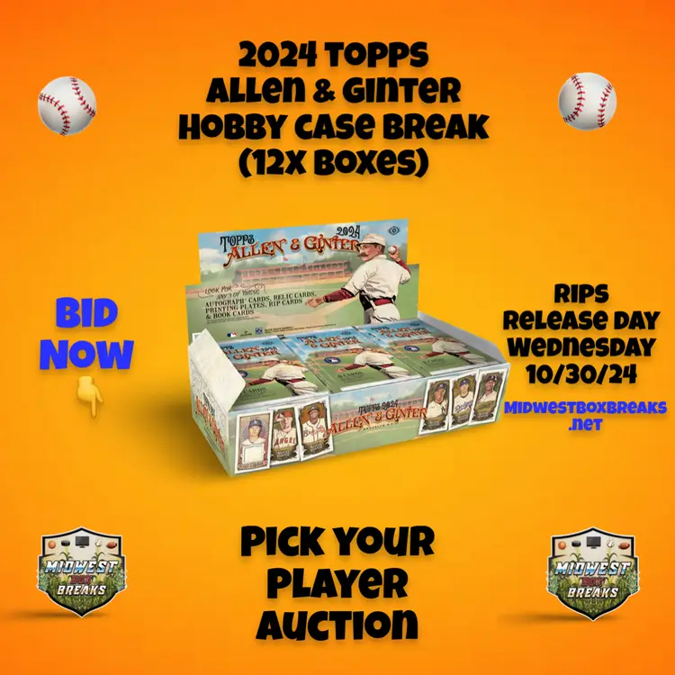 You are bidding on all the cards of the player listed in the title in this Hobby Case (12x Boxes) of 2024 Topps Allen & Ginter Baseball Cards. Case will be opened LIVE after auctions end on RELEASE DAY 10/30/2024. Opening will be viewable & simulcast on Midwest Box Breaks District as well as YouTube and Twitter. US Shipping is $5.00 for your first auction spot won; each spot after that is FREE SHIPPING! Any spot won where no cards of the player are found in the box will receive a bonus card or pack from Midwest Box Breaks. Any hit pulled (Cut Autos, Sketches, Hidden Gems etc) of a subject who is NOT listed in the auction will be assigned by draw between all participants. Any dual or multi-player #'d or auto cards featuring multiple subjects will be assigned live between the spots depicted on the card.