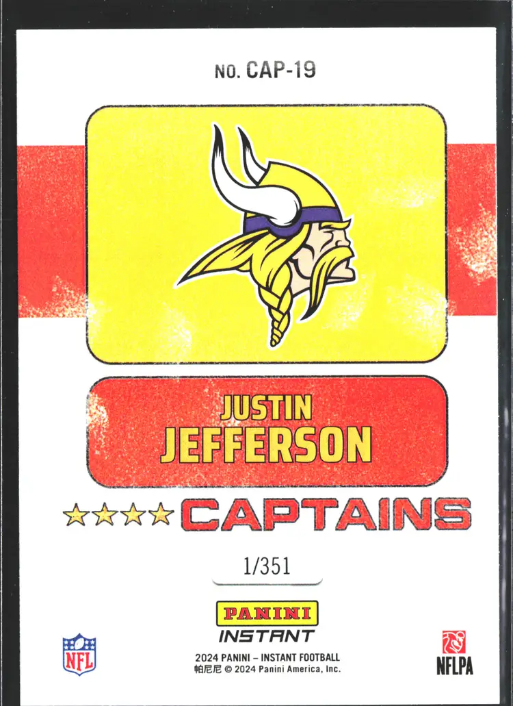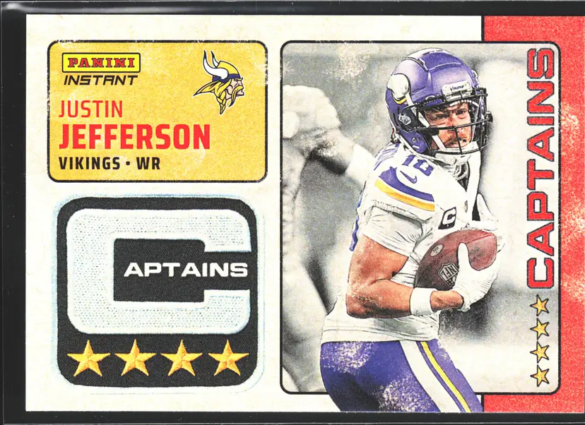 1st time buyer? Get $5 Off with code DISTRICT5 at checkout! Card as shown. All cards $20 and under ship PWE via lettertrackpro [https://www.letter-track.com/registerap.asp?AFID=8757] Team: Minnesota Vikings Player/Athlete: Justin Jefferson League: National Football League (NFL) Sport: Football Type: Sports Trading Card Manufacturer: Panini Set: 2024 Panini Instant NFL Features: Limited Edition, Serial Numbered Season: 2024 Autographed: No Signed By: Justin Jefferson Year Manufactured: 2024 Vintage: No Graded: No Material: Card Stock Original/Licensed Reprint: Original Country/Region of Manufacture: United States