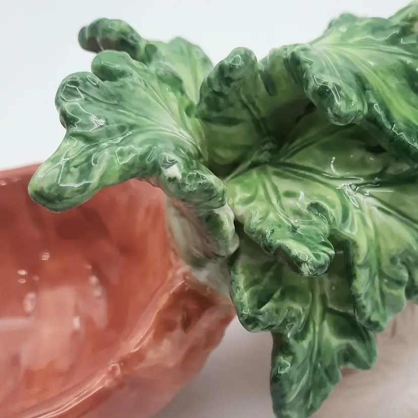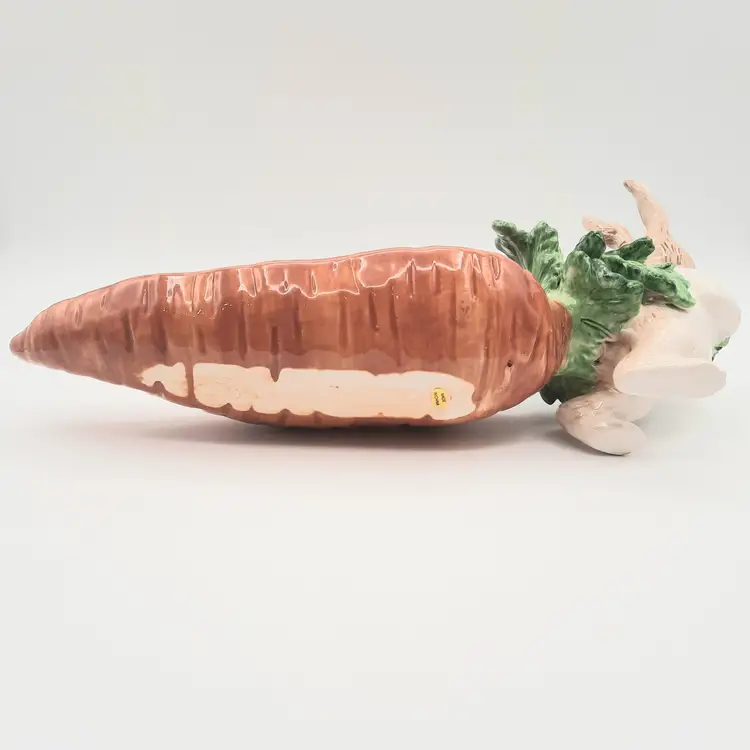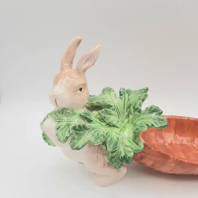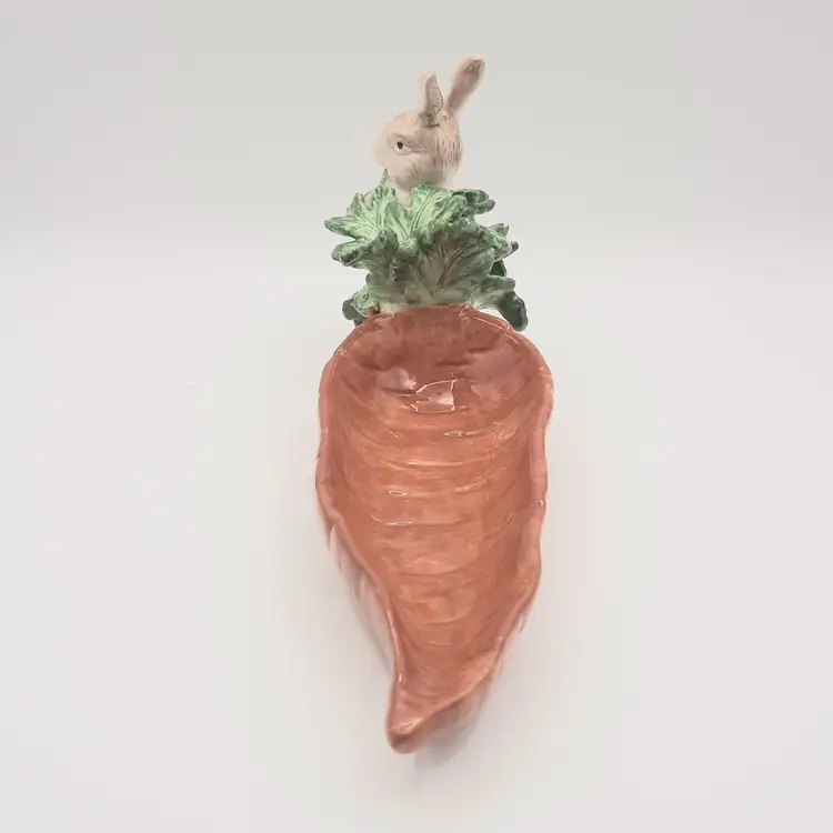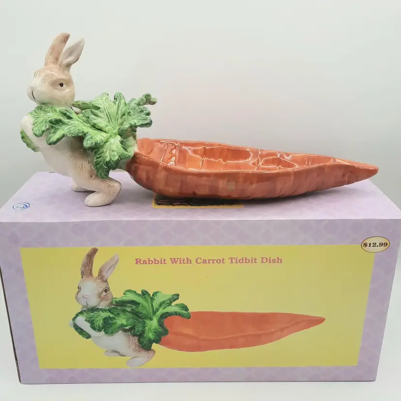 This adorable Easter dish is in it's original box, 12"L x 6 1/2"H x 4"W, excellent condition with a mfg flaw in glaze on end of carrot, light spot on edge of leaf isn't a chip, just looks like paint was missed