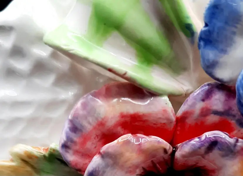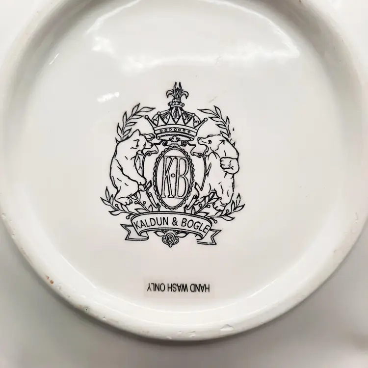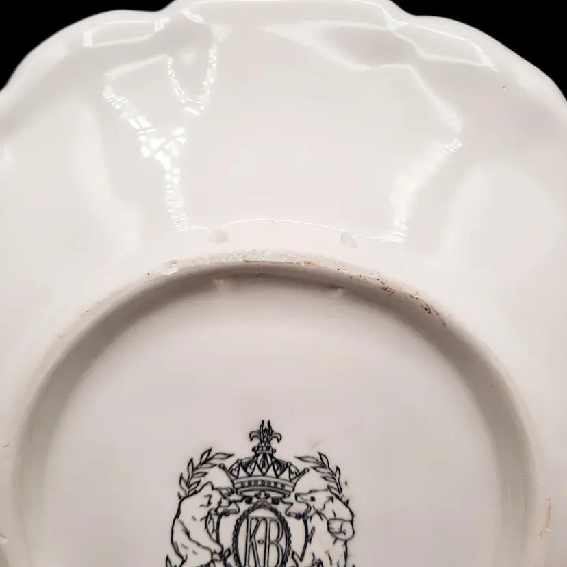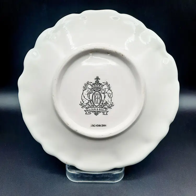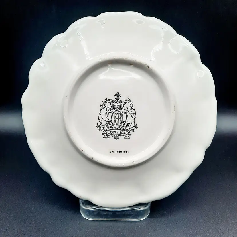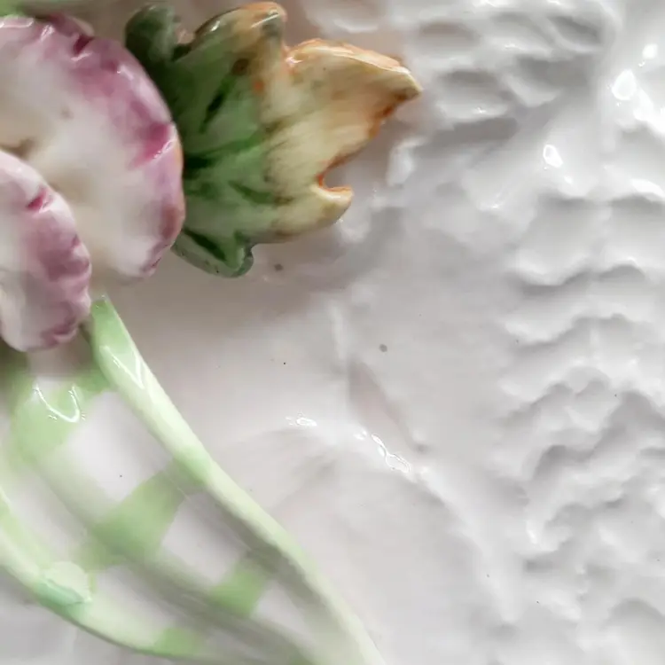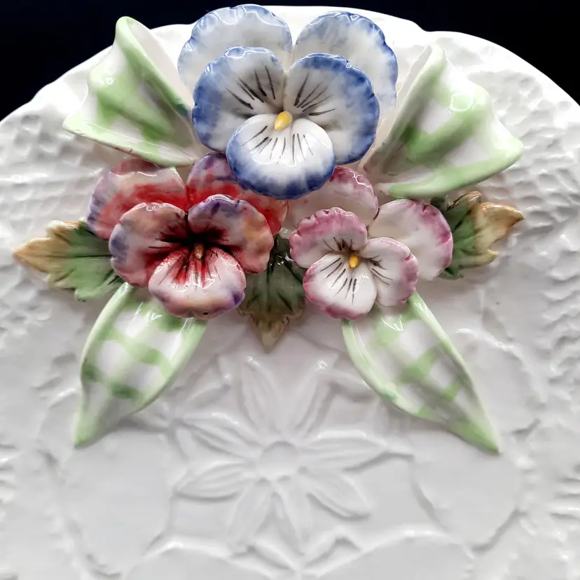 Beautiful 7 3/4" plate in excellent condition, a couple tiny dark specks on plate, small flaws in one side of ribbon look like design imperfections, has holes on back to hang on wall if desired