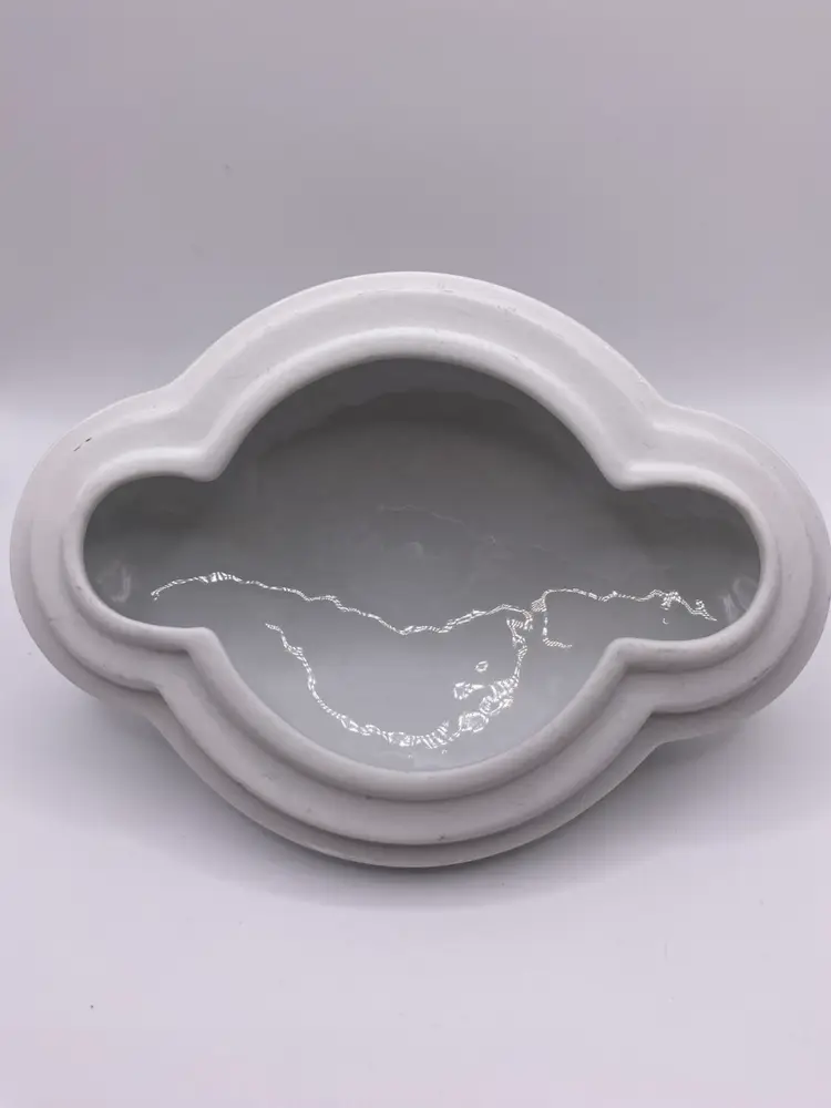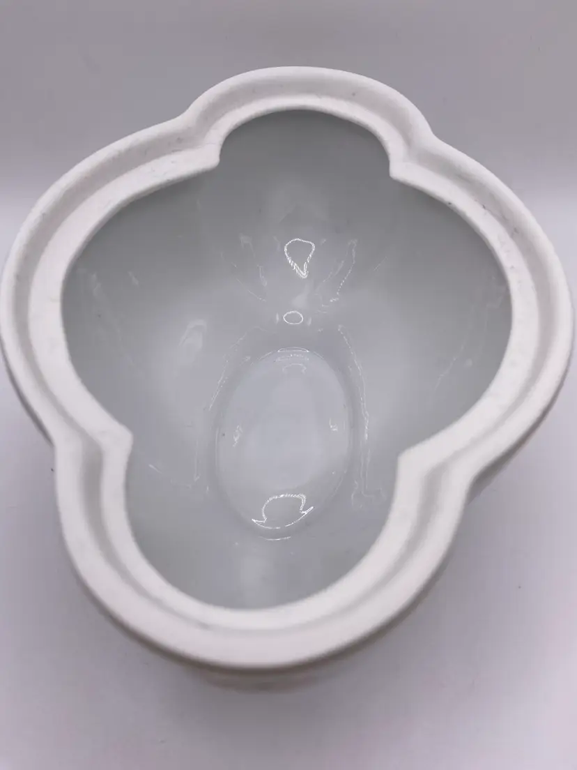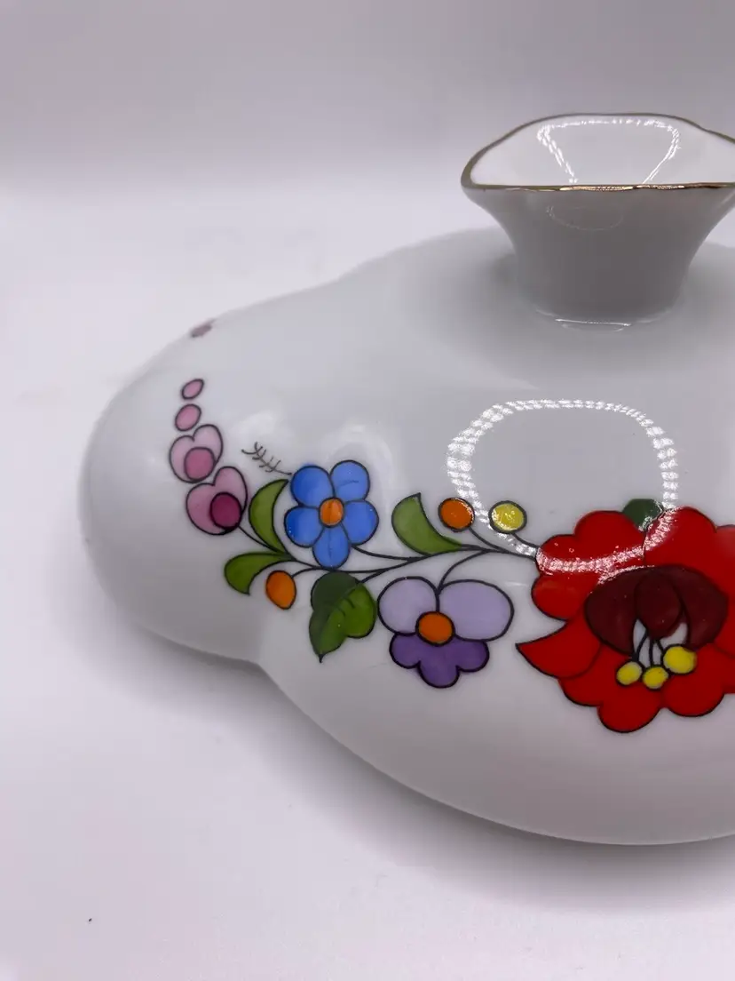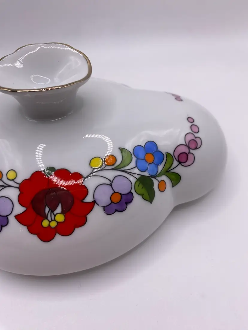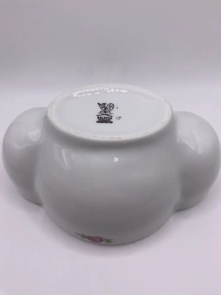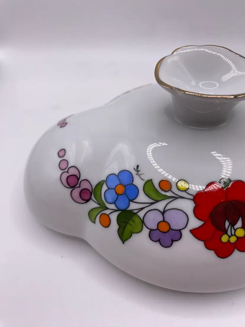 Dish is approximately 5-1/2” tall x 6-1/2” long x 4-1/2” wide. It’s in good condition. No chips or cracks. There is some very minor paint loss. See photos for details.