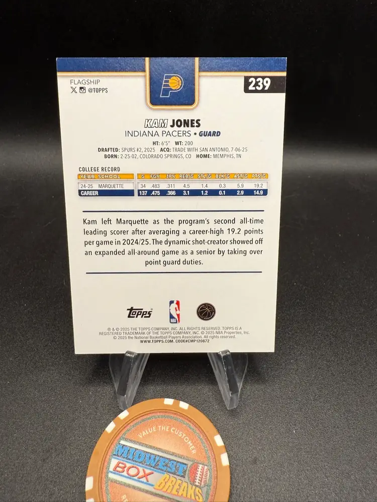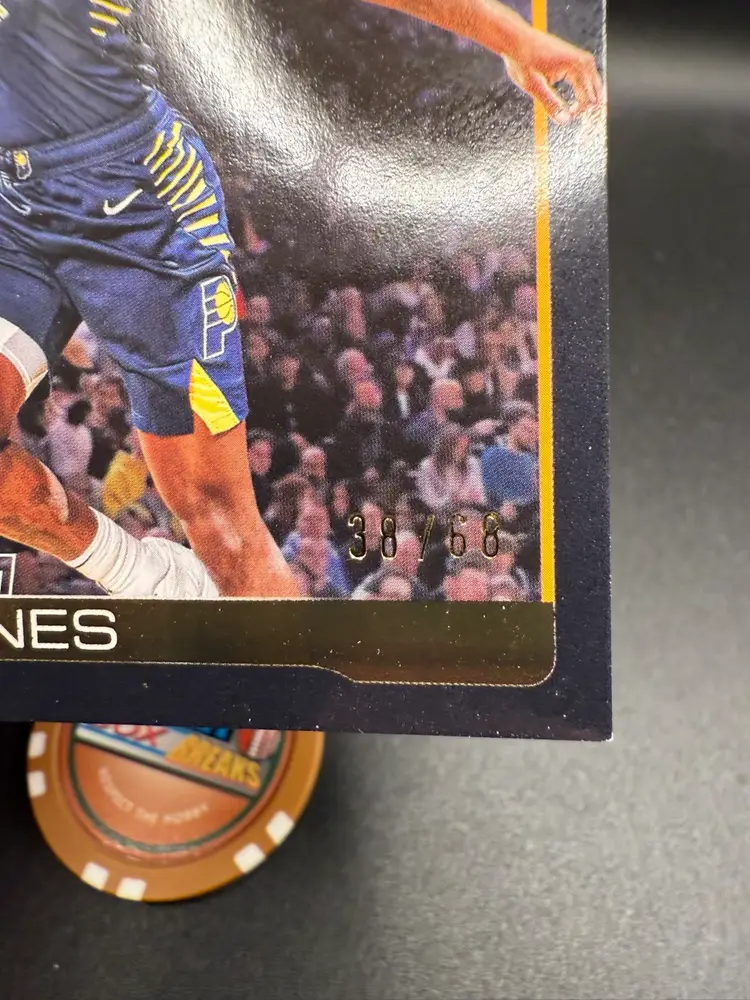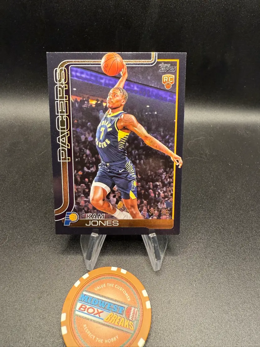 This is a Kam Jones black parallel #38/68 from Topps 25-26 NBA product. Indiana pacers. Bottom right corner has some whitening.