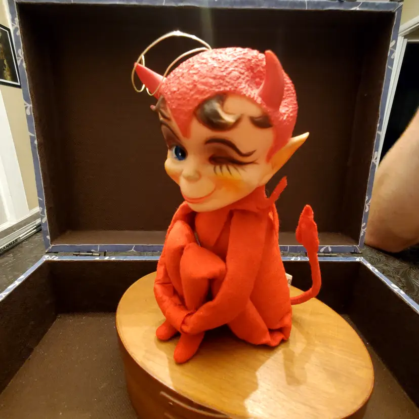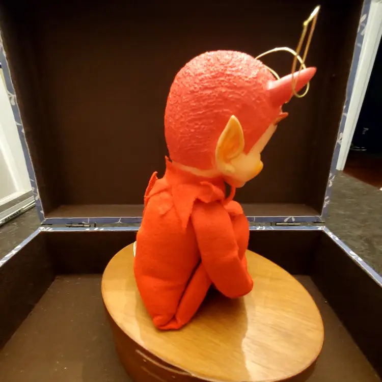 This is a cute vintage kamar devil knee hugger. Approximate measurements in photos. Fabric is in great condition. There is a small dent in the head near one of his horns. Still has original tag.