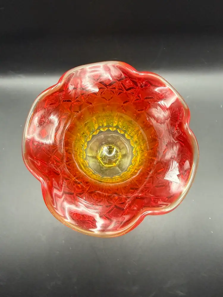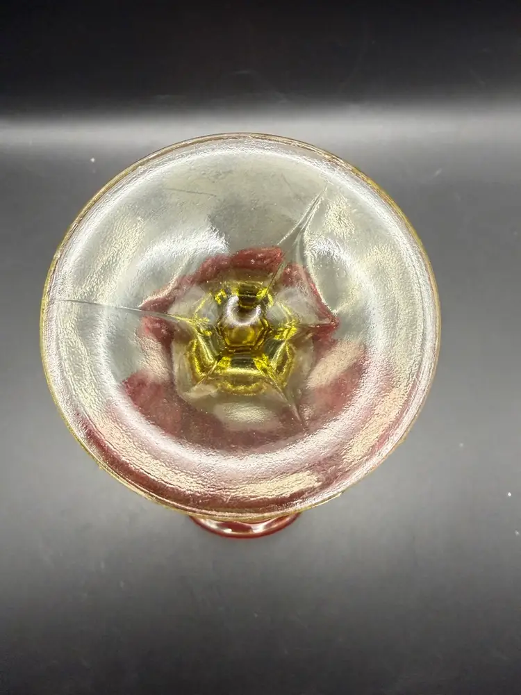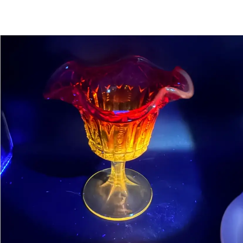 This mid century discontinued Kanawha compote glows under UV light (cadmium glow). It stands 5.5 in high.