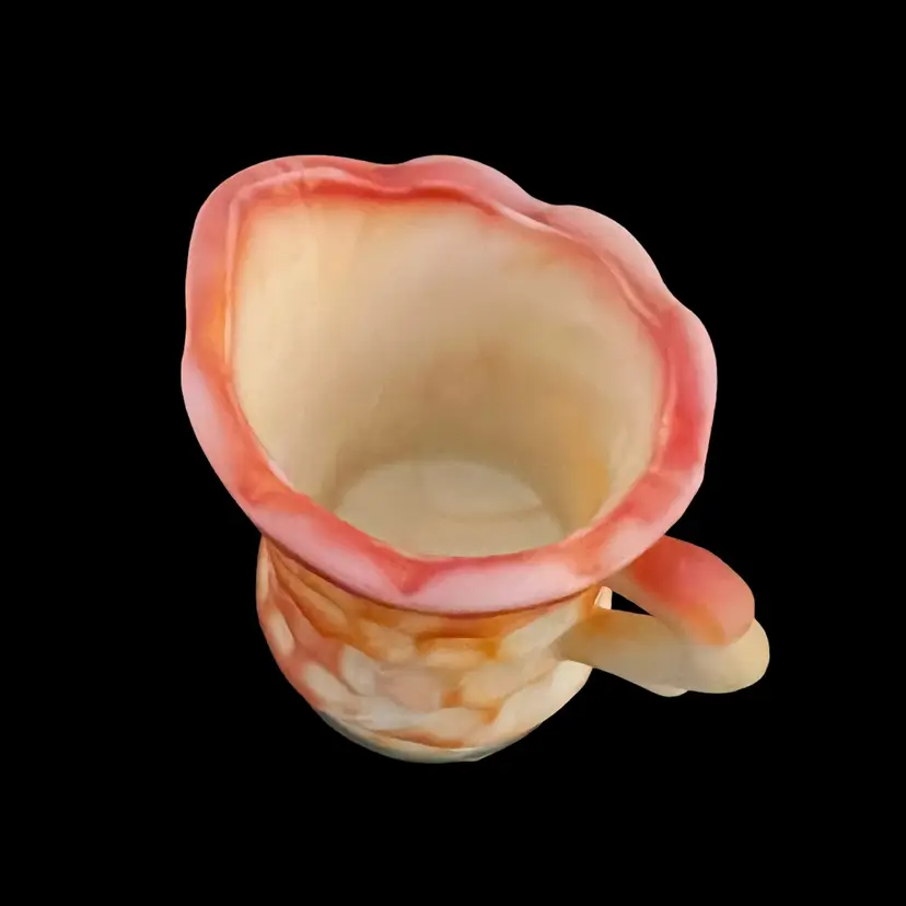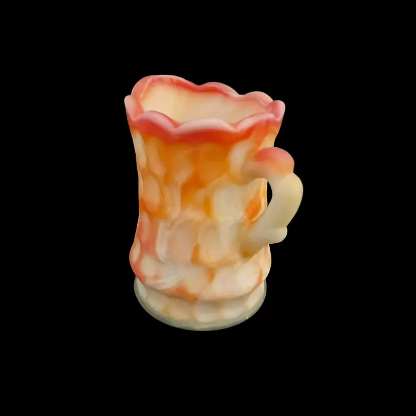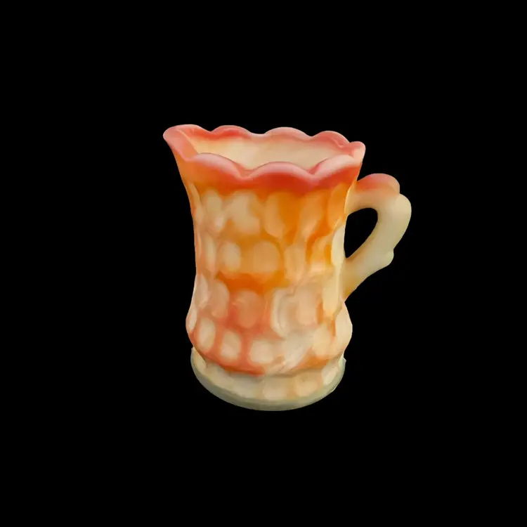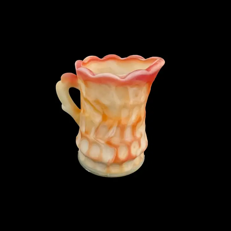 Here we have a small pitcher or creamer from Kanawha Glass. This is made of orange and yellow slag glass with a thumbprint pattern. Measurements: 3 1/2" tall Condition: Very good, with no chips or cracks.
