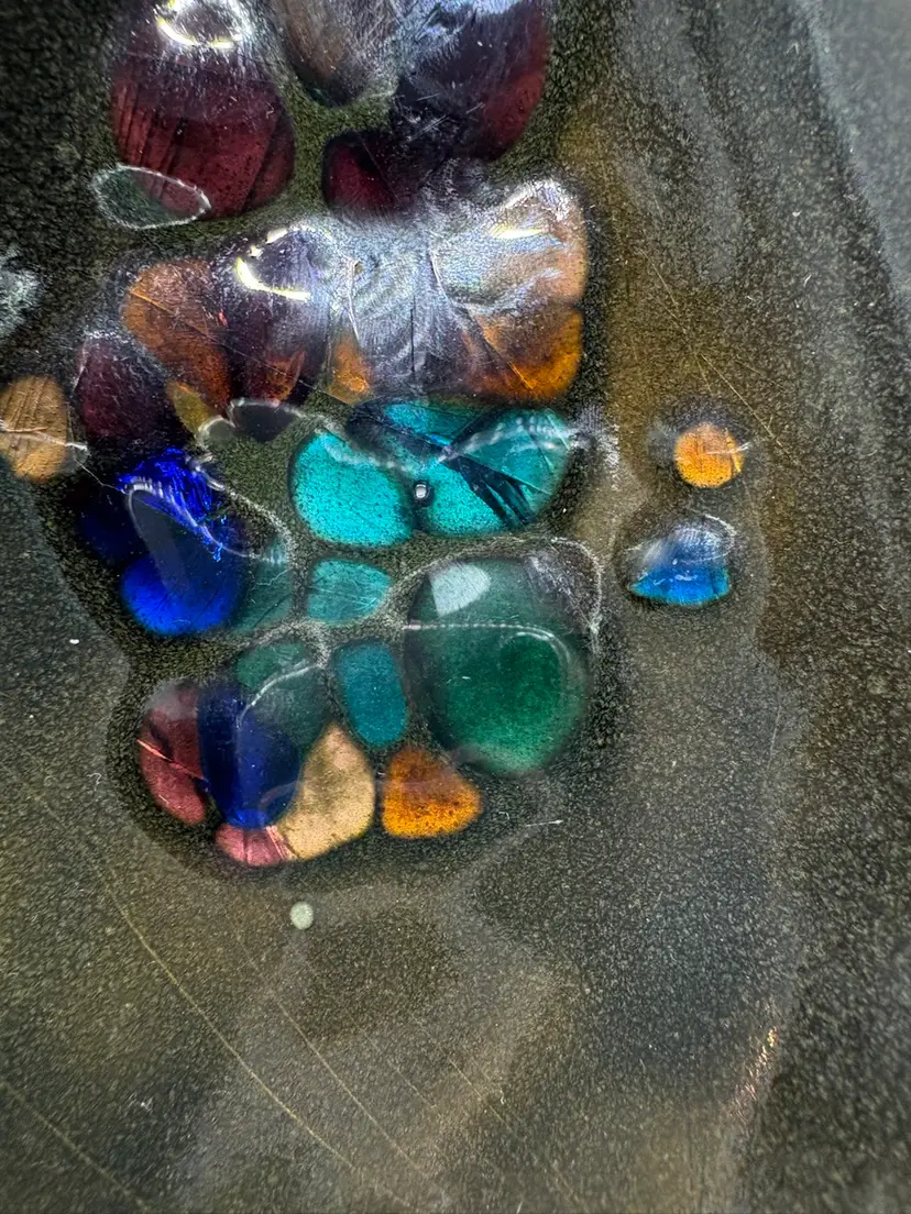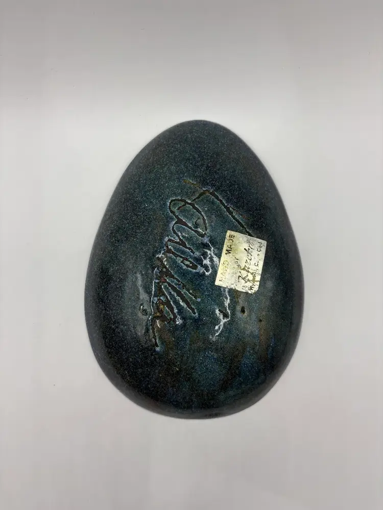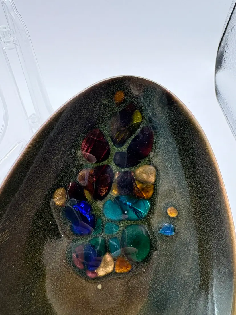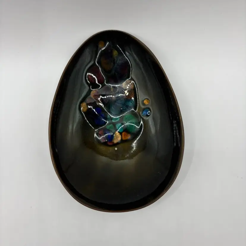 Kareka Olive Dark Olive Green Enameled Over Copper Trinket Tray “Stained Glass” design Egg shaped design overall Signed plus original sticker Measures 5 1/2 inches by 4 inches at widest There are 2 manufacturer defect as enamel was missed see last photo