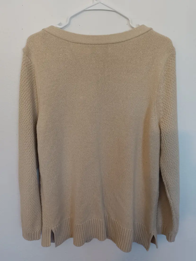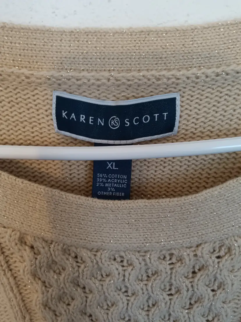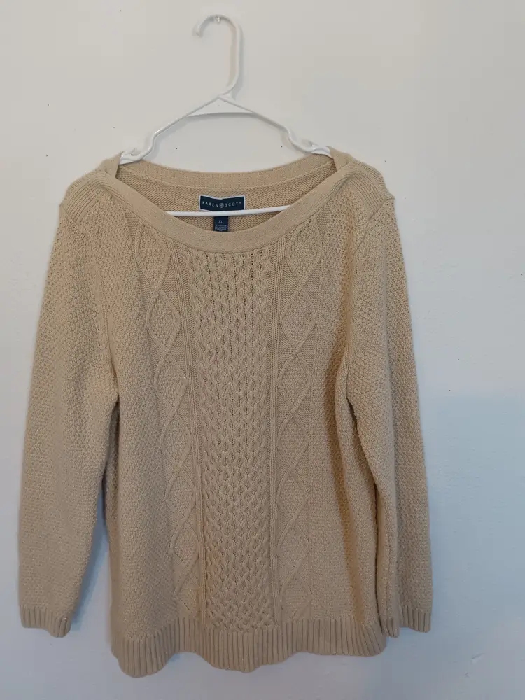 Karen Scott Women’s beige cable knit sweater in size XL. Features a classic crew neckline, ribbed trim, and textured knit design with subtle metallic threading for a touch of shimmer. Made from a soft cotton-blend fabric for comfort and style.