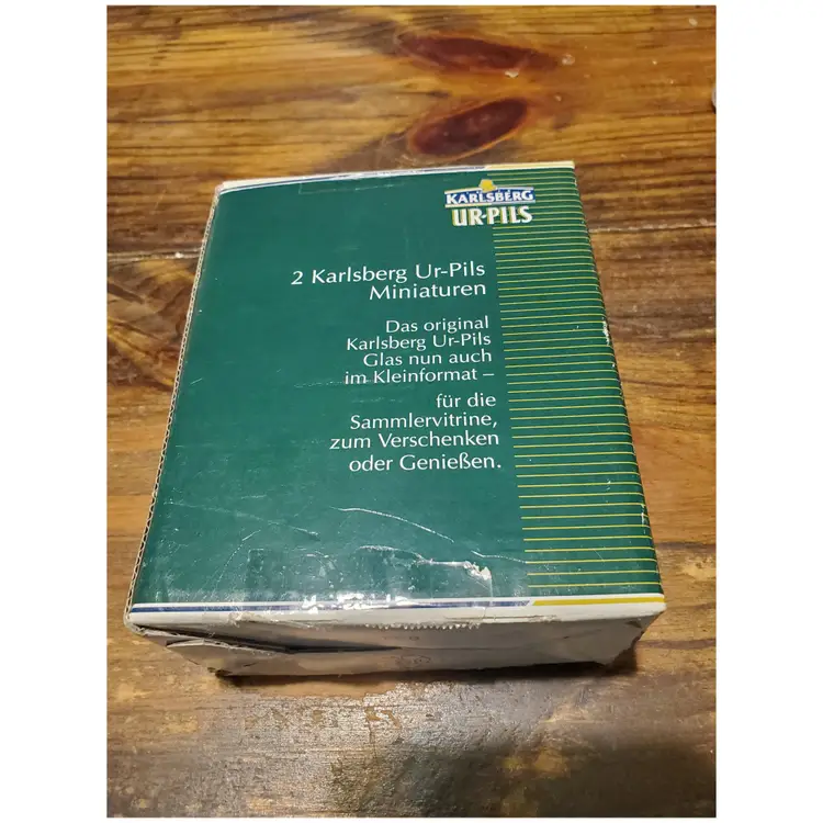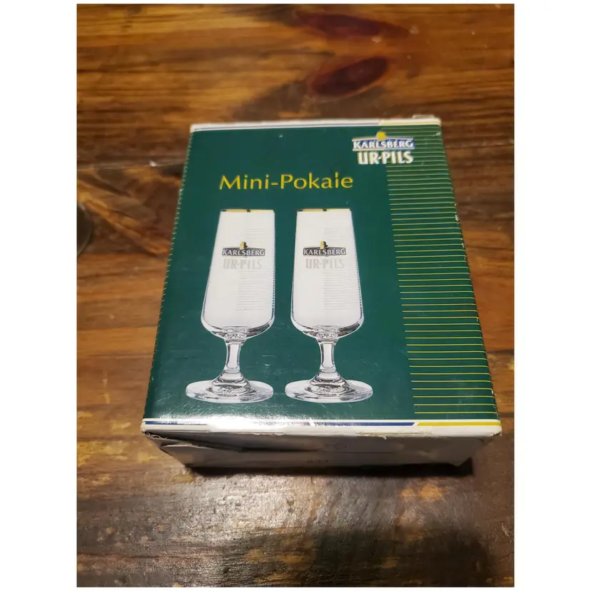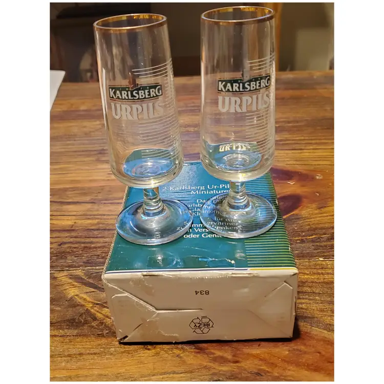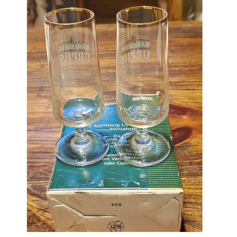 Karlsberg UR-Pils Miniature Pokale Beer Glasses Set of 2 Original box No chips or cracks Gold rims 5 inches tall