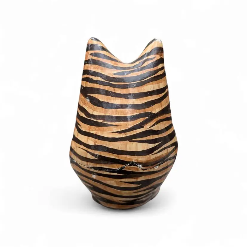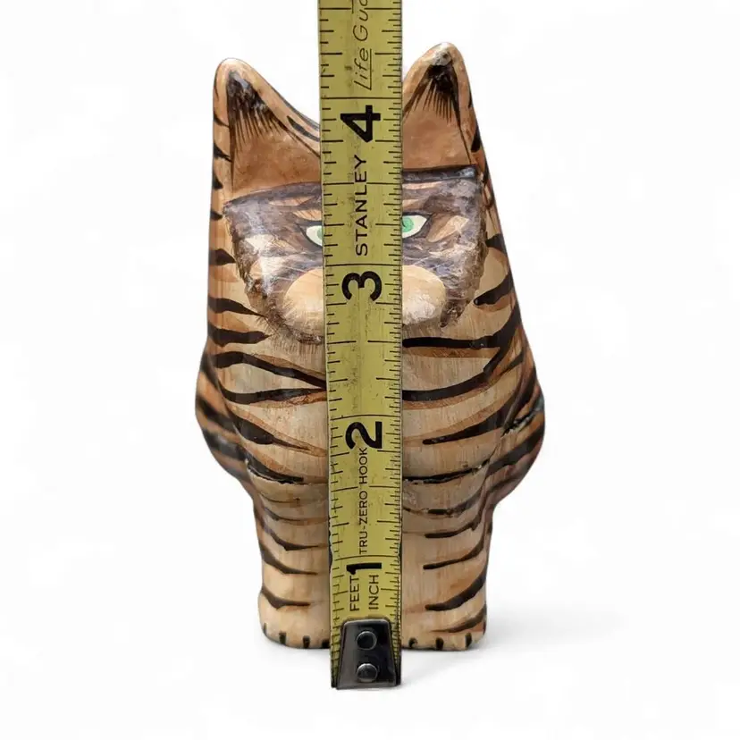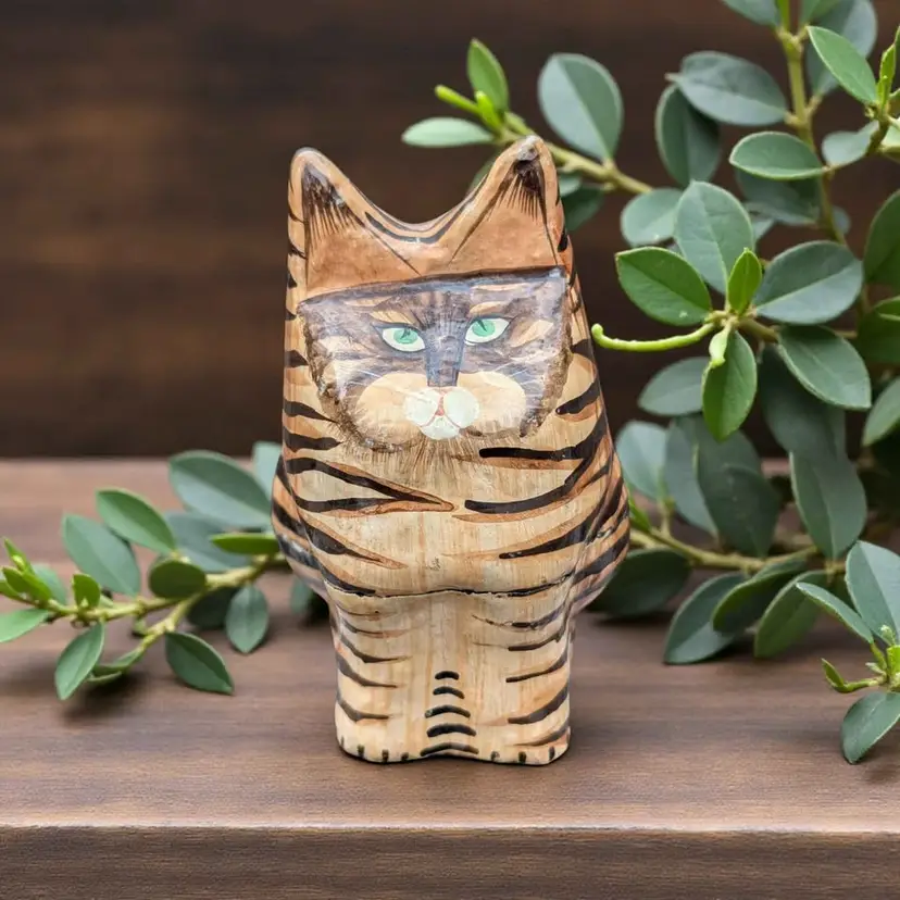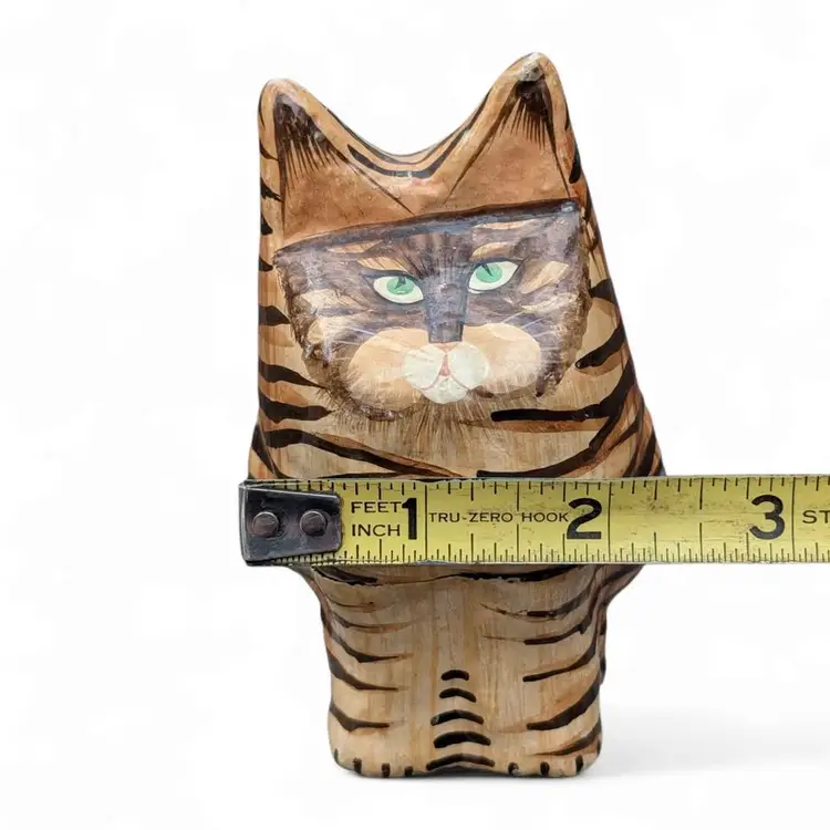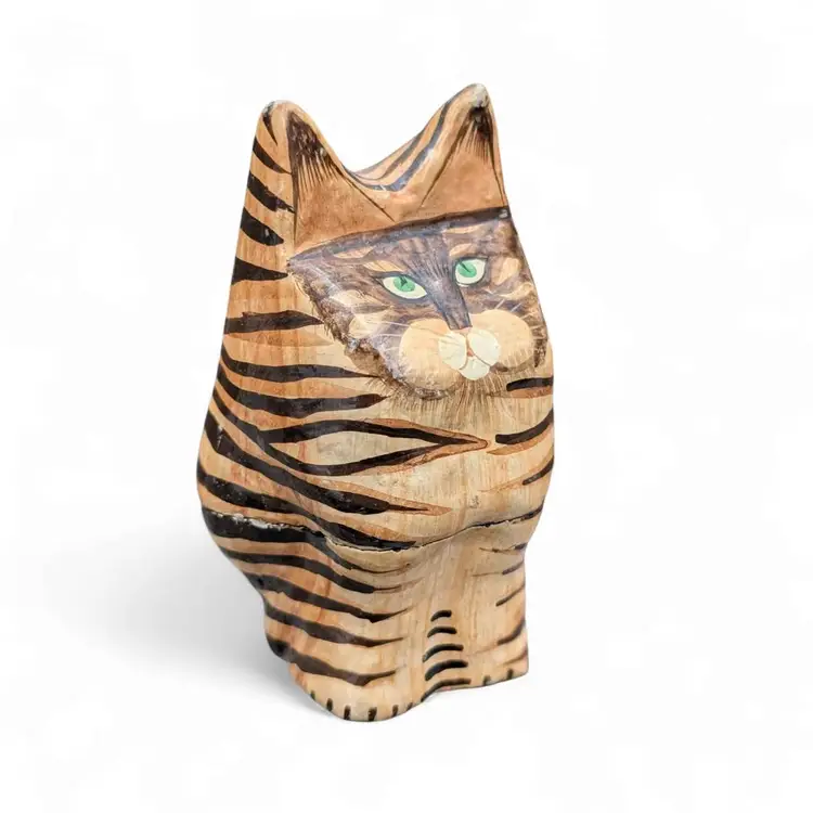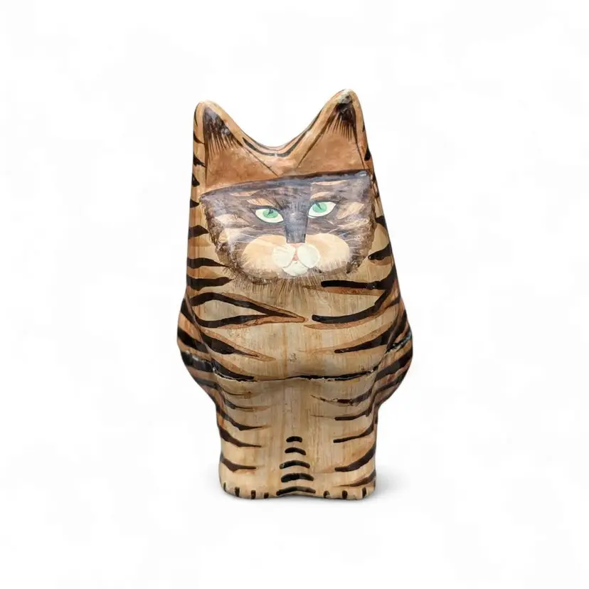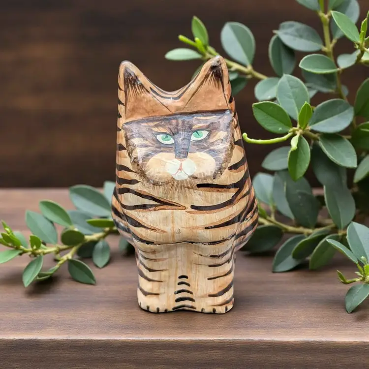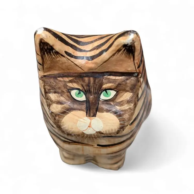 Kashmir Hand Painted Paper Mache Wood Folk Art Green Eye Tabby Cat Trinket Box. This is a cool cat trinket box - this has a black lacquer inside and is hand painted on the outside - looks like a tabby cat with green eyes. Overall good condition, there are some signs of age and wear at the ears and on the seam where the box connects. Please see photos It stands about 4.25" tall and is just under 2.5" wide.