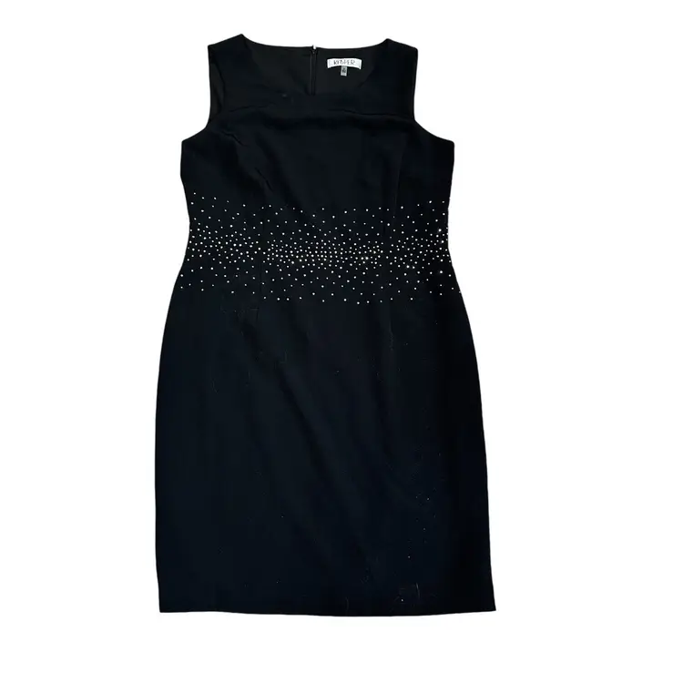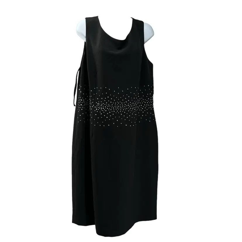 Kasper Little Black Dress With Silver Studs Sleeveless New With Tags 16 Plus size women's 16 New with tags retails $99 Sleeveless crew neck zips Polyester Shift Dress A-Line Midi below knee Night out, glam