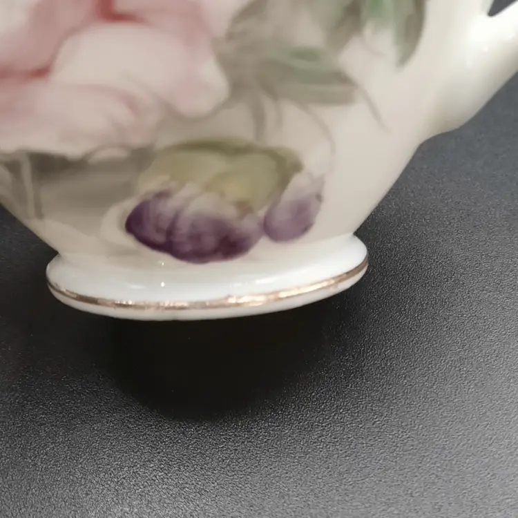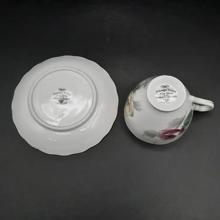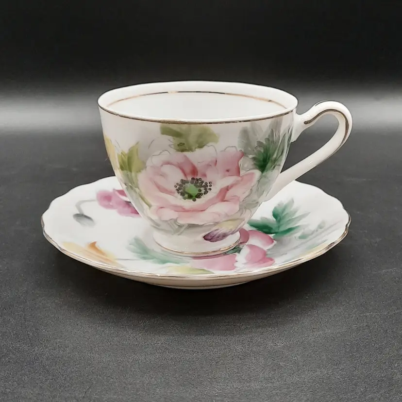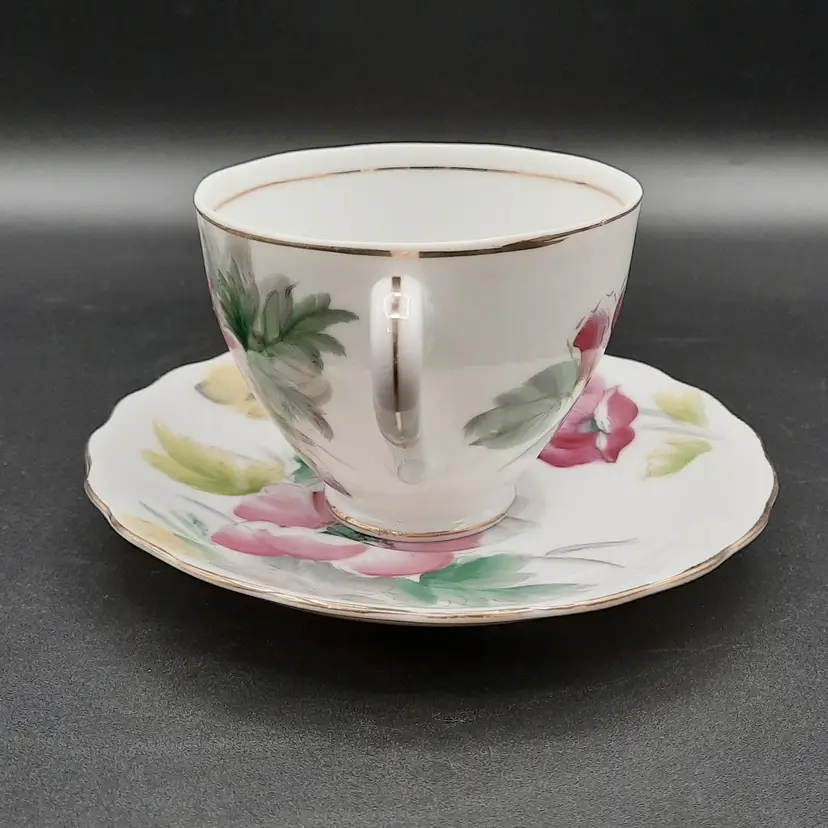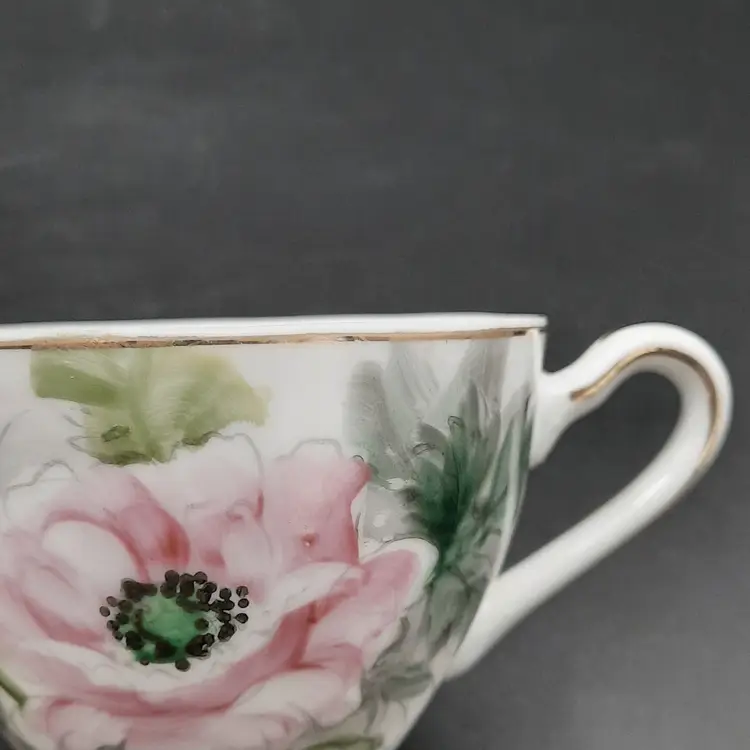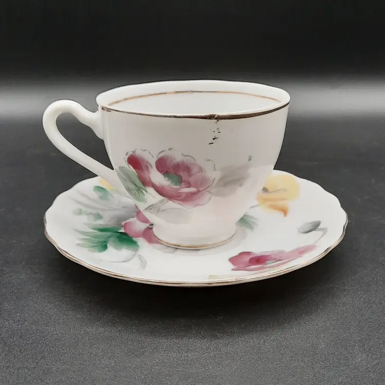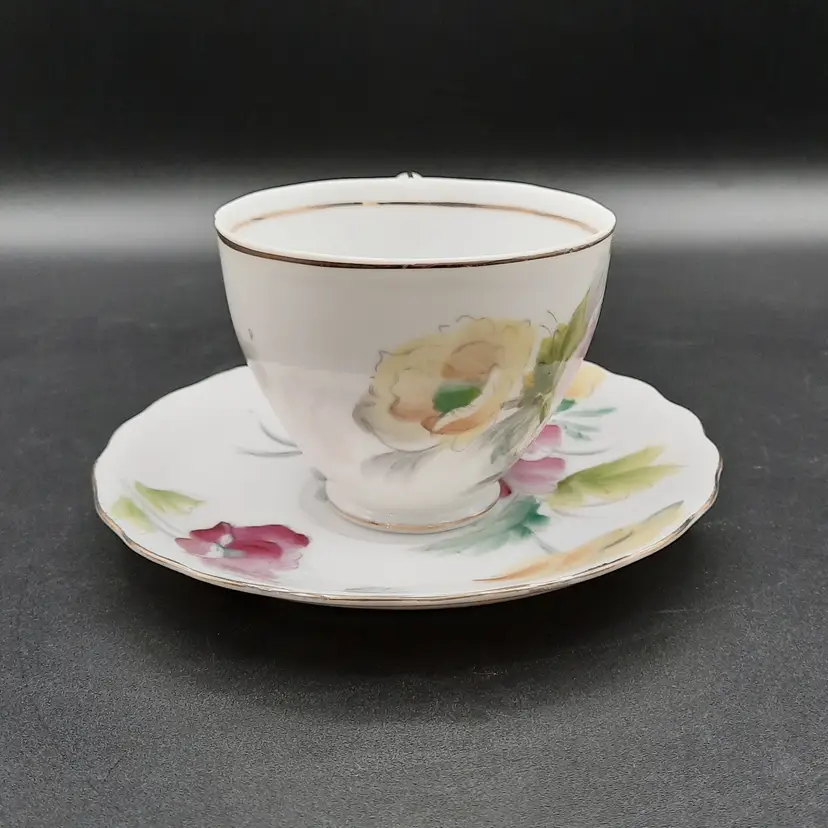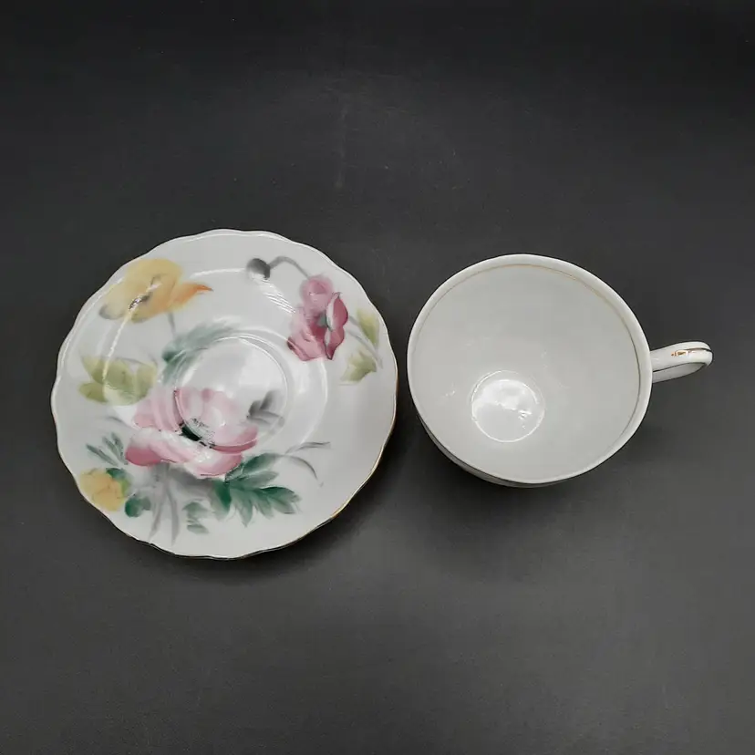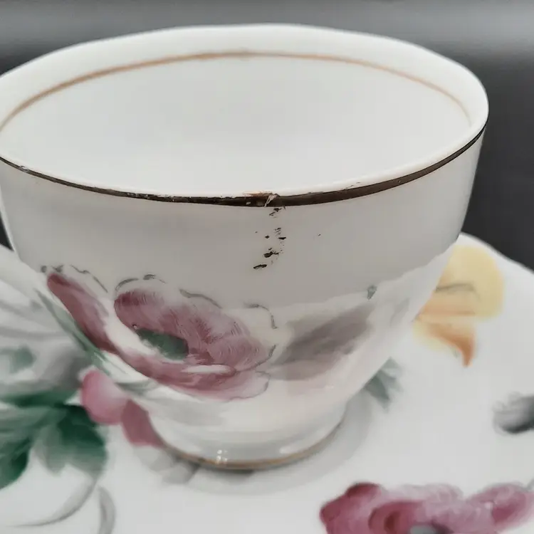 Beautiful floral set in very good condition with a spot on rim that looks like the gold was smeared during painting and some light wear to the gold trim, saucer is 5 1/2", cup is 2 1/2"H x 3 1/4"W at rim