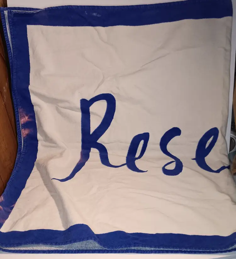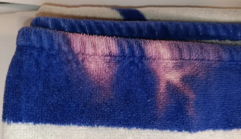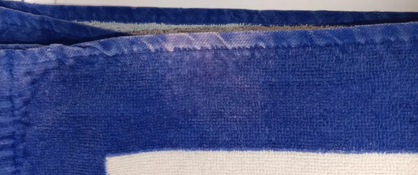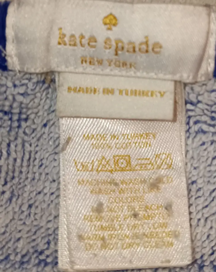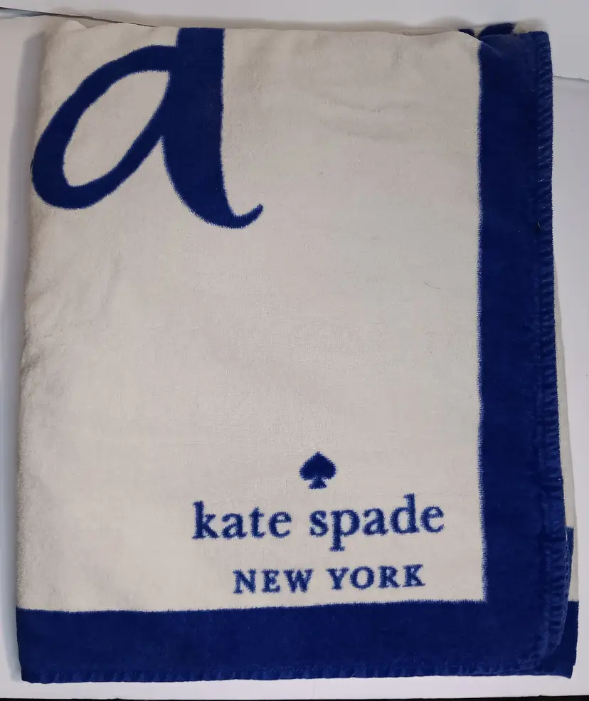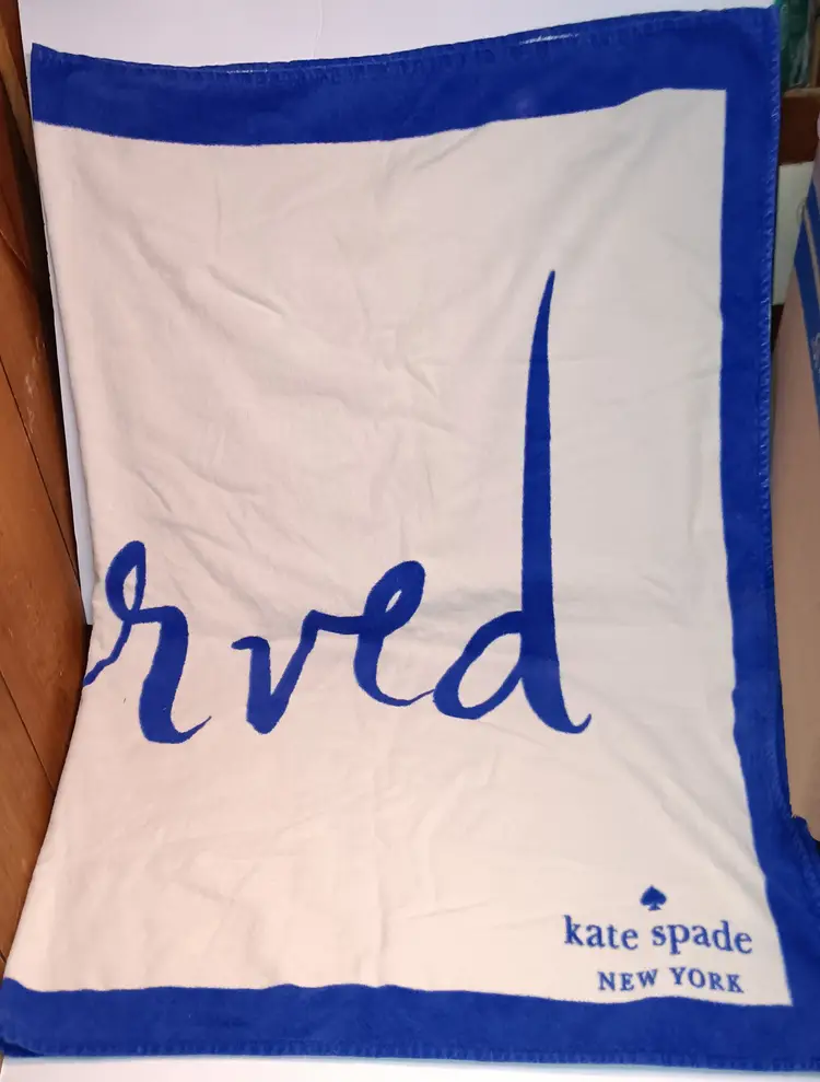 Blue/White Kate Spade Beach Towel. There are some bleach spotting in a few areas on the edge of the towel.