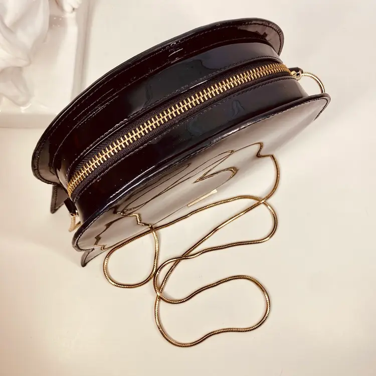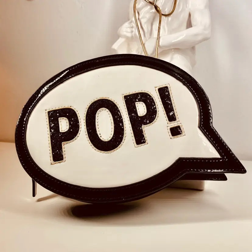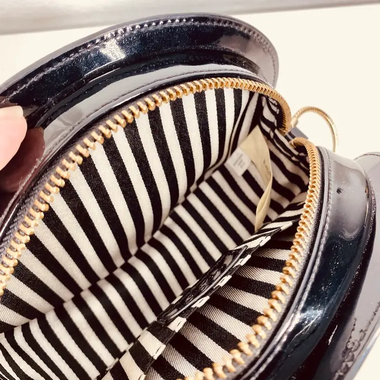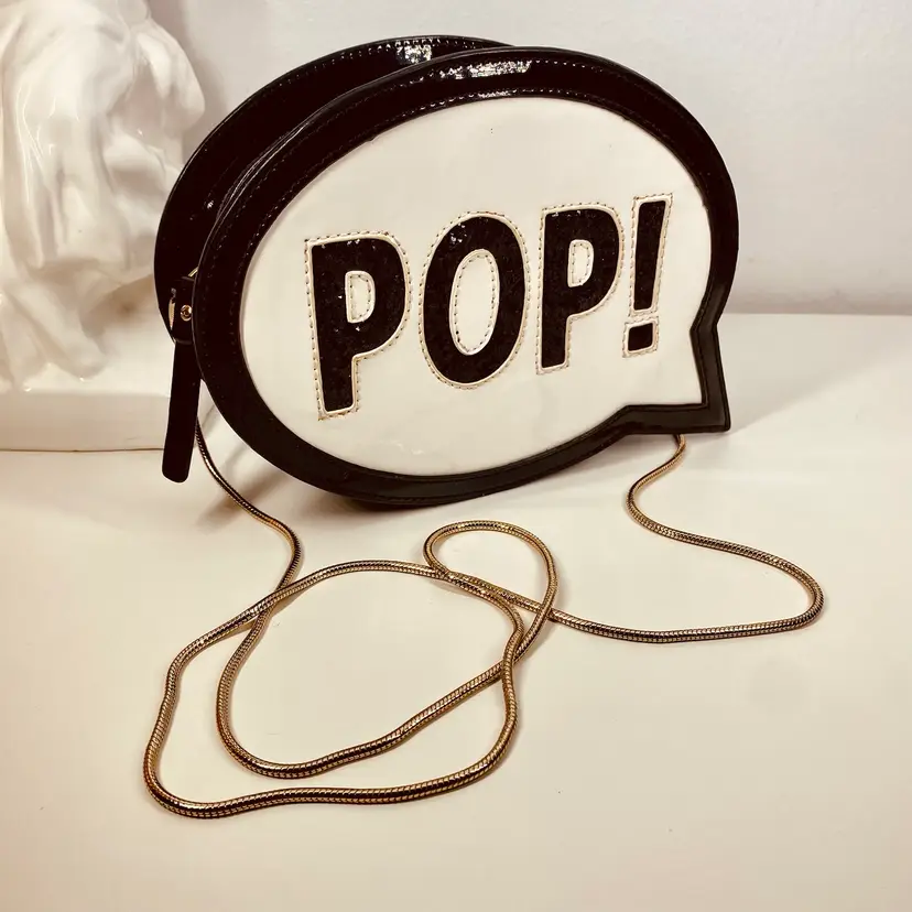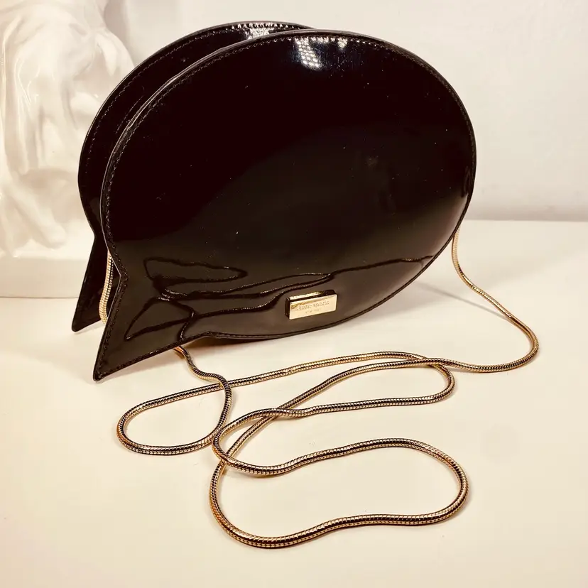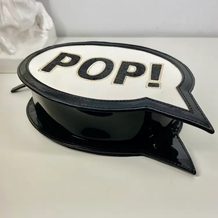 Hi... This Kate Spade crossbody bag is a must-have for any POP! art lover. The oval shape and black and white patent leather exterior with gold tone hardware make it a stunning piece that can be worn as a clutch or with a crossbody strap. The bag has a zipper closure and measures 9 inches in width, 6 inches in height, and 2.75 inches in depth. The bag features a striped lined interior with a pocket and a chain strap with a drop of 17 inches. The bag is inspired by the Pop Art movement. This vintage bag is perfect to make the scene with or for any casual occasion. This is a Kate Spade original.