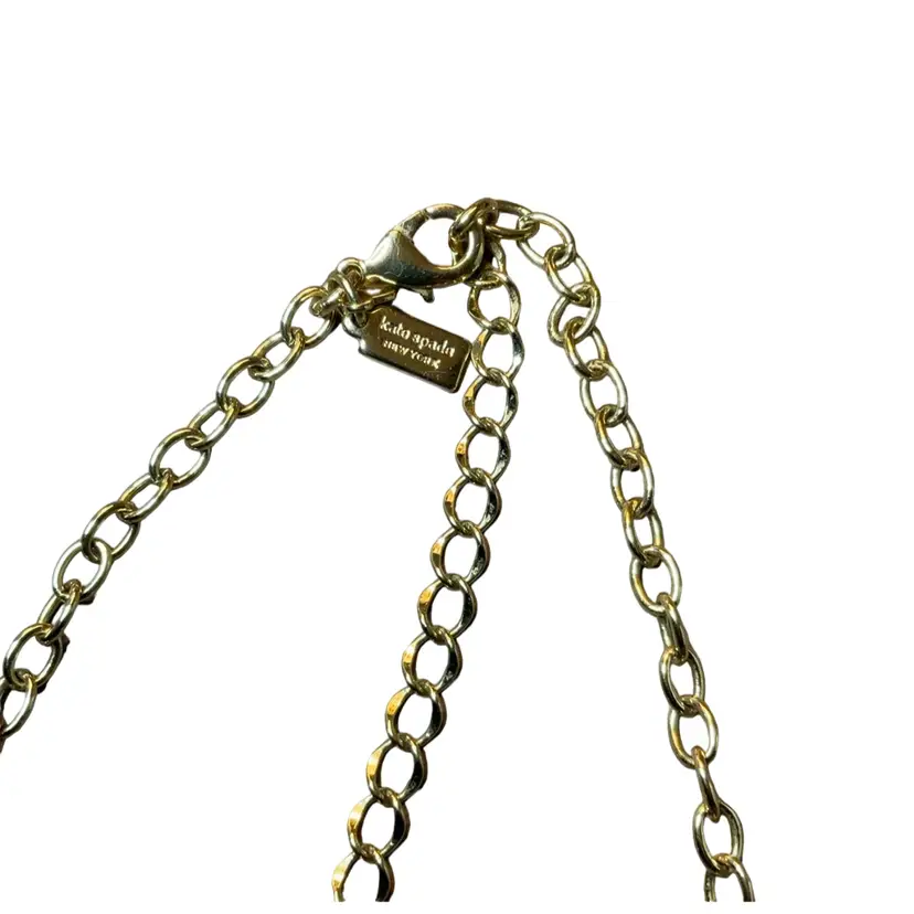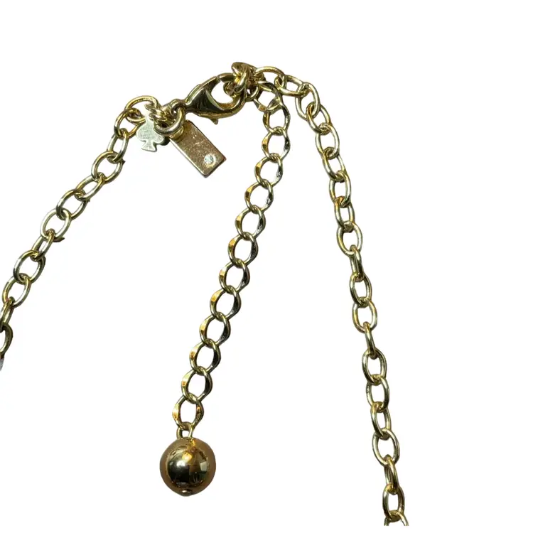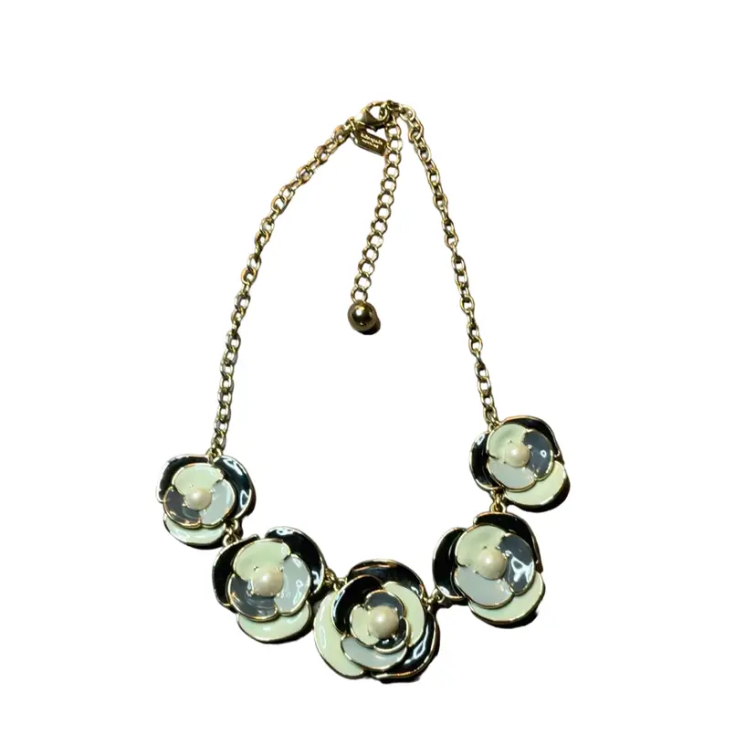 Gold tone Kate Spade deco style flower statement necklace in black enamel and different shades of ivory enamel with inlaid faux pearls.