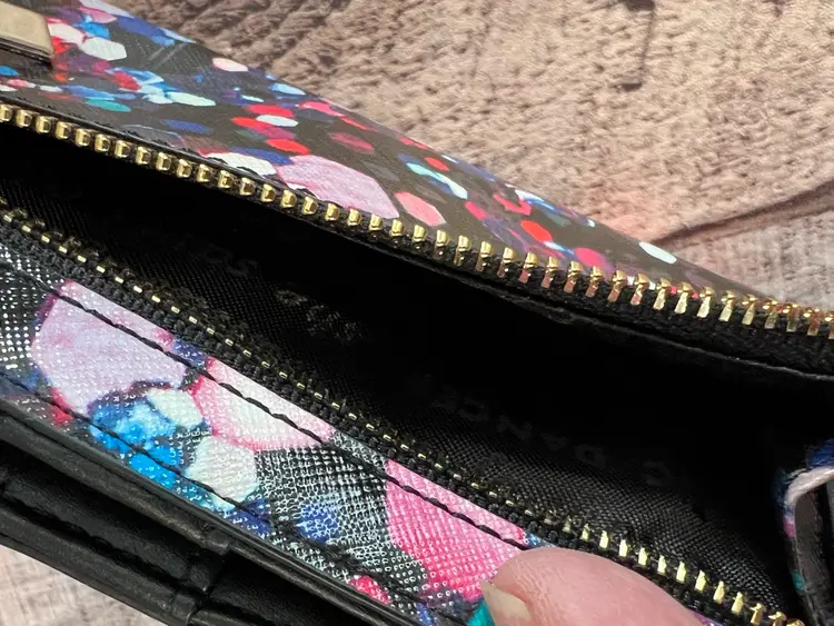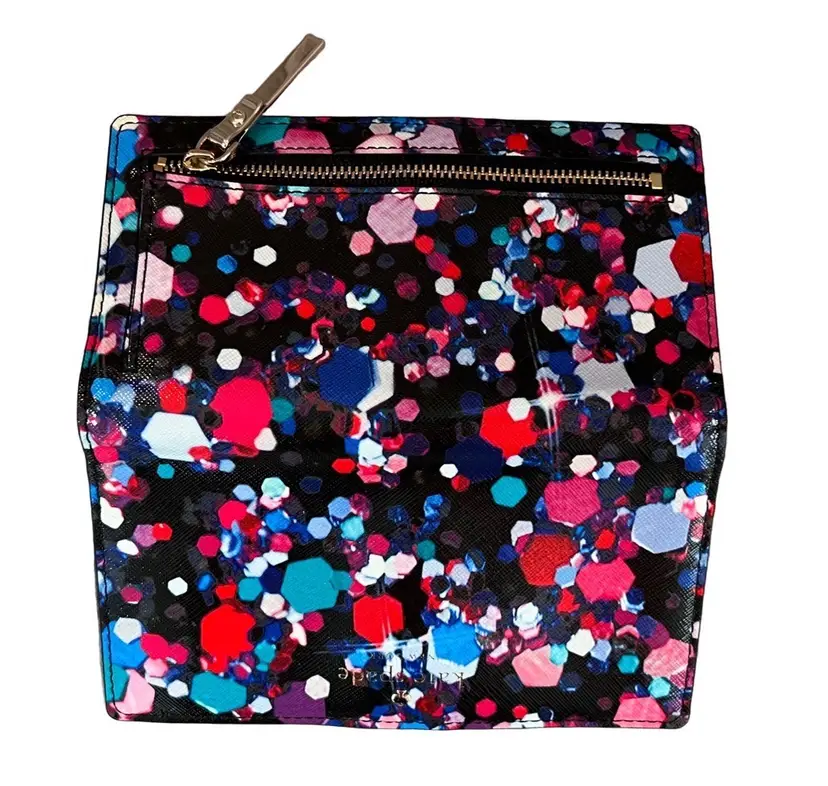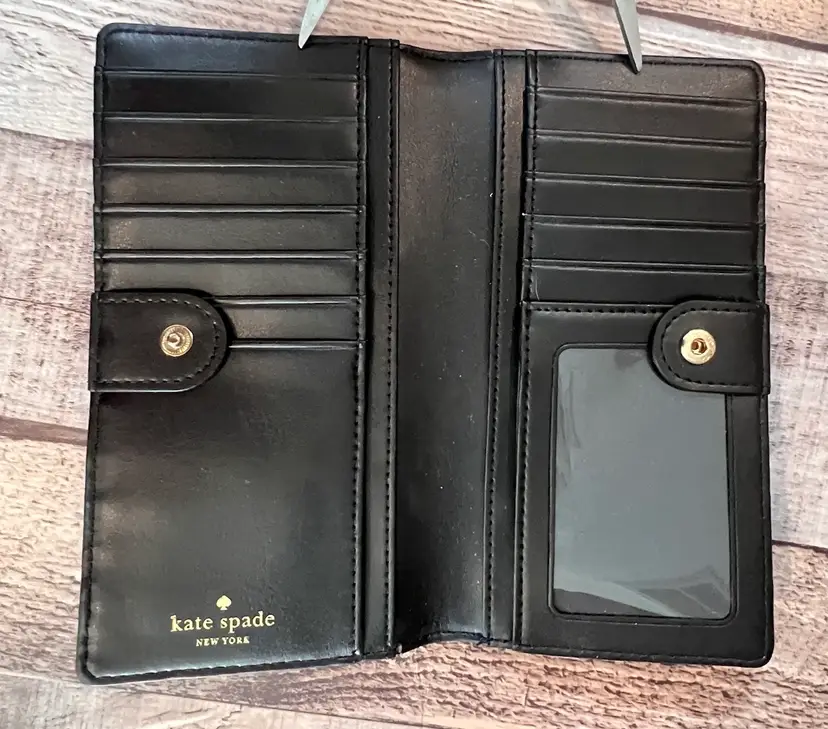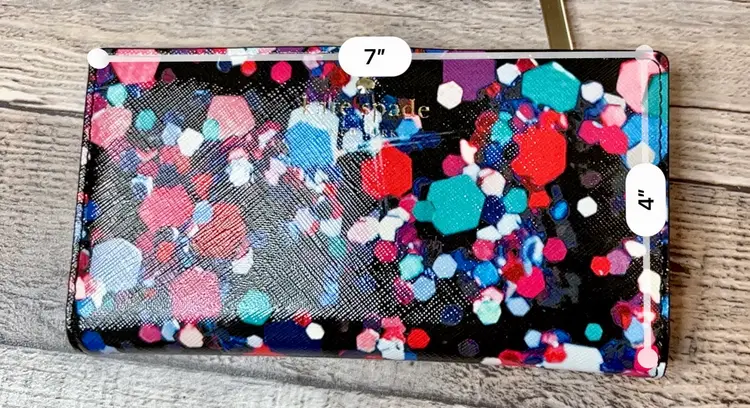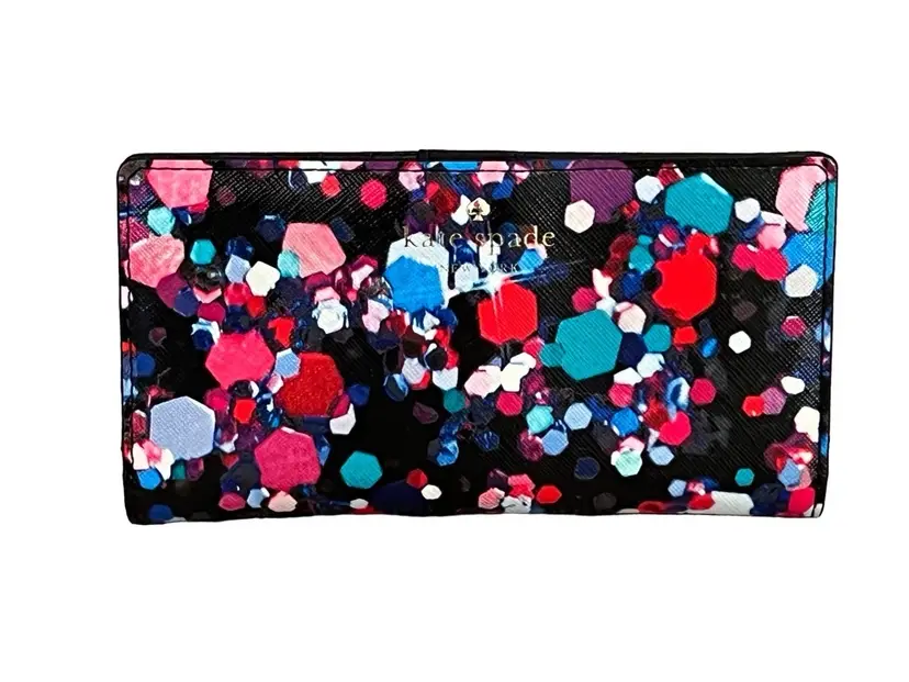 Kate Spade Grant Lane Bright Jewel Stacy Saffiano Leather Wallet Black Multi PWRU5247. FEATURES: 12 credit card slips, 4 optional currency slip pockets, zipper coin pocket, ID pocket and snap closure. Measurements approximately 4"h x 7"w × 0.75"d.