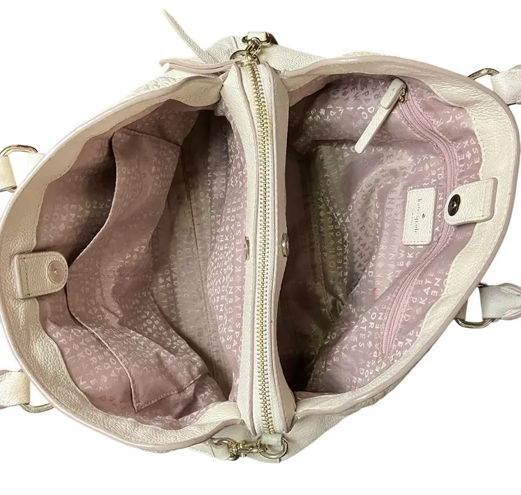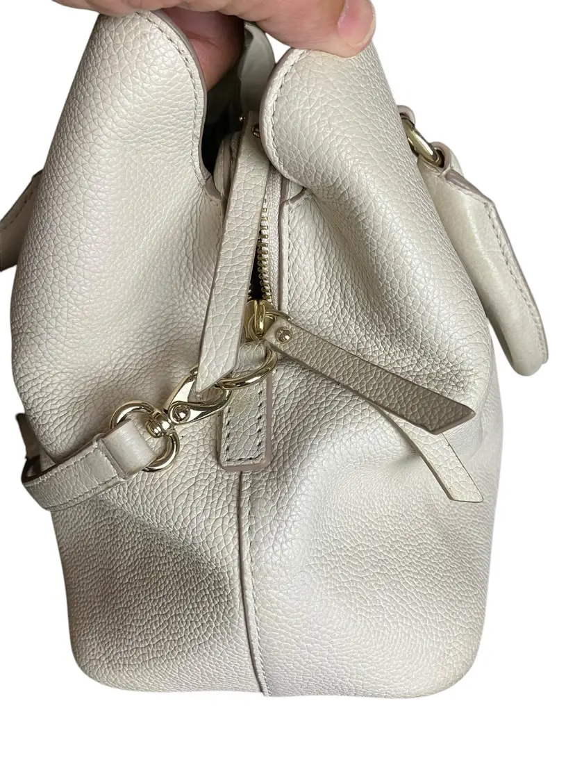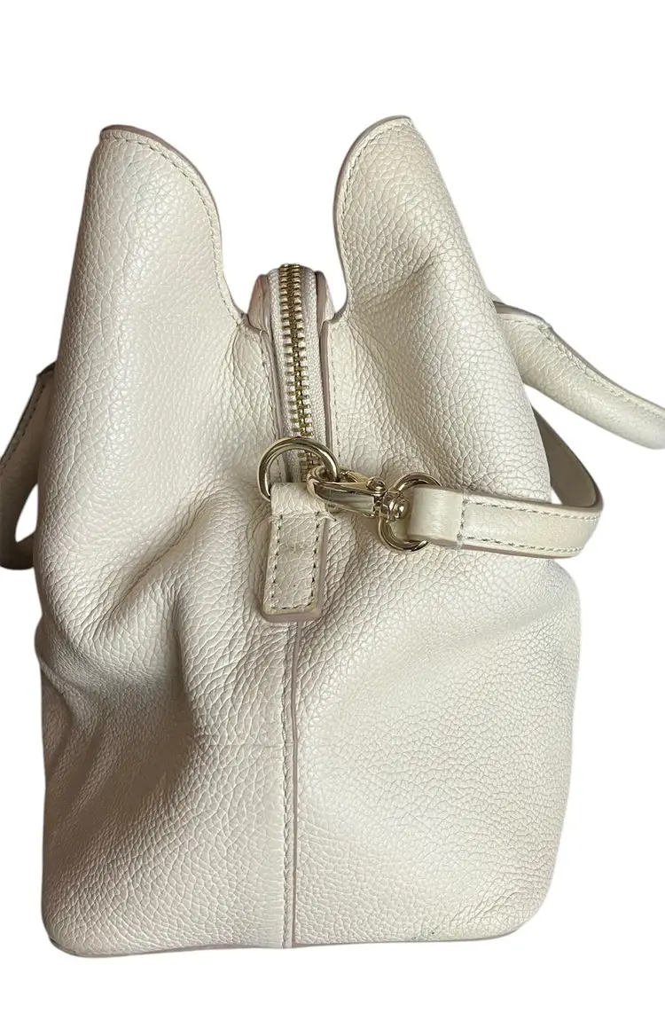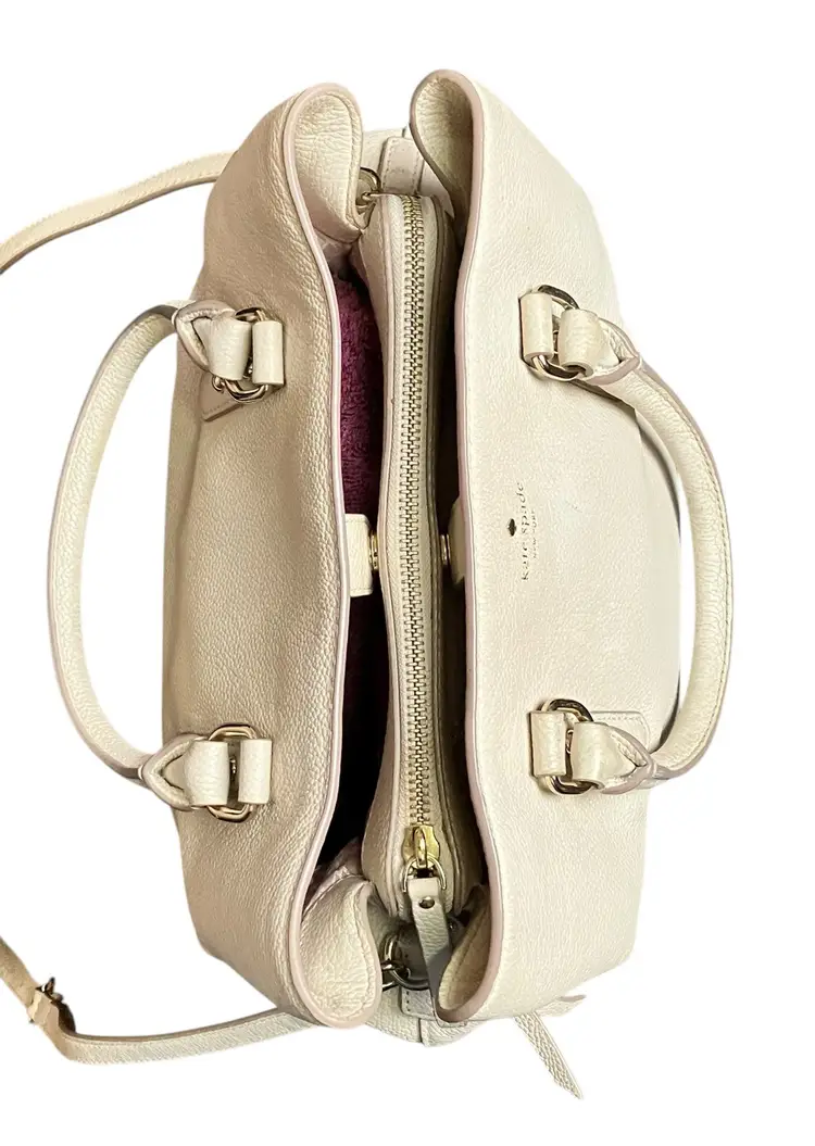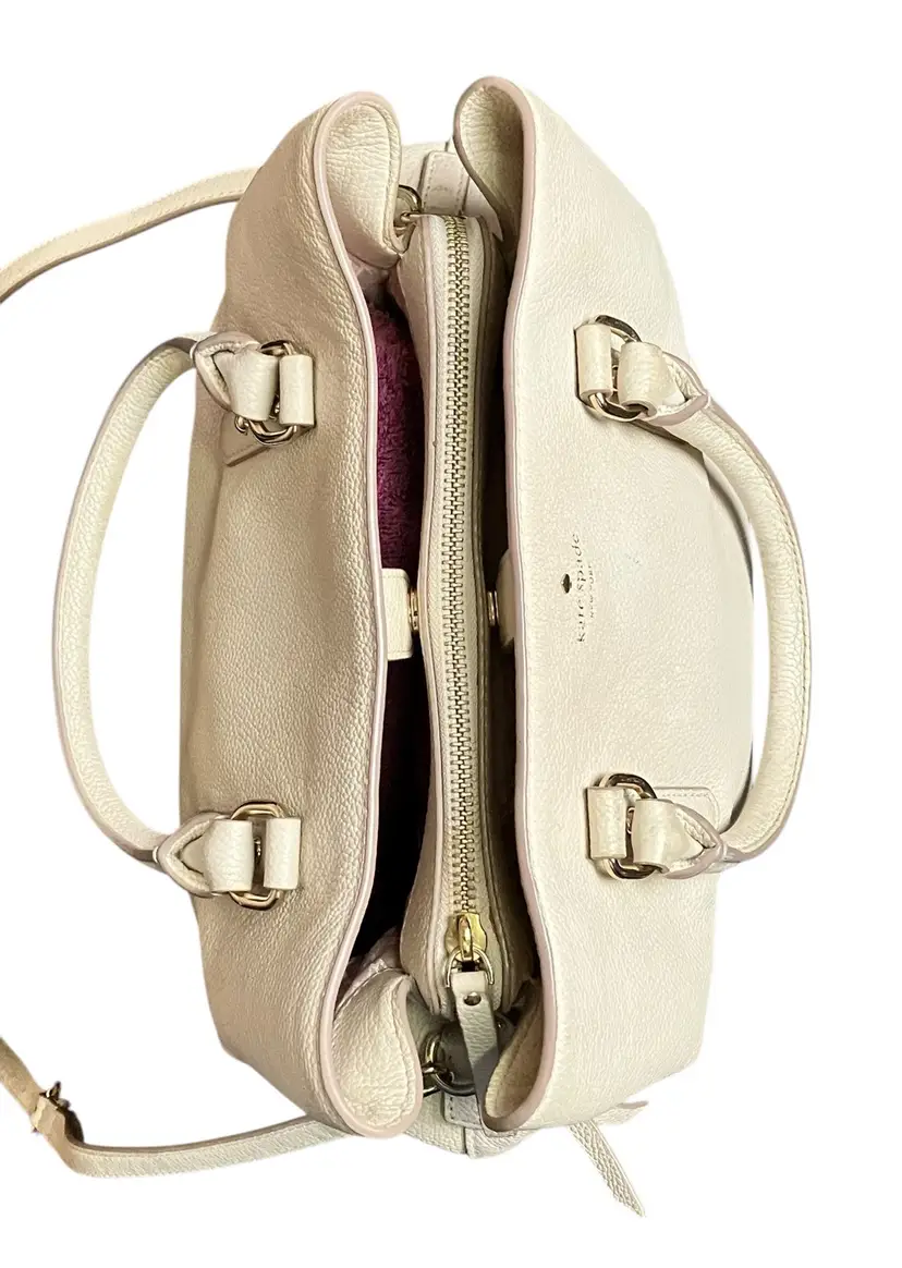 This Kate Spade New York Evangelie Larchmont Avenue satchel is a stylish and practical choice for any woman. The pebbled leather exterior material and warm vellum exterior color provide a sophisticated look that is perfect for travel or casual occasions. The bag measures 11 3/4" in width, 8" in height, and 5.5" in depth, making it a spacious option for carrying all your essentials.