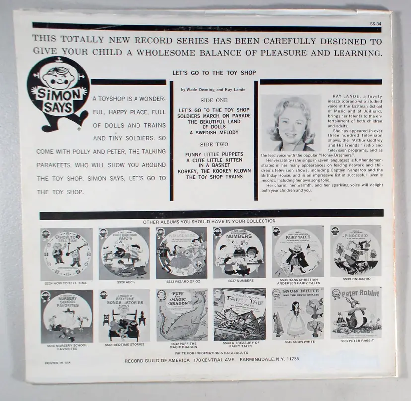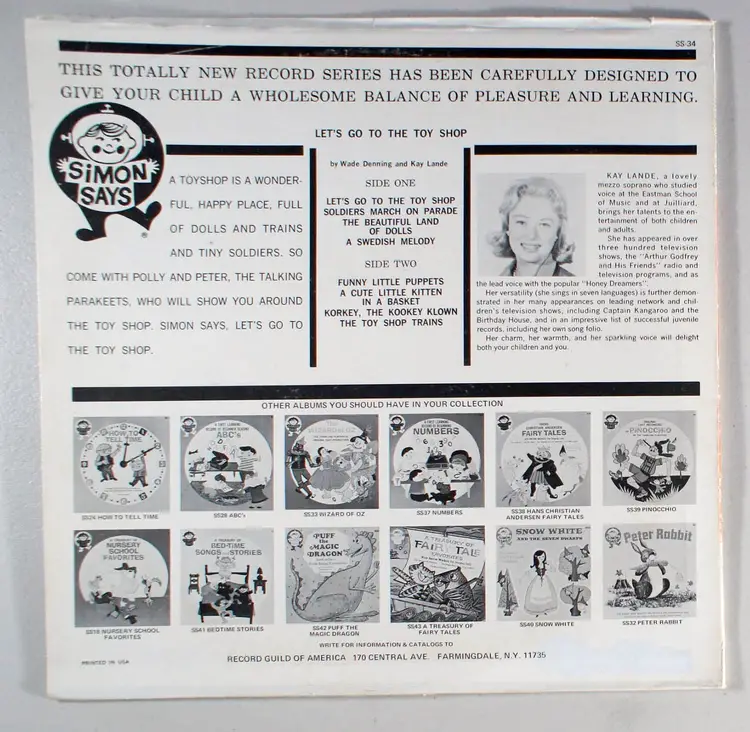 Let's Go to the Toy Shop, by Kay Lande, is a journey around the wonderful place called the toy shop full of dolls and trains and tiny soldiers. Come with Polly and Peter, the talking parakeets, who will show you around the toy shop. Simon says, "Let's go to the toy shop." Kay Lande was an American composer and singer who was best known for her compositions and performances for children, which include three operas, many songs, and appearances on television, including as co-host of the television show Birthday House.