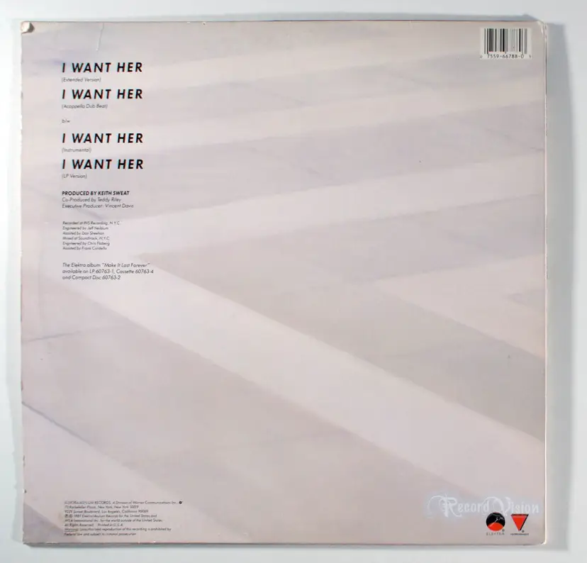I Want Her (12" Single), by Keith Sweat, released in 1987, is a pivotal release in the New Jack Swing genre, blending R&B, soul, and hip-hop elements that defined late 1980s urban music. The title track, I Want Her, became a breakout hit, reaching No. 5 on the Billboard Hot 100 and No. 1 on the Billboard R&B chart, establishing Sweat as a leading figure in the genre. The single’s infectious rhythm and Sweat’s smooth vocals resonated with audiences, making it a staple in R&B history. The album, primarily a single release with remixes, showcased production by Teddy Riley, whose innovative sound shaped the New Jack Swing movement. Its success helped pave the way for Sweat’s debut album, Make It Last Forever, further cementing his influence in R&B.