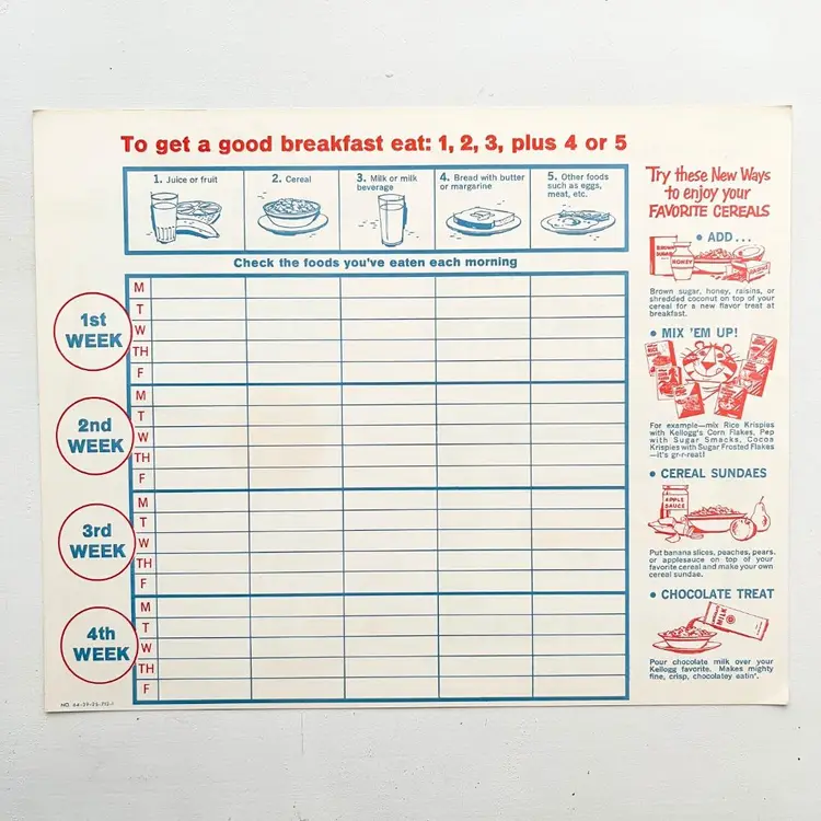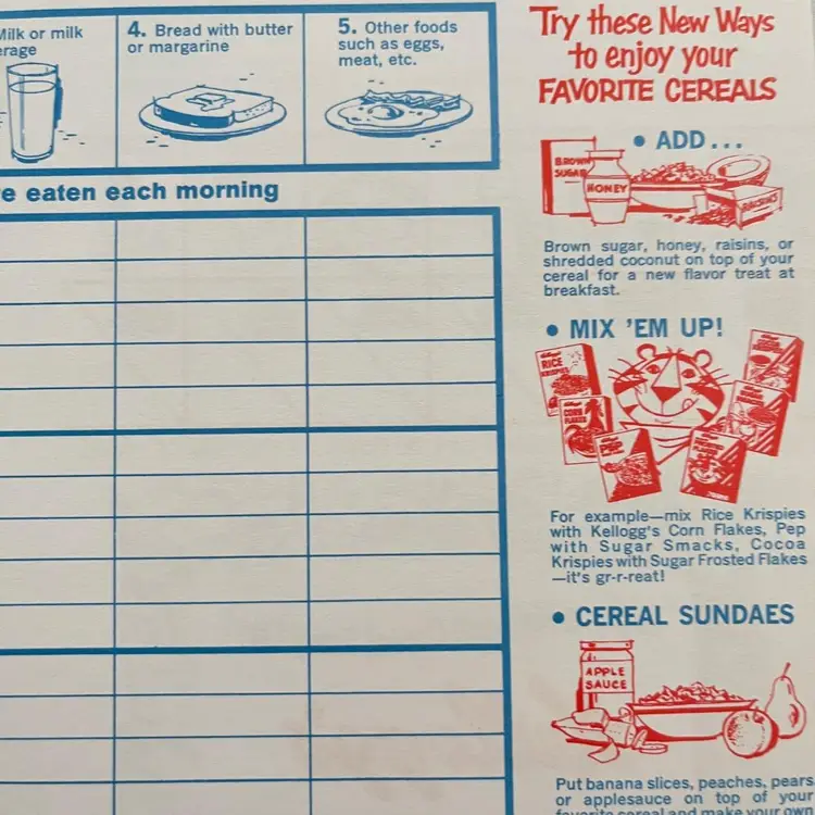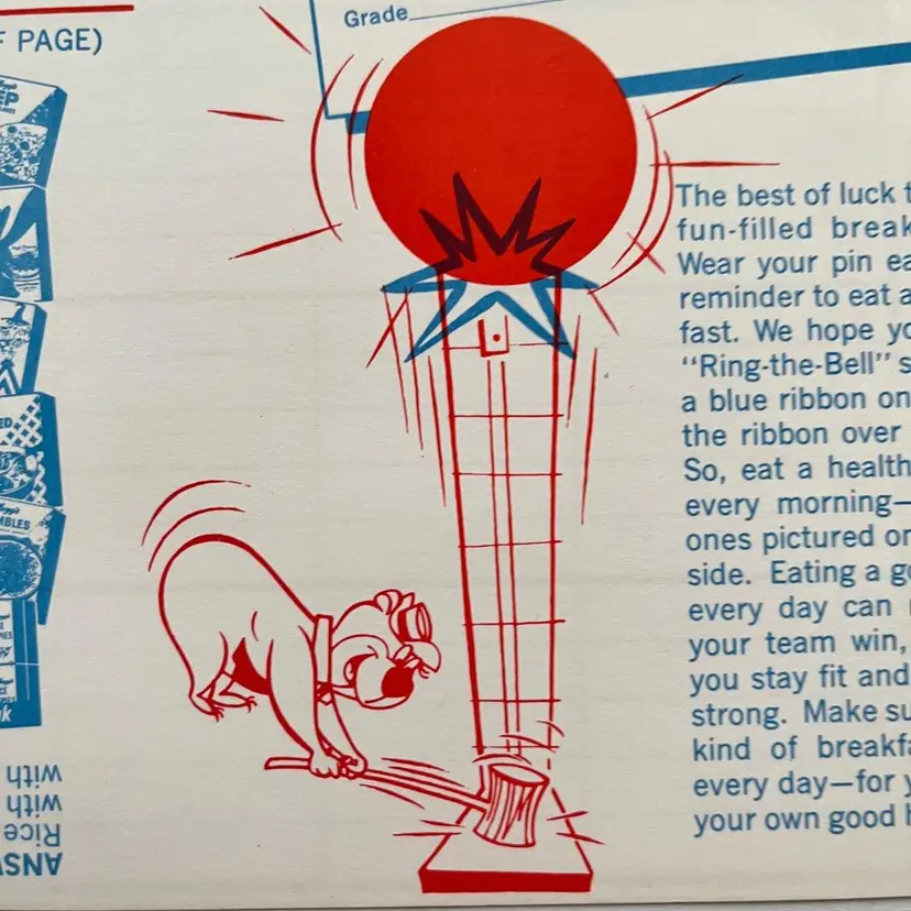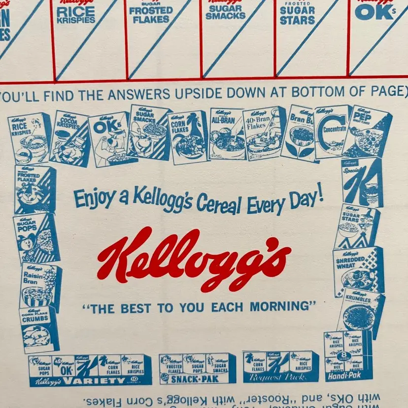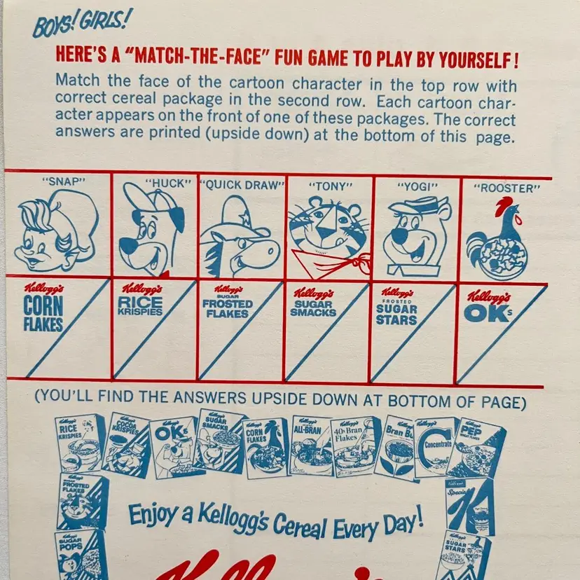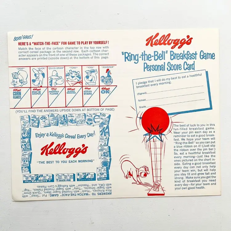 Kellogg's Cereal Game Scorecard Cartoon Characters Advertising Vintage 1960s Kellogg's "Ring-The-Bell" Breakfast Game Personal Score Card Match-the-Face Fun Game for Boys and Girls with a Reminder to Eat Good Healthy Breakfast Foods Every Morning to Stay Fit and Grow Tall and Strong Advertising Kellogg's Corn Flakes, Kellogg's Rice Krispies, Kellogg's Frosted Flakes, Kellogg's Sugar Smacks, Kellogg's Sugar Stars and Kellogg's OKs Cartoon Characters: Snap From Snap, Crackle and Pop, Huckleberry Hound, Quick Draw McGraw, Tony the Tiger, Yogi Bear and the Kellogg's Rooster Game Piece from Hanna Barbera Board Game Condition: Wear on the corners. Pin and ribbon mentioned on the card are not included. Measures 8 inches x 10 inches Packaged in a plastic sleeve inside a rigid envelope Visit my store to see more vintage ephemera, advertising, novelties, gifts, estate sale and yard sale finds https://district.net/u/finderspickerspaper SKU B32