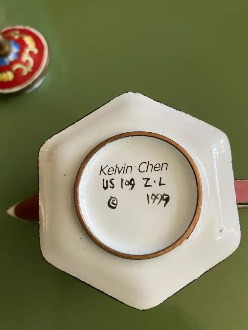 The teapot is marked US 109, with the year 1999 and the Kelvin Chen name. Just under 4” tall. This teapot is in very good vintage condition.
