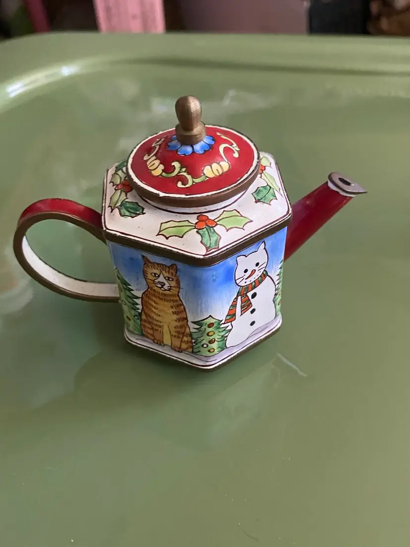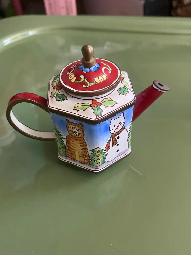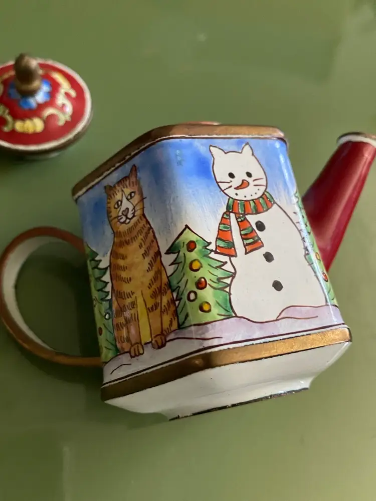 This unique Kelvin Chen miniature teapot features a charming snow cat, a pretty tabby cat and some Christmas trees. Crafted with glazed enamel on brass, this art piece is a perfect addition to any collection.