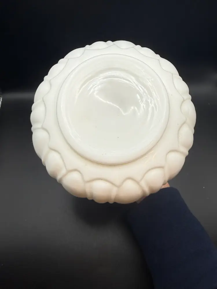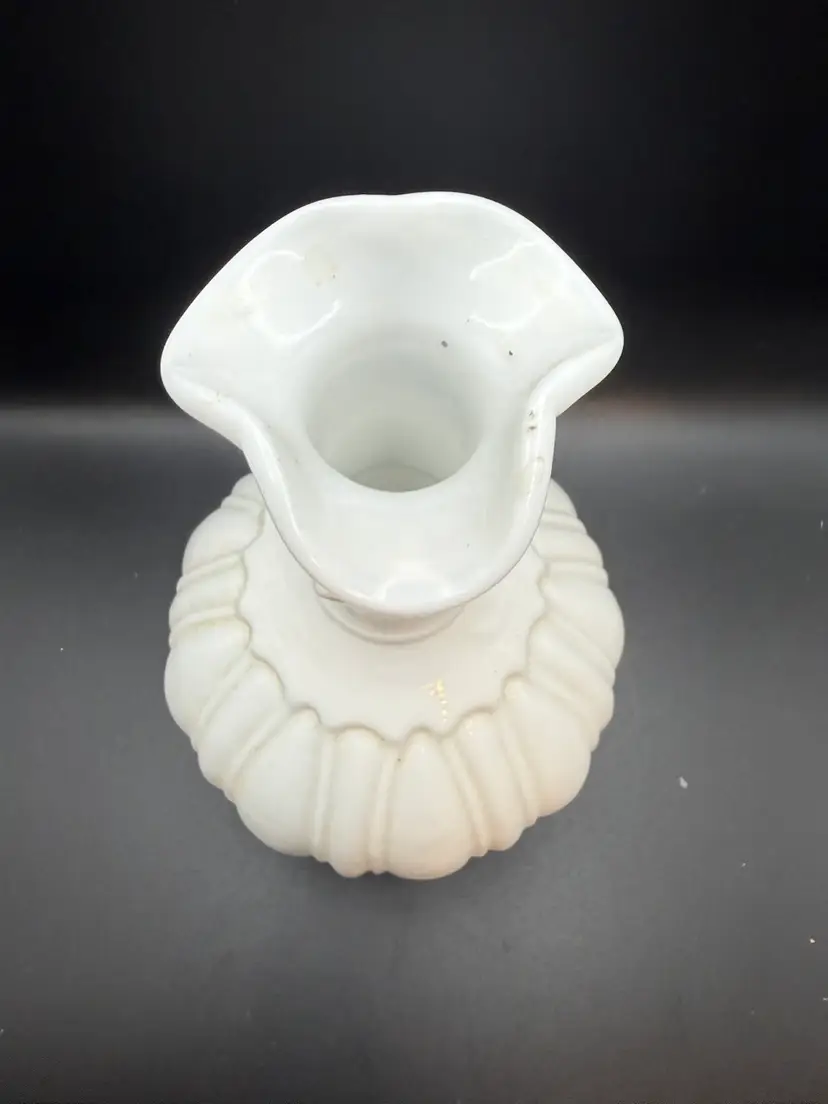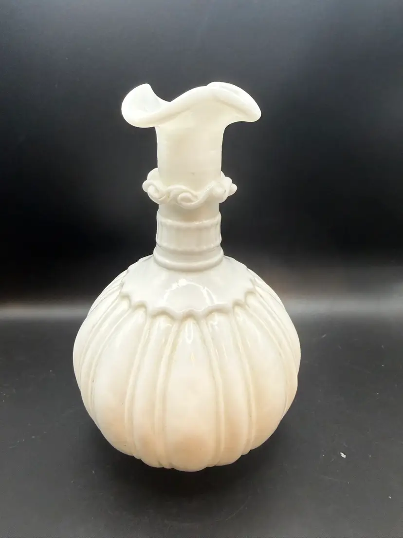 This 8.5 in tall milk glass decanter has a melon base with designs around the neck. It is missing its stopper but is a stunning piece that can be used as a vase.