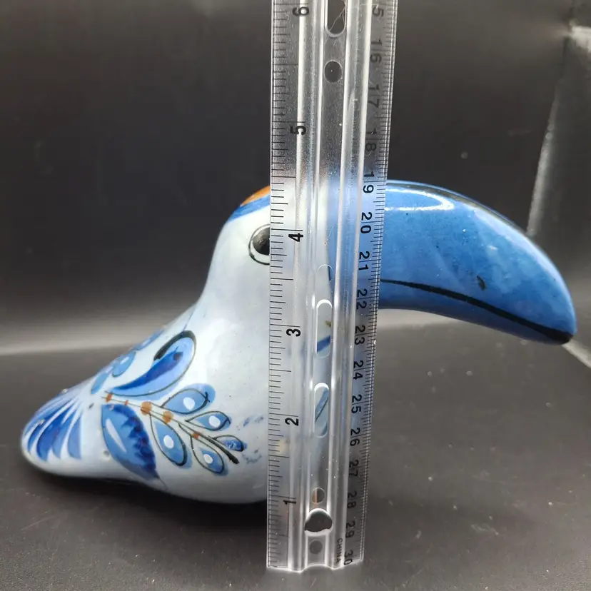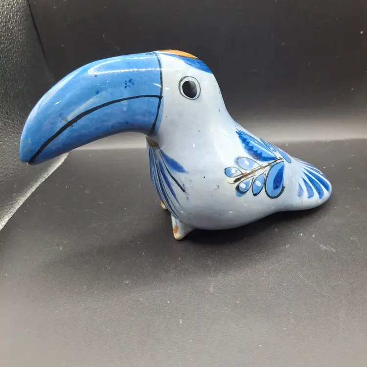 In the heart of a vibrant forest, a toucan sits perched, its ceramic form capturing the grace of nature. Crafted with meticulous detail, this hand-painted figure showcases swirling blue and white hues, echoing the tones of tranquil skies and whispering leaves. Its floral embellishments tell tales of blooms and breezes.