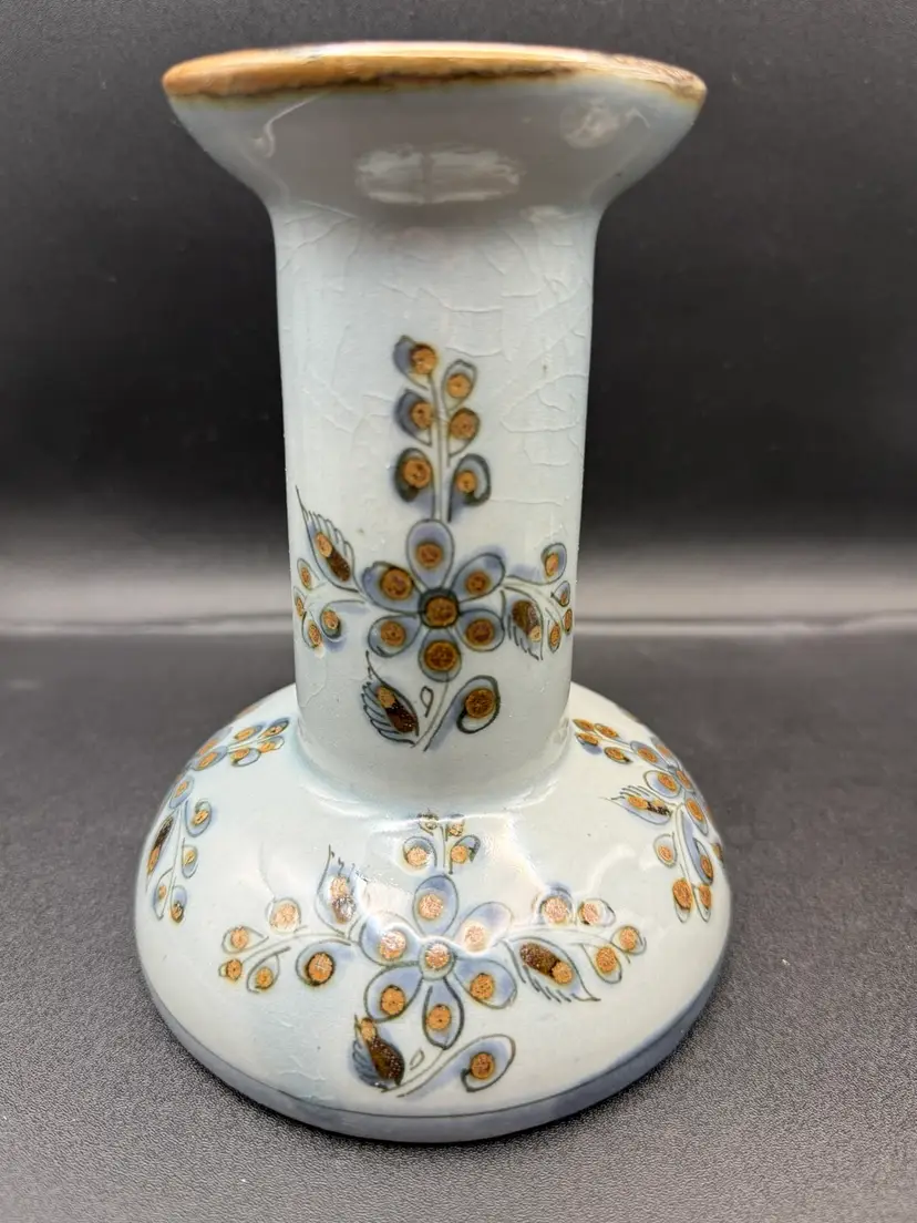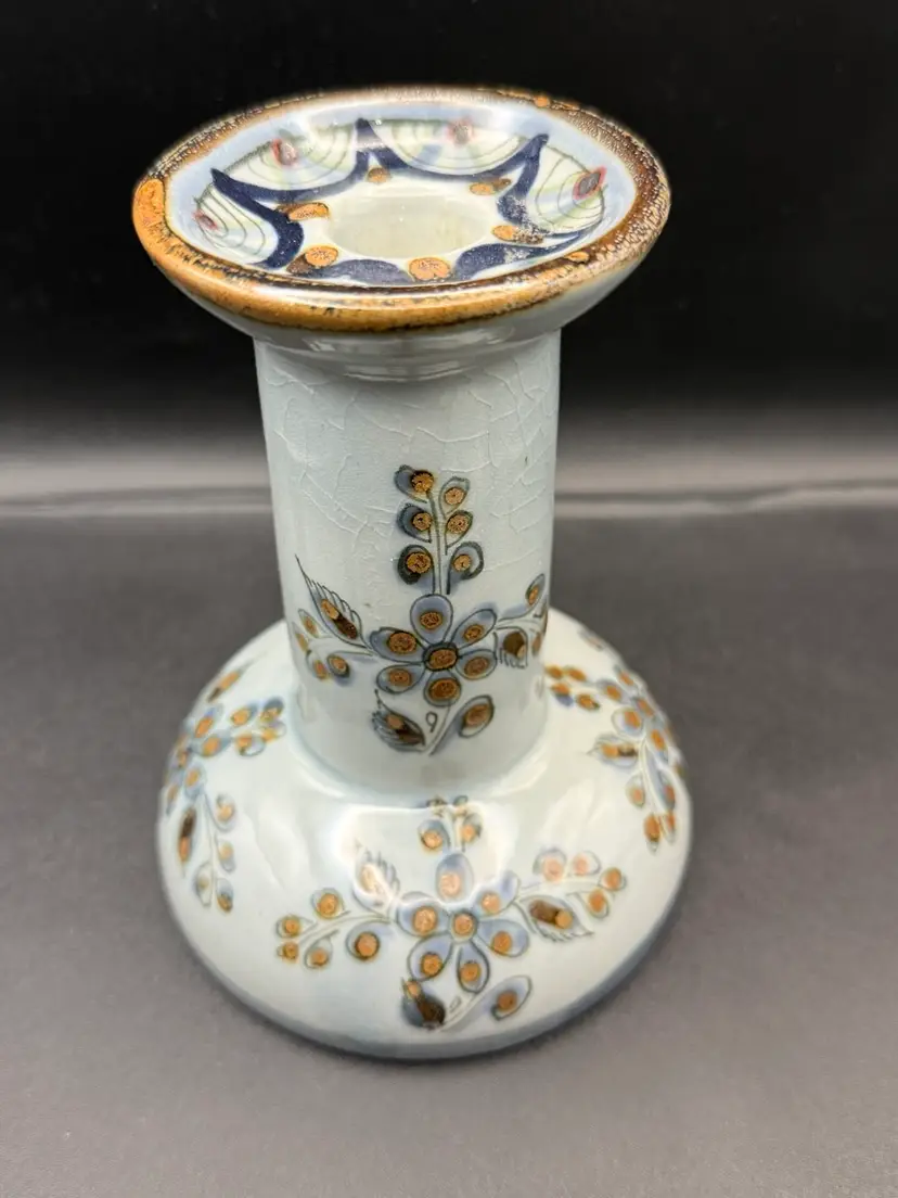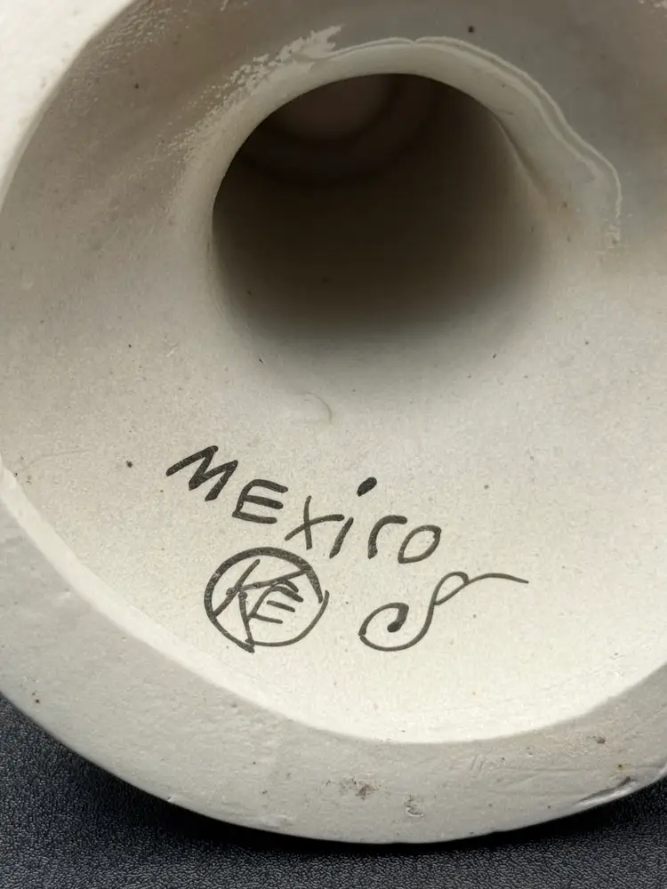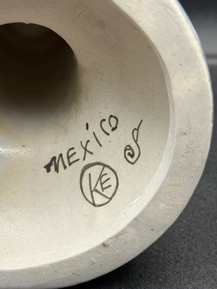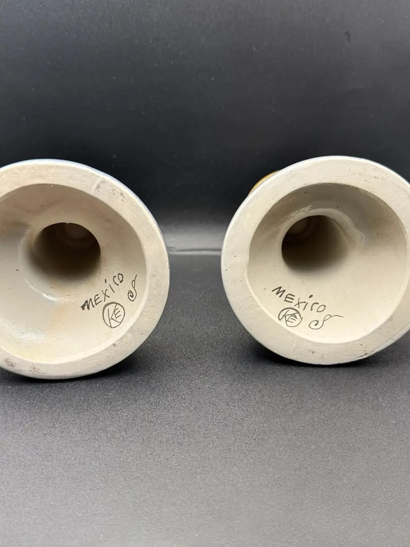 Signed KE Mexican pottery candleholders Great to add to your collection No chips or cracks, but there is a little crazing, design, and color differences due to handmade nature. 6” tall and 5” base diameter
