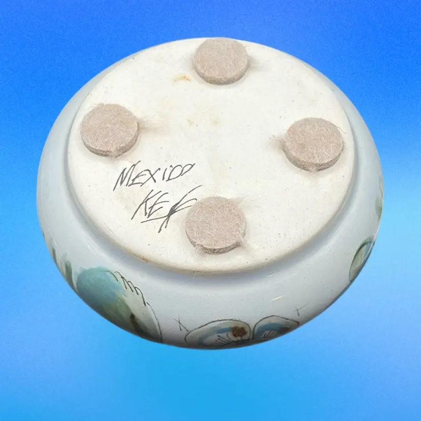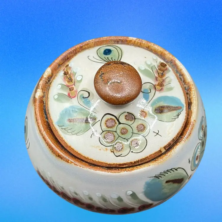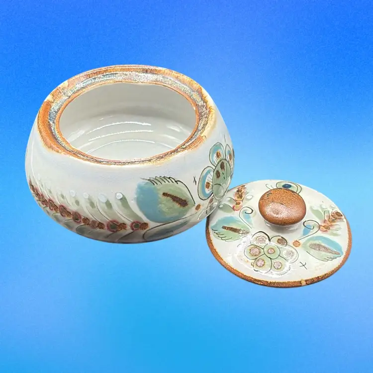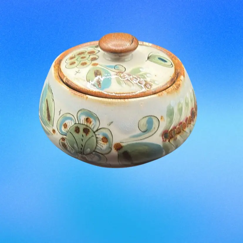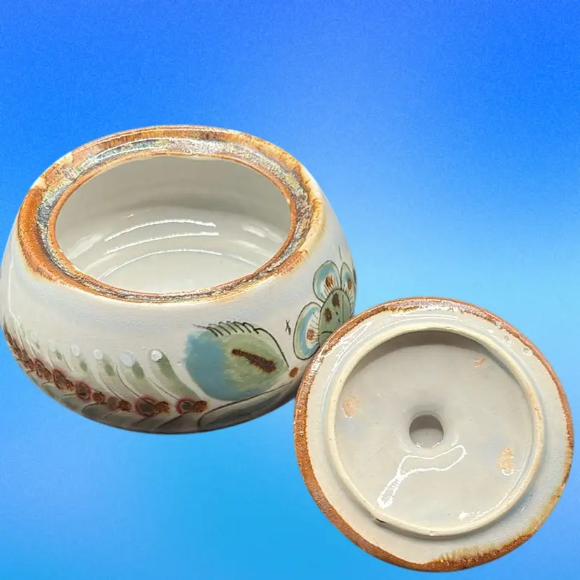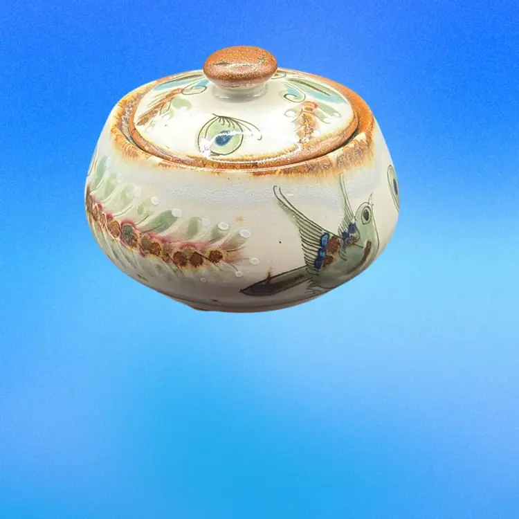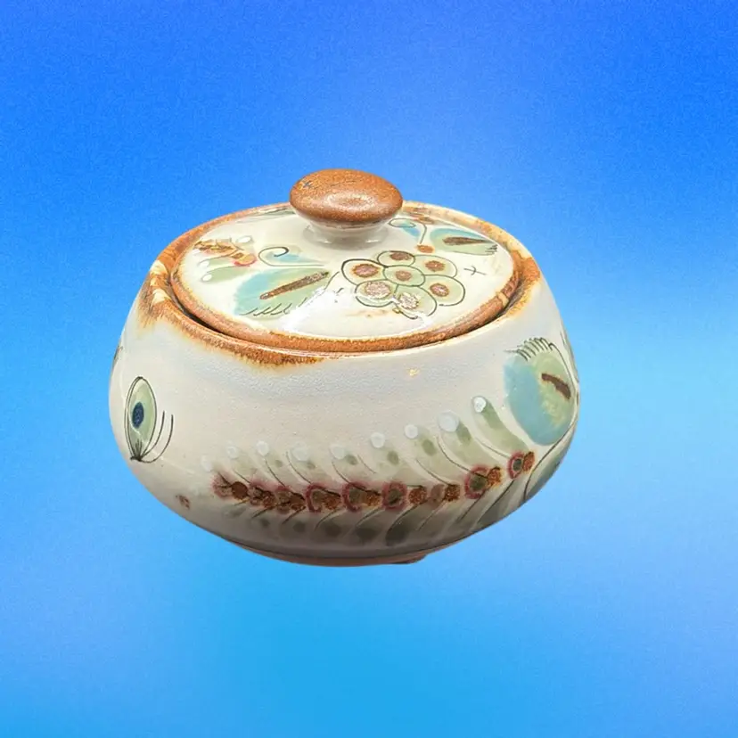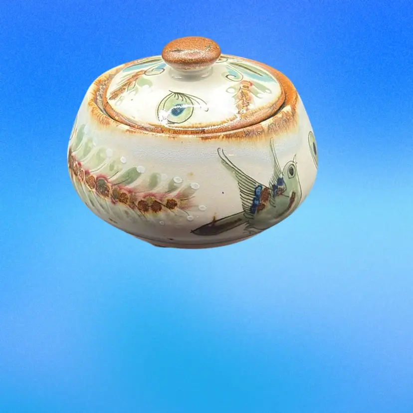 Beautiful covered bowl with unique design with bird, butterflies and florals in blues, greens and brown. Used condition. See photos
