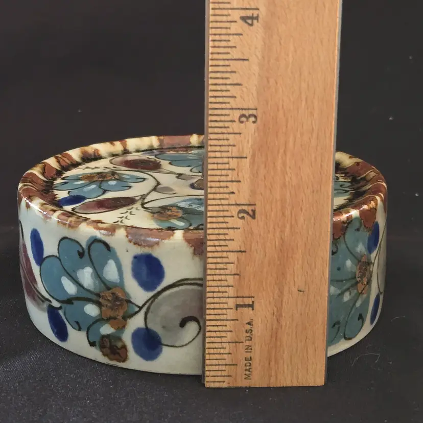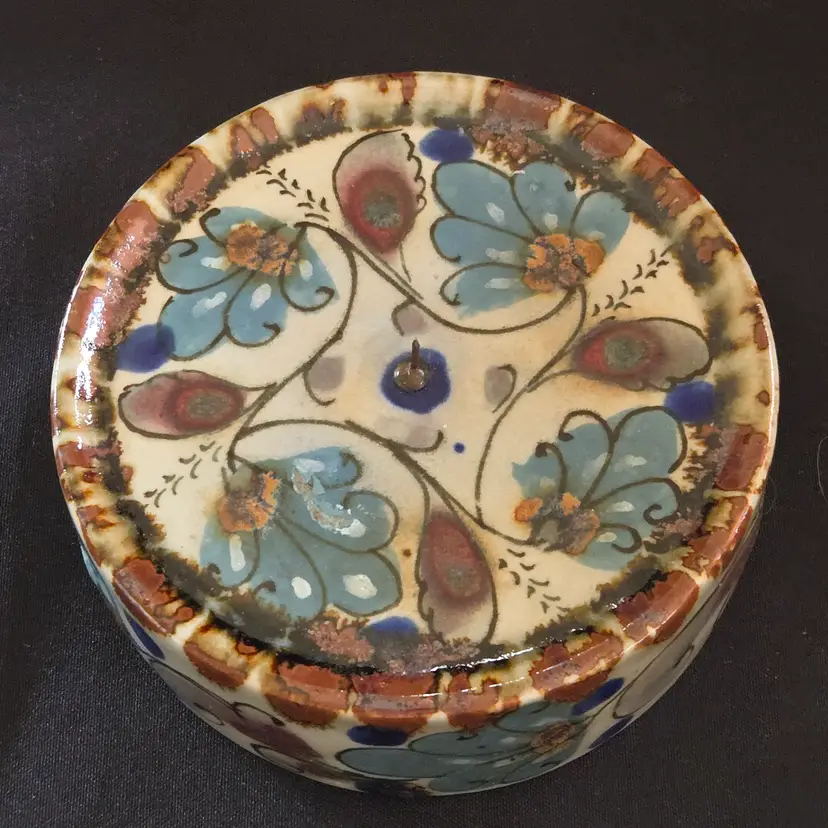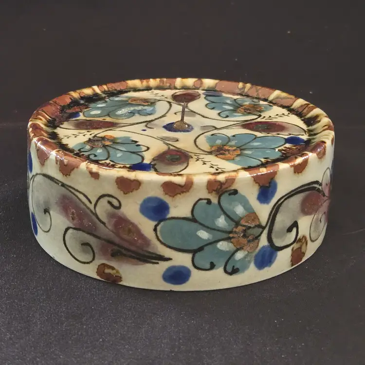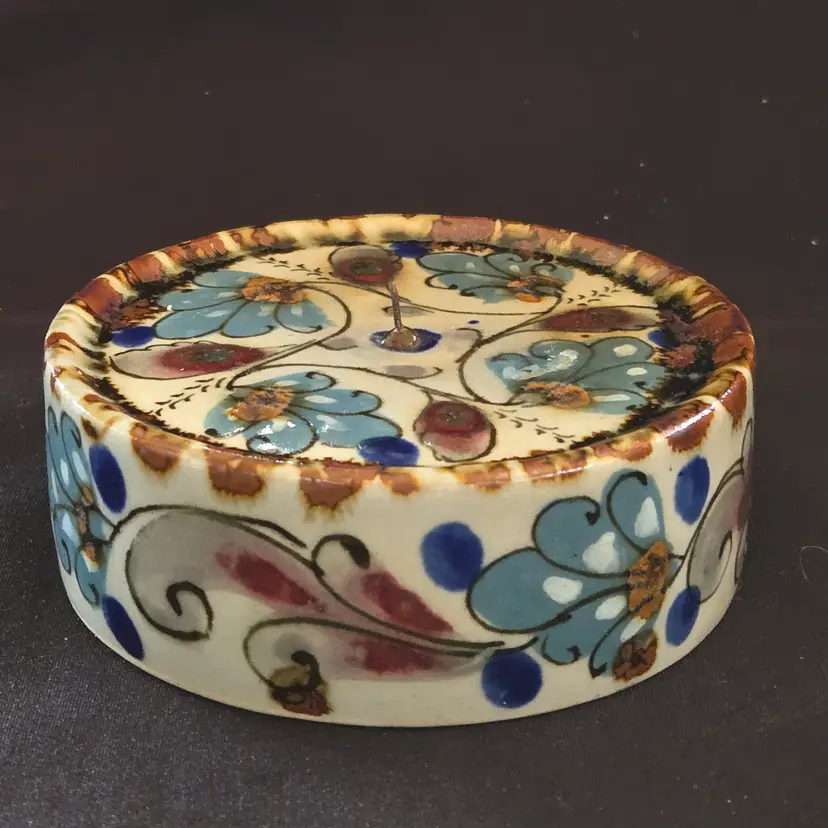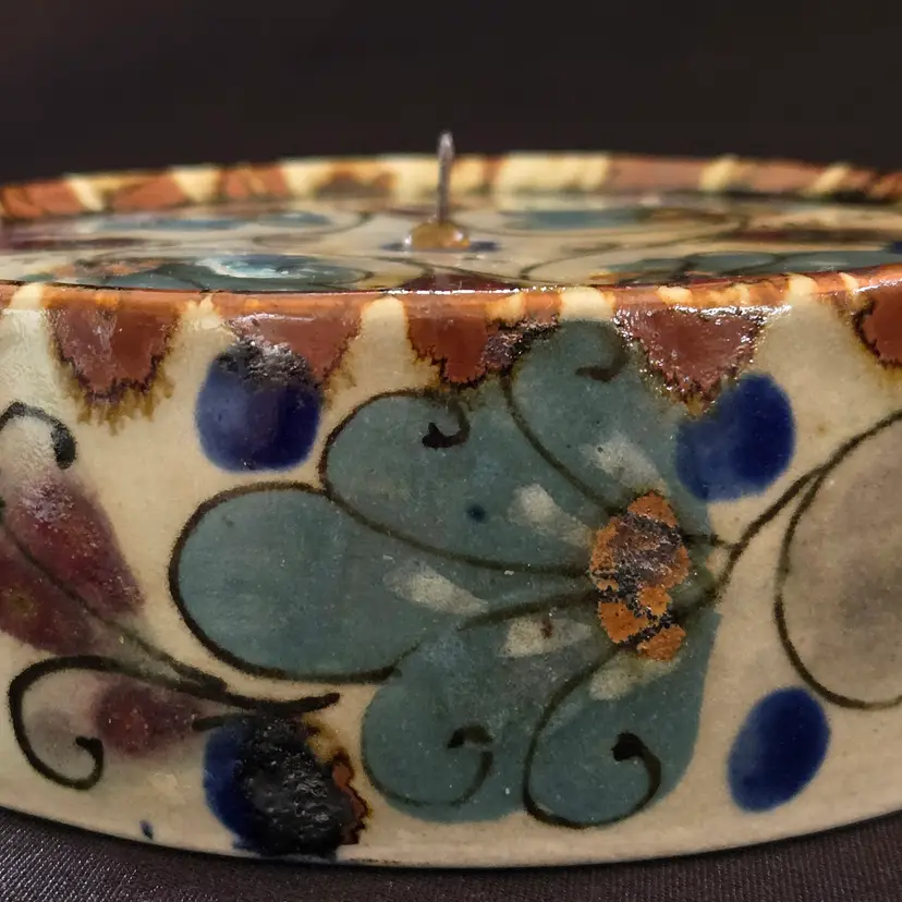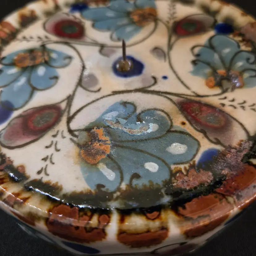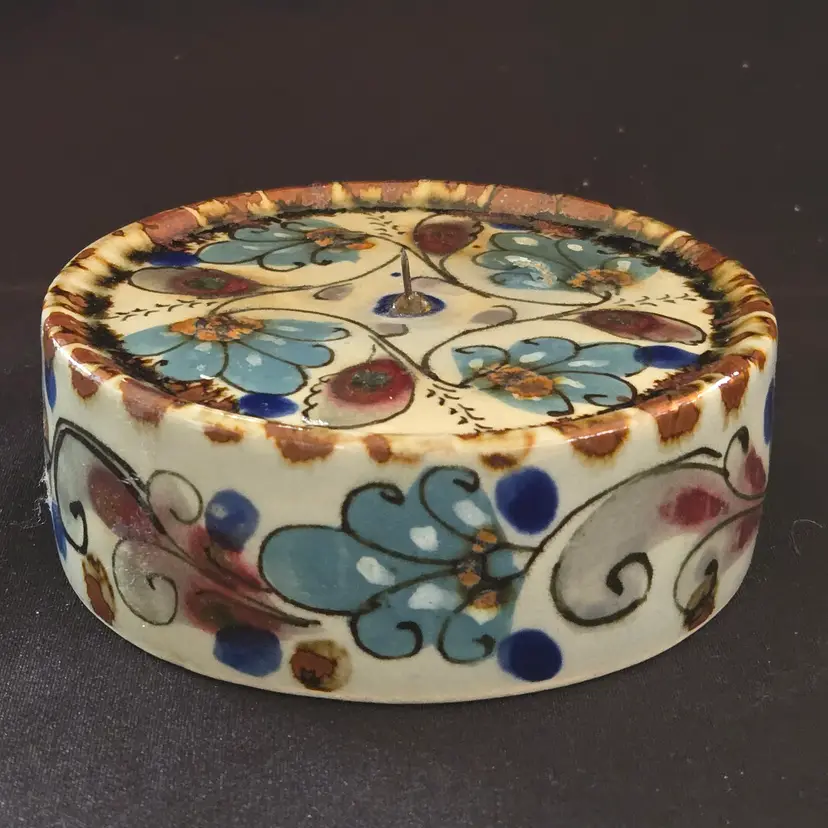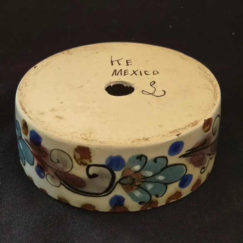 Vintage Ken Edwards Mexican Pillar Candle Holder Hand Painted 4 3/8" diameter approximately Signed. Used condition with wax remnants, a chip (or perhaps a large bubble pop) within the glaze in the top, sharp nail for holding candle in place. Please view all photos as they are part of the description and please ask questions prior to purchase when possible.