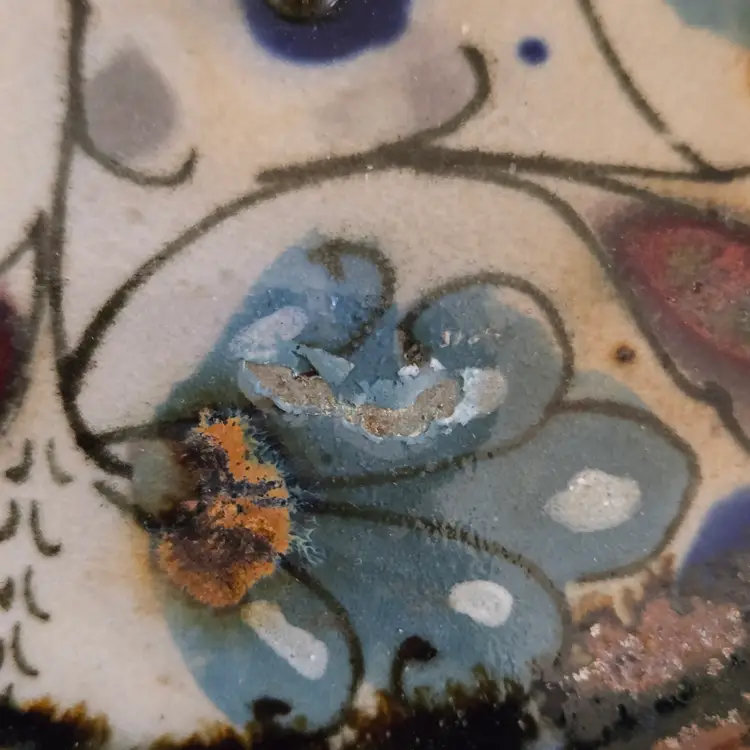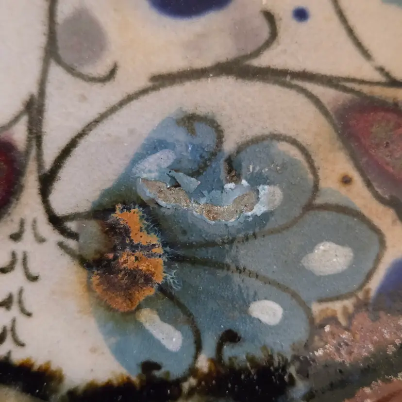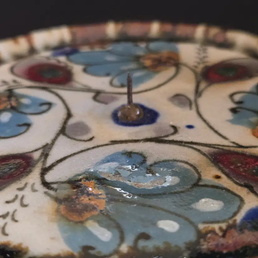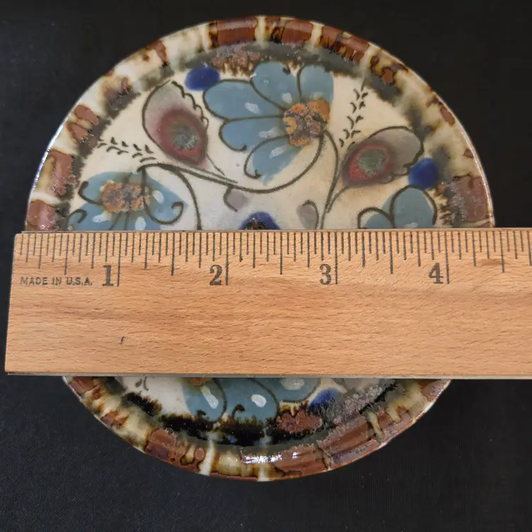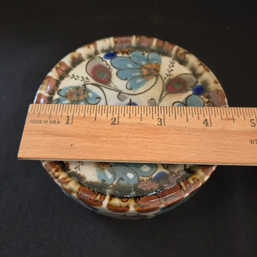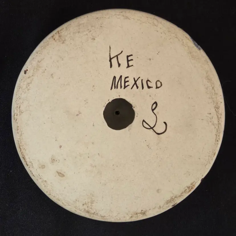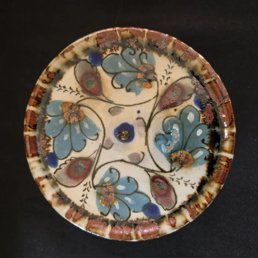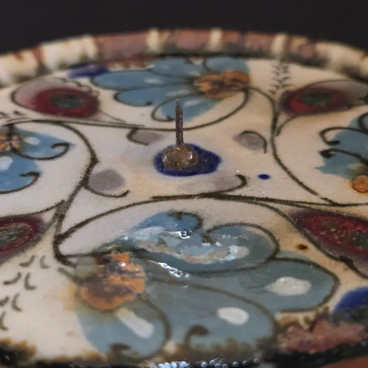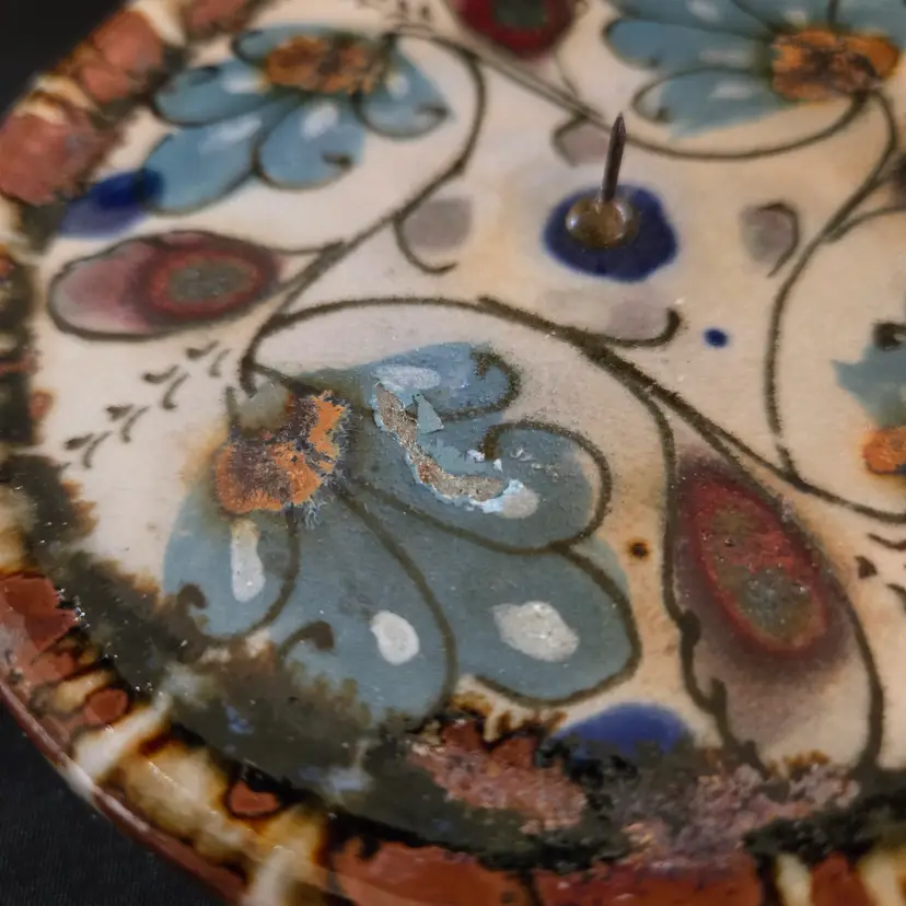 Vintage Ken Edwards Mexican Pillar Candle Holder Hand Painted 4 3/8" diameter approximately Signed. Used condition with wax remnants, a chip (or perhaps a large bubble pop) within the glaze in the top, sharp nail for holding candle in place. Please view all photos as they are part of the description and please ask questions prior to purchase when possible.