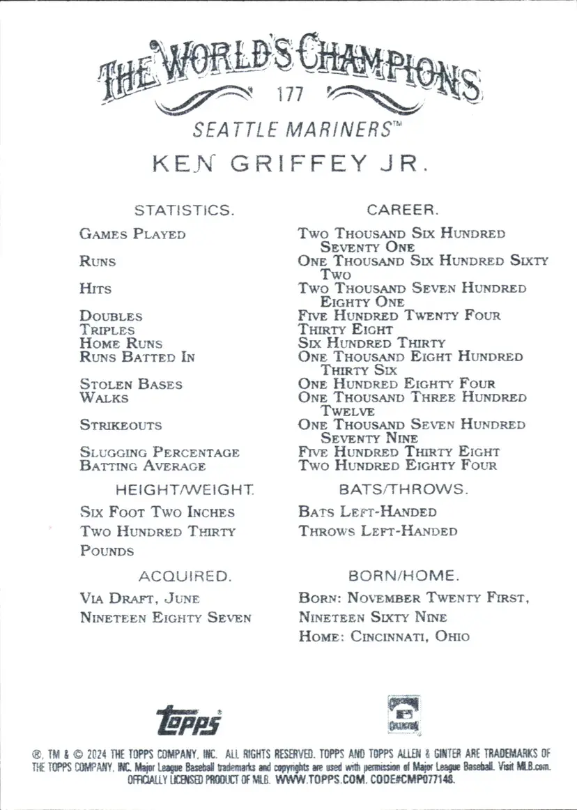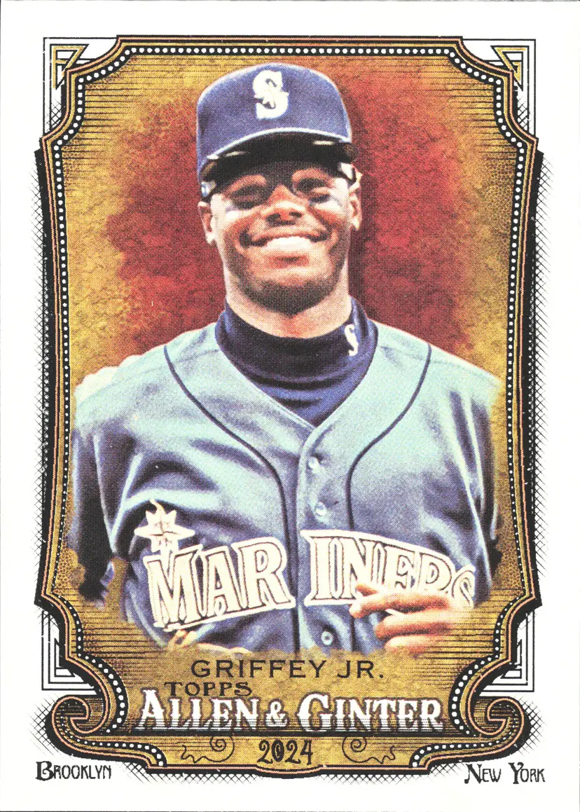 1st time buyer? Get $5 Off with code DISTRICT5 at checkout! Card as shown. All cards $20 and under ship PWE via lettertrackpro [https://www.letter-track.com/registerap.asp?AFID=8757] Player/Athlete: Ken Griffey Jr Manufacturer: Topps Team: Seattle Mariners Features: Base Set Type: Sports Trading Card Sport: Baseball Season: 2024 Autographed: No Year Manufactured: 2024 Event/Tournament: MLB World Series Vintage: No Card Thickness: 20 Pt. League: Major League (MLB) Material: Card Stock Original/Licensed Reprint: Original Card Number: 177 Country/Region of Manufacture: United States