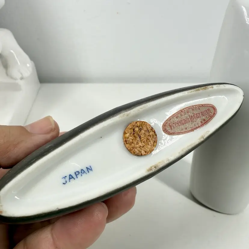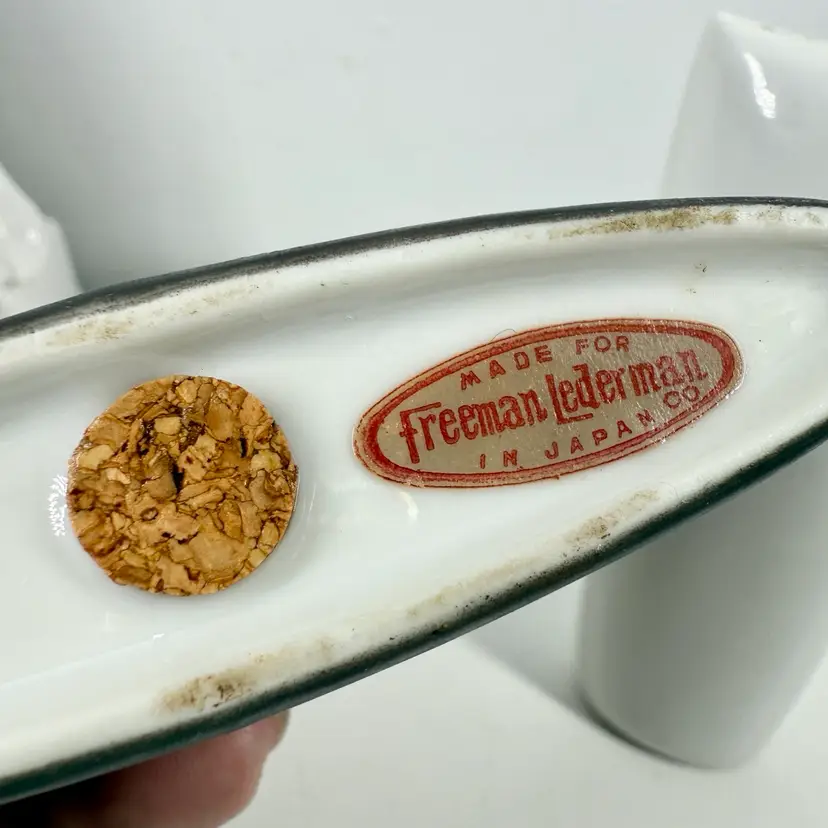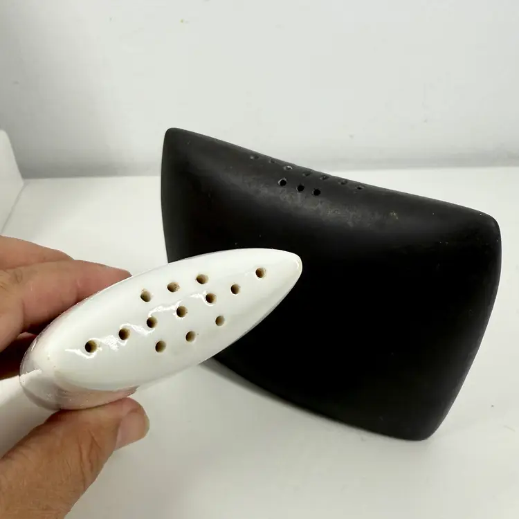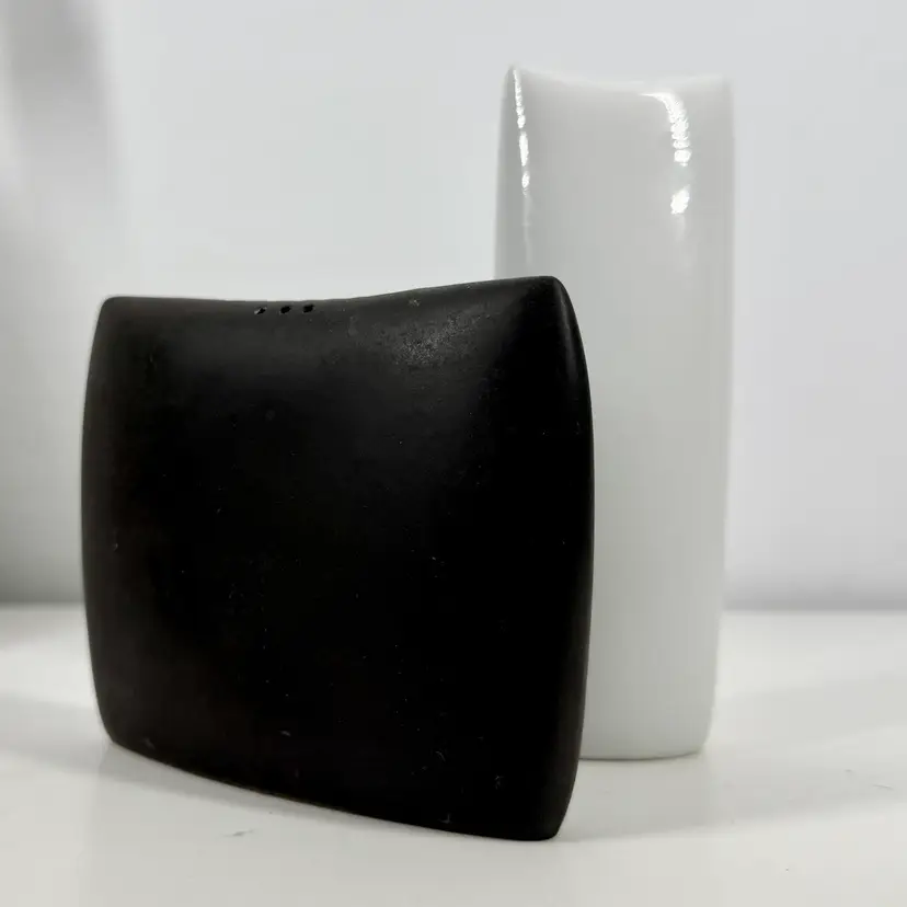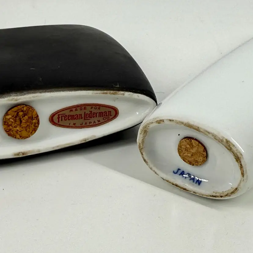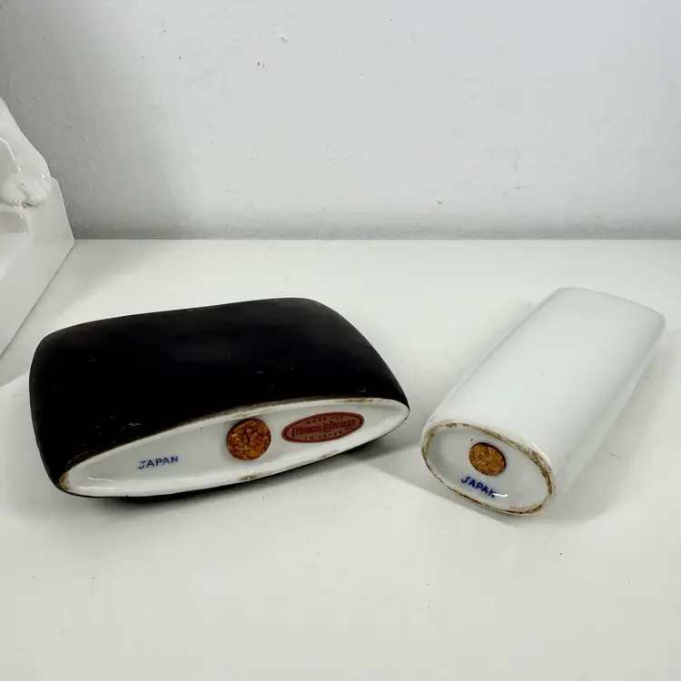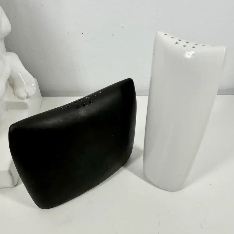 Hi... These iconic Kenji Fujita pair of S/P shakers are an original Mid-Century Modern set imported by Freeman Lederman. The organic forms and abstract design make it a unique piece for any MCM collection. Handmade in the mid to late 50s, this vintage set features the earlier matte black and glossy white finish combination, adding to their rareness. With its sculptural lines and art pottery production style, these shakers with their original cork stoppers are a stylish and functional addition to your kitchen collection or dining room decor.
